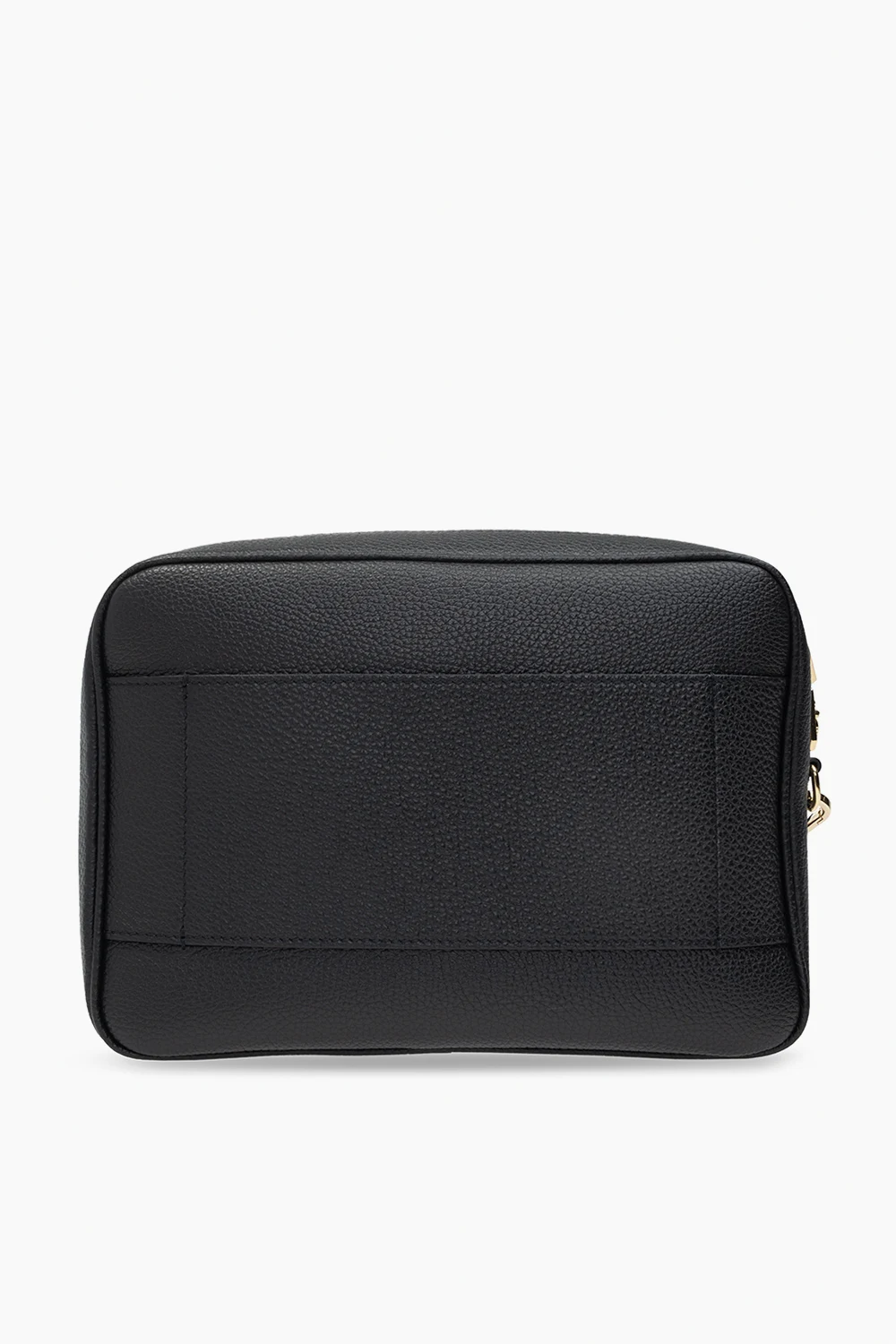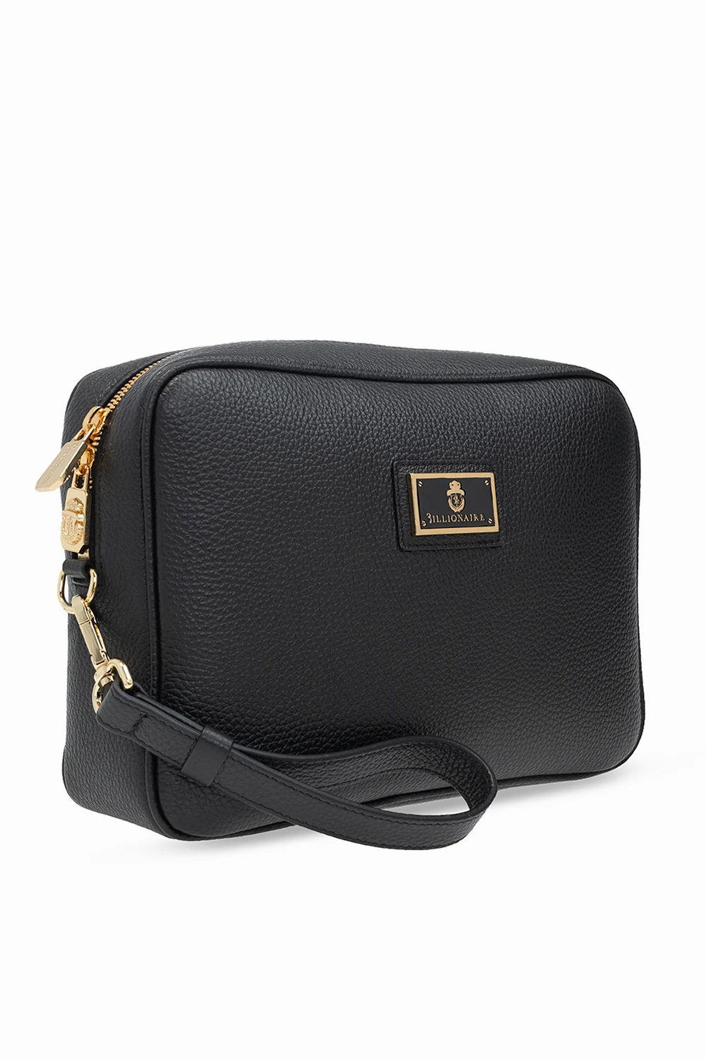 Black wash bag from Billionaire. Crafted from grained calf leather, this item fastens with a two-way zip and is decorated with a metal logo appliqué. It is complete with a back slip pocket, wrist strap, gold-tone metal hardware and one internal compartment with navy lining, one zip pocket and one slip pocket.