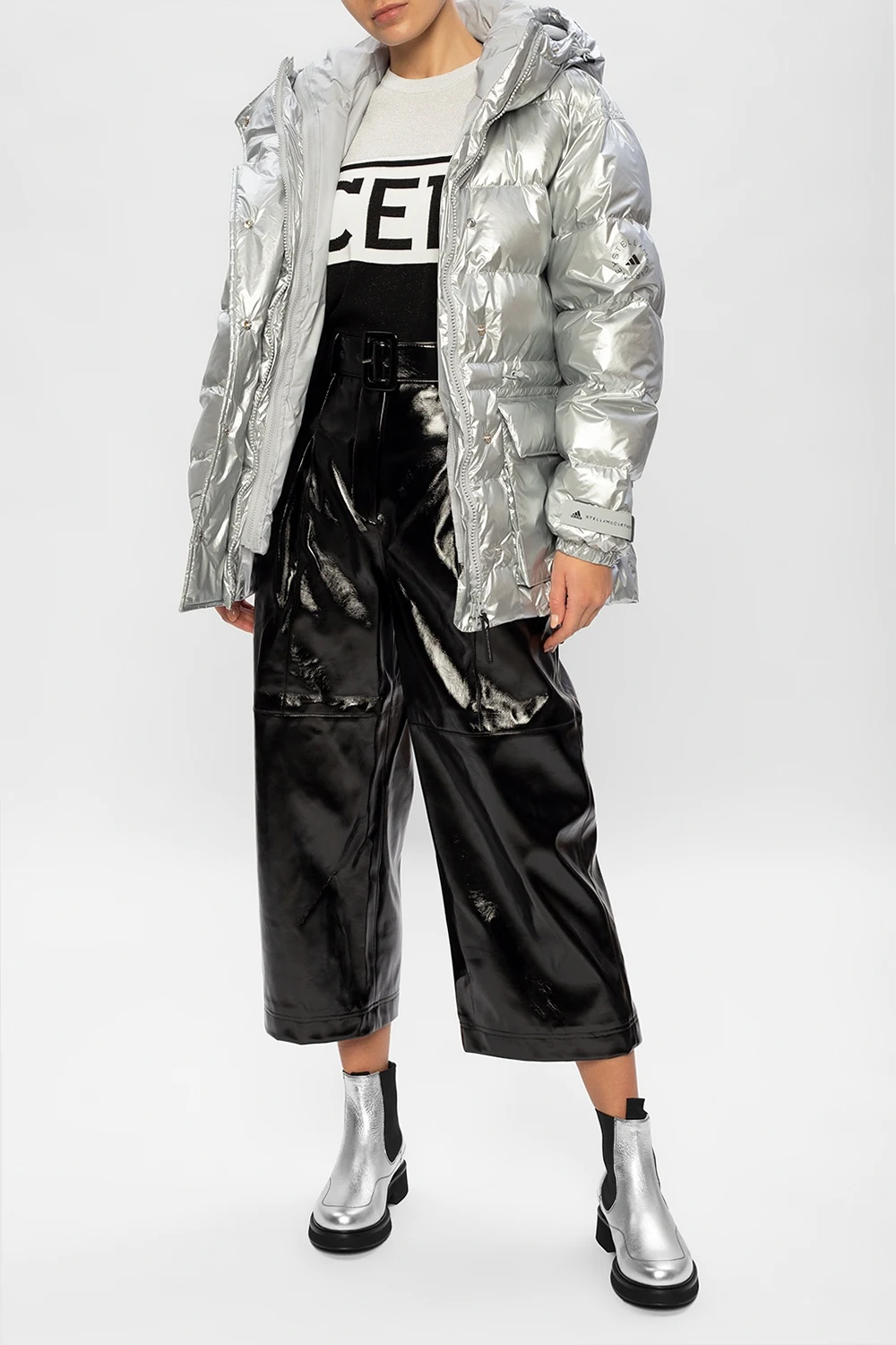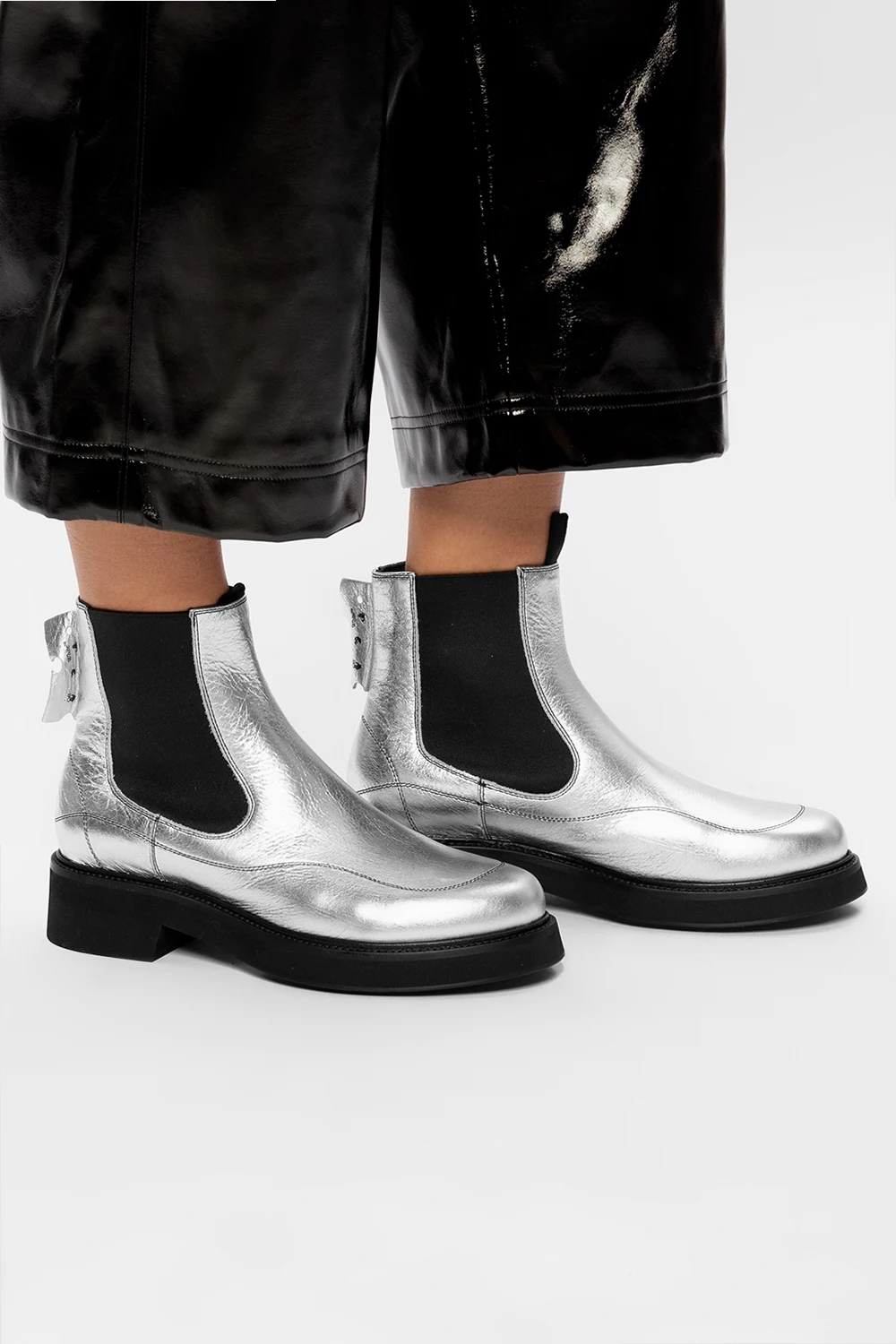 Silver-tone heeled ankle boots from Off-White. Crafted from leather, this pair rests on a black rubber sole and showcases black logo patch for the brand recognition.