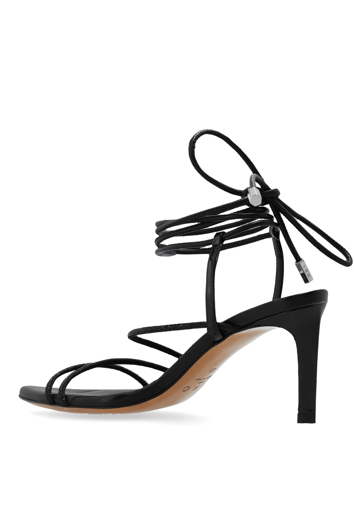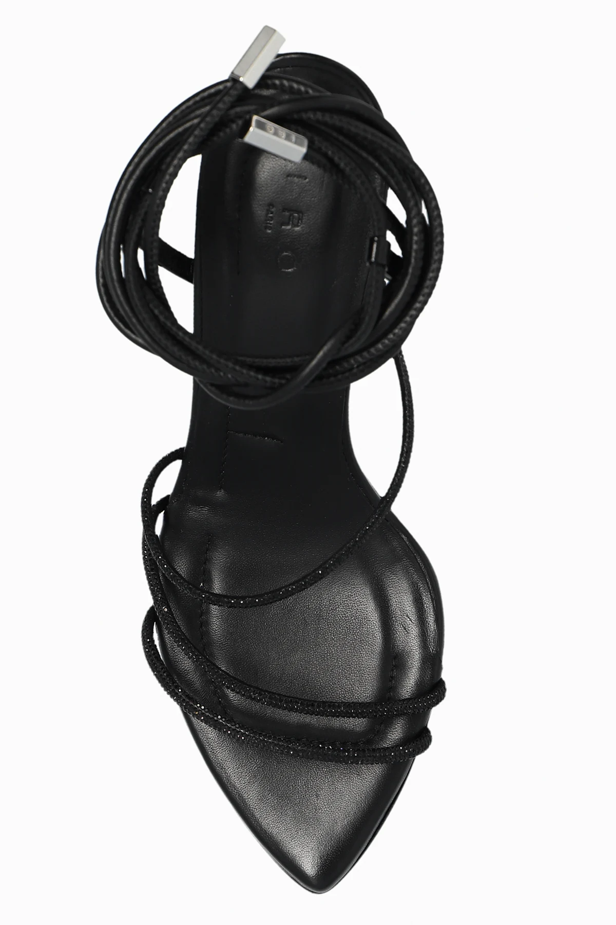Introducing the \'Ido\' High Heel Sandals by Iro, a testament to minimalist elegance and sophisticated design. Crafted with meticulous attention to detail, these sandals epitomize the harmonious blend of style and functionality. The dominant black color accentuates their versatile appeal, making them a quintessential addition to your footwear collection. The sandals feature delicate straps that gracefully wrap around the front of the foot and the ankle, offering a subtle yet elegant look. These thin, flat-profiled straps not only enhance the aesthetic appeal but also ensure a snug fit, thanks to their functional tie-around design. The long laces provide adjustable comfort while adding a unique stylistic touch. Standing tall on a slender, high heel measuring between 7-10 cm, these sandals boast a silhouette that exudes femininity and grace. The heel\'s column-like shape complements the overall refined aesthetic. Constructed from premium quality leather or high-grade synthetic material with a smooth finish, these sandals promise durability and comfort. The insole, also in black, likely made from leather or another soft material, guarantees a comfortable wearing experience. Additionally, the pointed toe shape adds an element of elegance, seamlessly integrating with the sophisticated style of the sandals. Why Purchase the \'Ido\' High Heel Sandals? Minimalist design with subtle straps for an understated elegance. Adjustable tie-around ankle feature for a customized and secure fit. Slender and high heel design to enhance your posture and grace. Premium material construction for lasting wear and comfort. Versatile black color, perfect for various occasions and outfits.