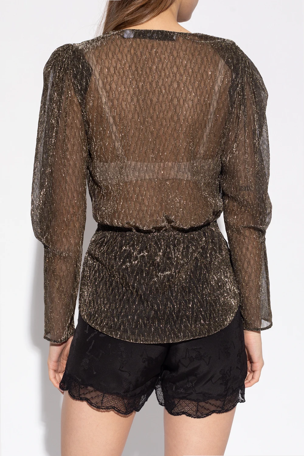 Gold-tone and black ‘Parwene’ top from Iro. Crafted in semi-sheer jacquard lurex, this style features a wrapped-over neckline, puffed sleeves and elasticized waistline with ruched detailing.
