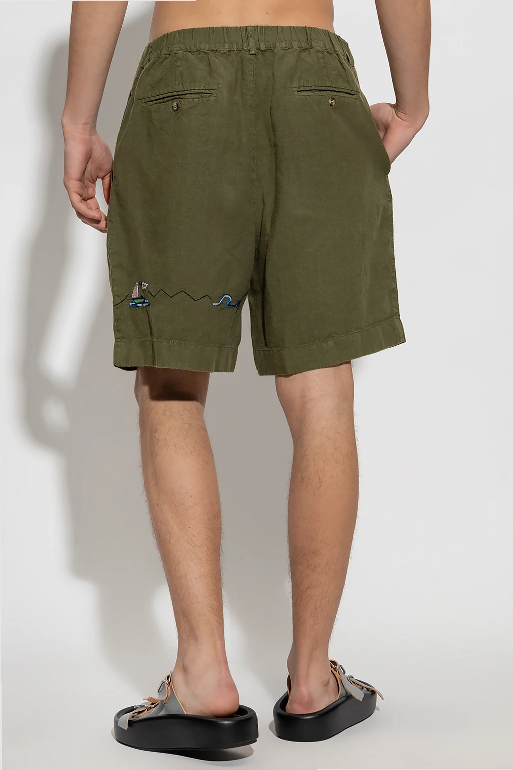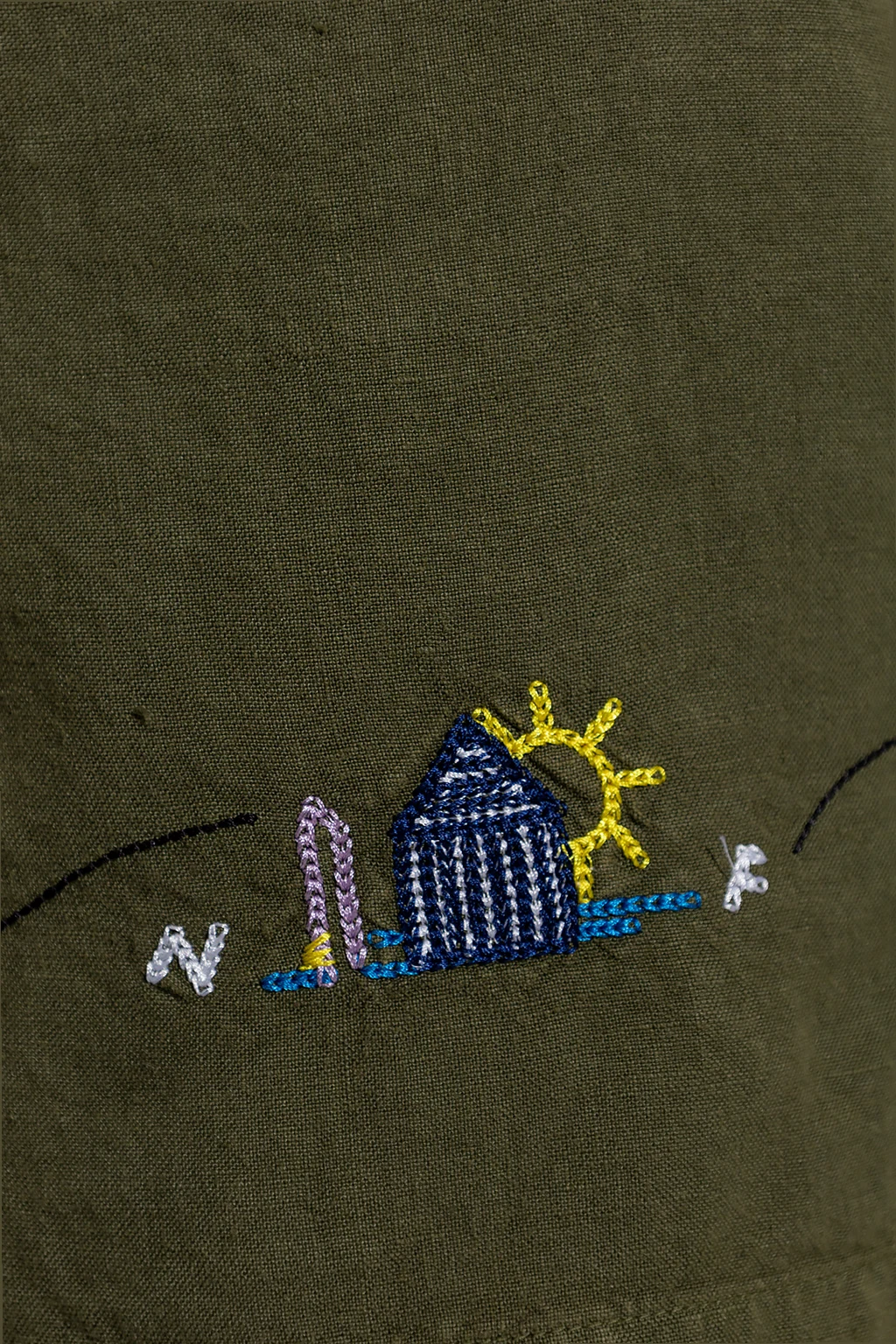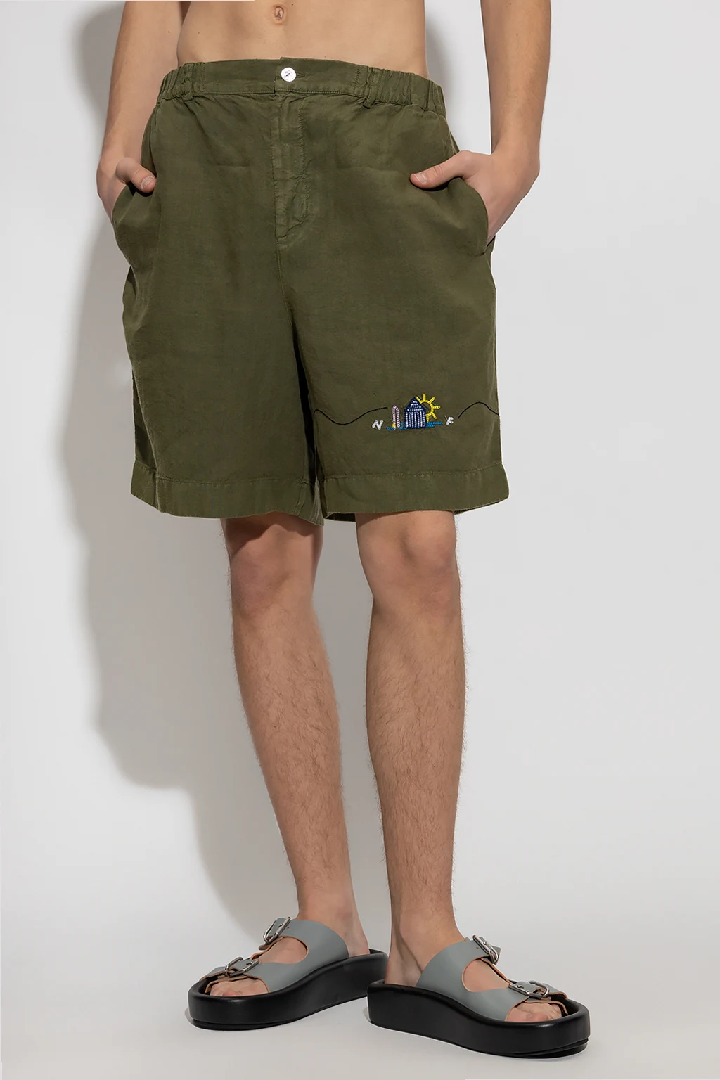 Khaki shorts from Nick Fouquet. Made of linen, this pair features a zip and button closure, multicolored logo embroidery, two front pockets and two buttoned back pockets.