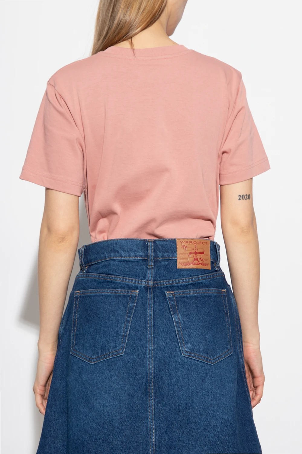 Blush pink body with short sleeves from Y/Project. Made of cotton, this round neck design features snap buttons, black logo embroidery and drawstrings on the sides.