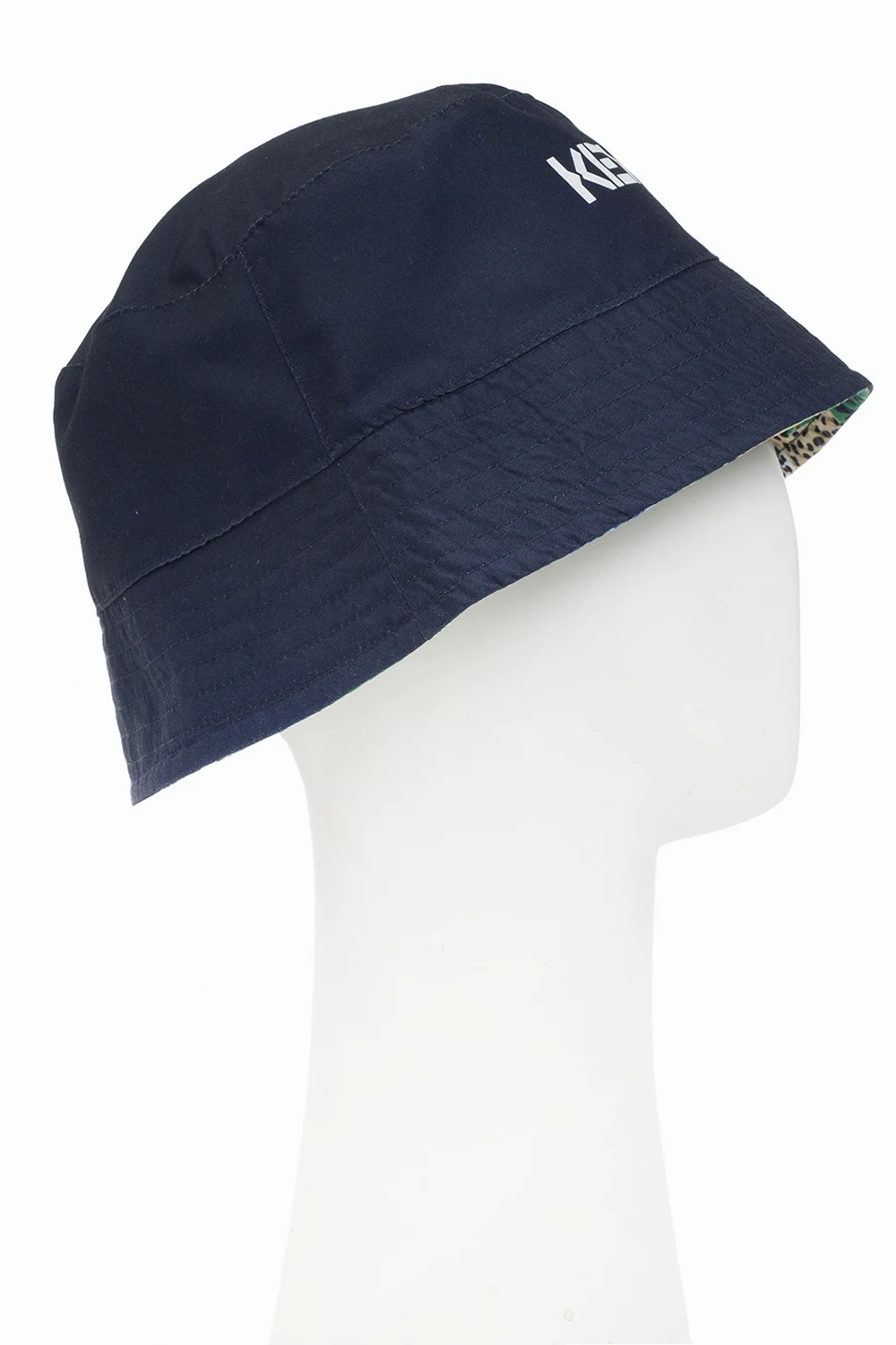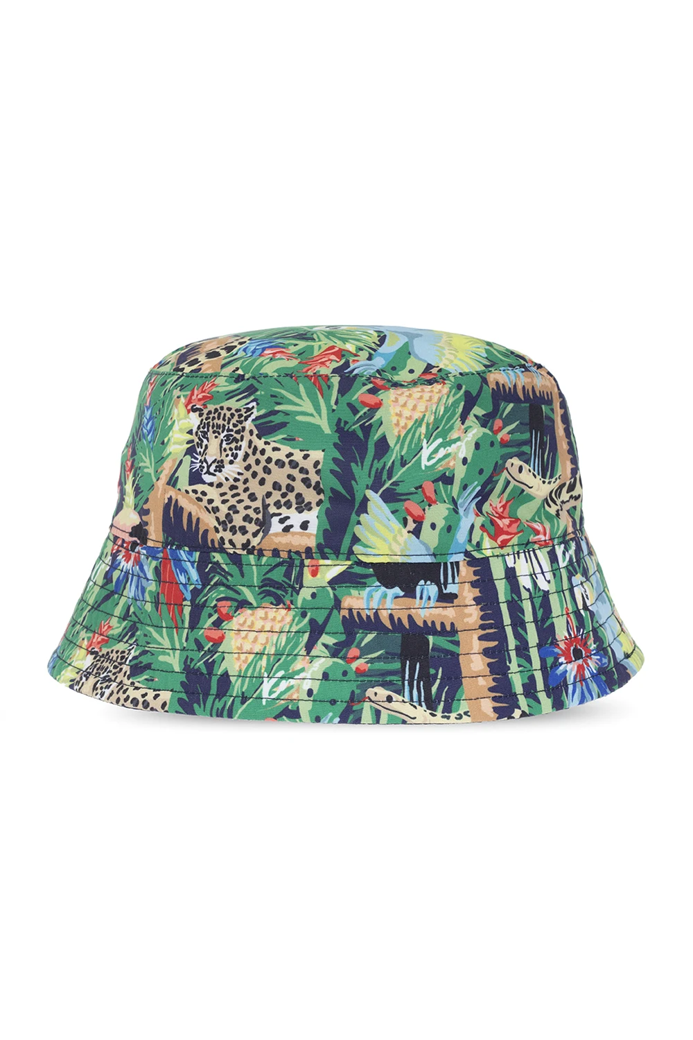 Multicoloured reversible bucket hat from Kenzo Kids. One side in navy blue has a white logo print. The reversible side showcases a tropical print with fauna & floral motifs.