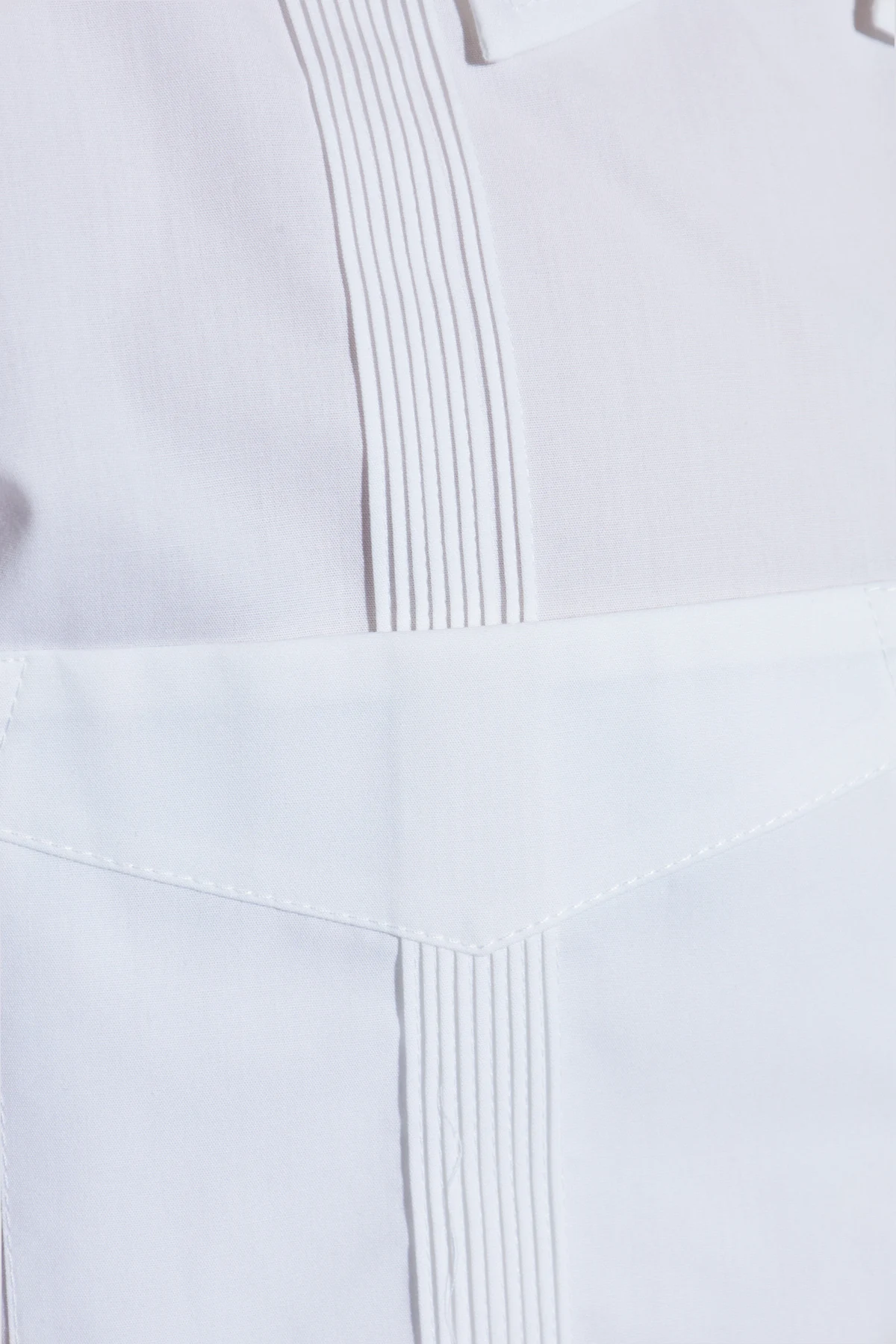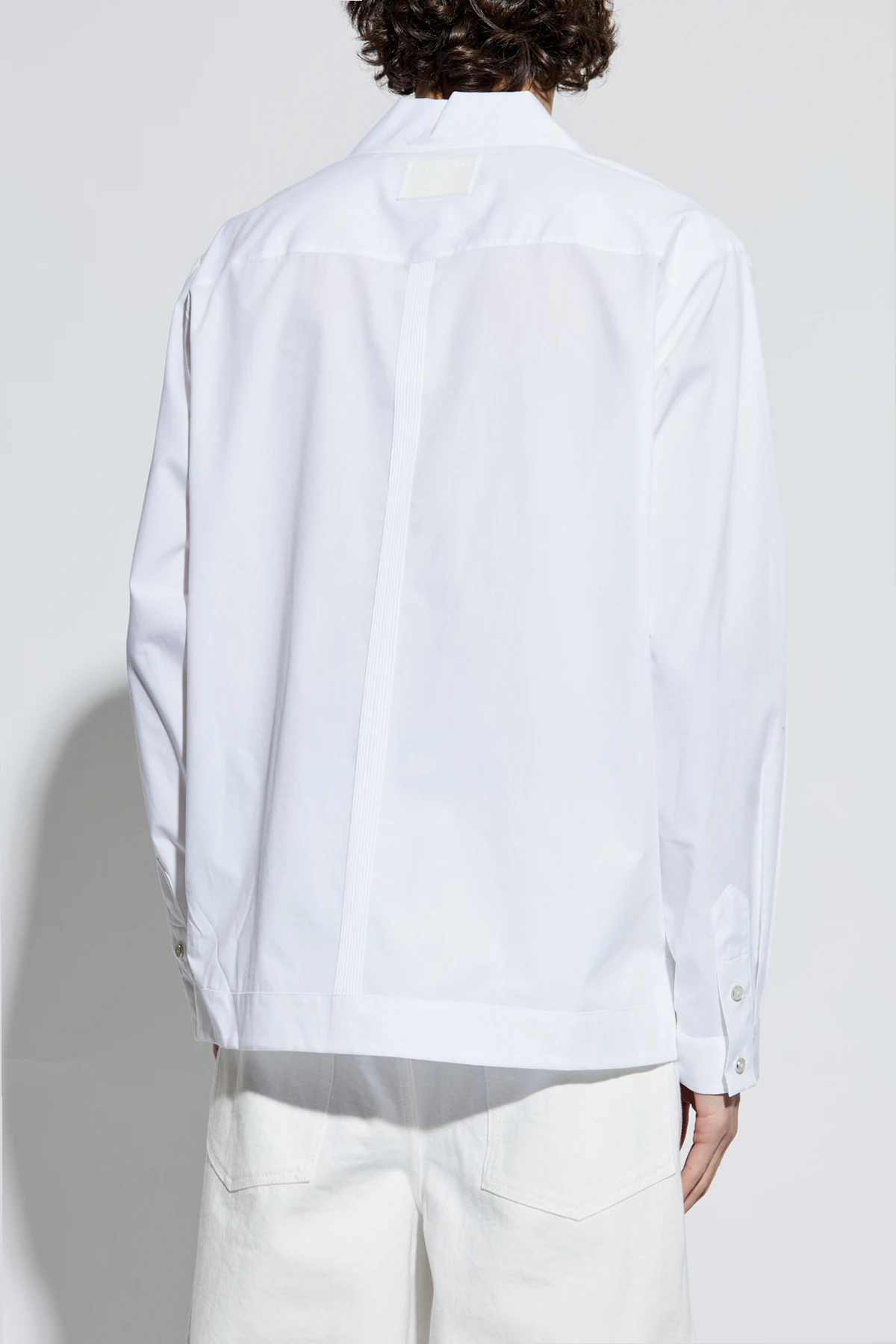 Introducing the Helmut Lang Pocket Shirt, a masterpiece from the illustrious Austrian marque, renowned for its minimalist yet sophisticated design ethos. This pristine white shirt epitomizes the brand\'s legacy, marrying elegance with a casual allure. Crafted from the finest quality cotton, this shirt features a classic, straight cut with long sleeves and a structured collar with laid-back lapels, exuding an air of refined sophistication. Adorned with two chest pockets, the shirt boasts a full-length button closure, harmoniously integrating delicate stripe patterns on the pockets and impeccably matched white buttons, ensuring a cohesive aesthetic. The lightweight fabric imparts a contemporary and fresh character, making it an indispensable piece for both formal and everyday ensembles. Why Choose This Product? Exquisite craftsmanship from Helmut Lang\'s exclusive collection. Versatile design suitable for both formal and casual occasions. Elegant details with subtle patterns enhancing its uniqueness. Premium cotton material offering comfort and breathability.