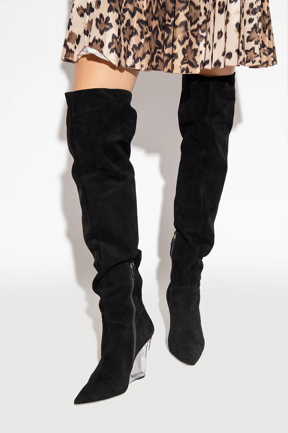 Black ‘Lucite’ wedge boots from Stuart Weitzman. Crafted from suede, this model features a side zipper, a cream leather sole and a decorative transparent wedge.