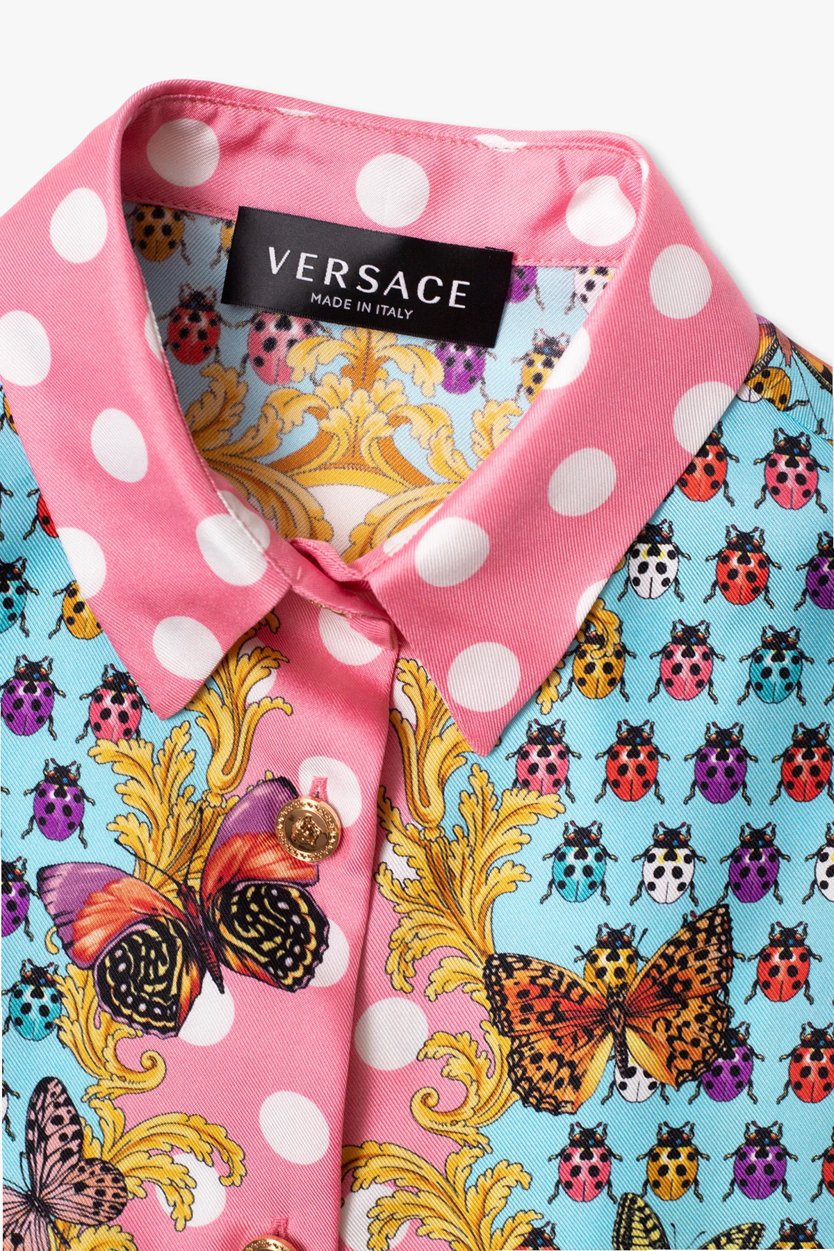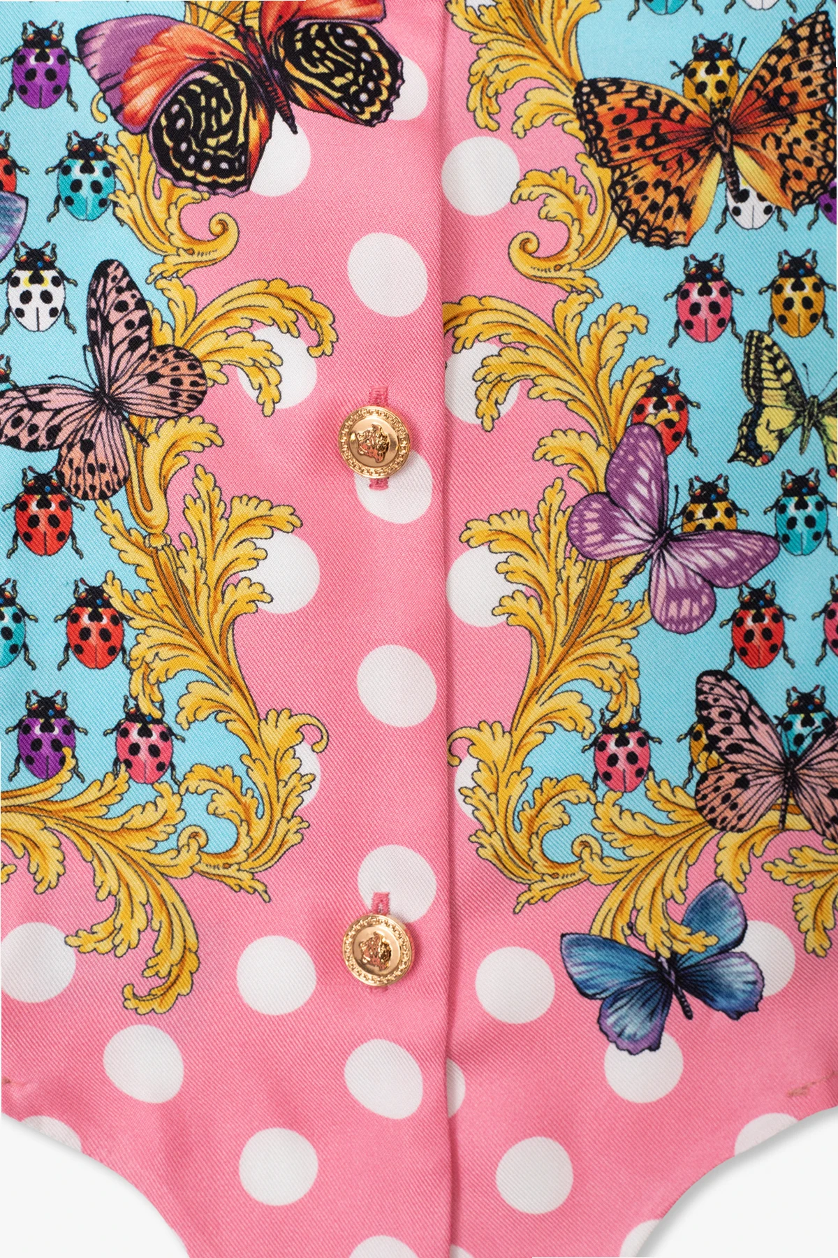 Multicolored cropped shirt from Versace Kids, ‘La Vacanza’ capsule collection. Crafted from silk, this design features the Heritage Butterflies & Ladybugs Kids pattern, tie detail at the hem and long sleeves with buttoned cuffs.