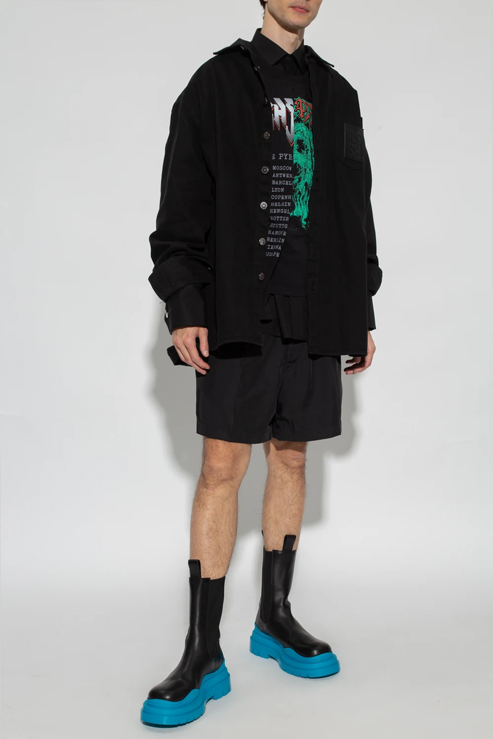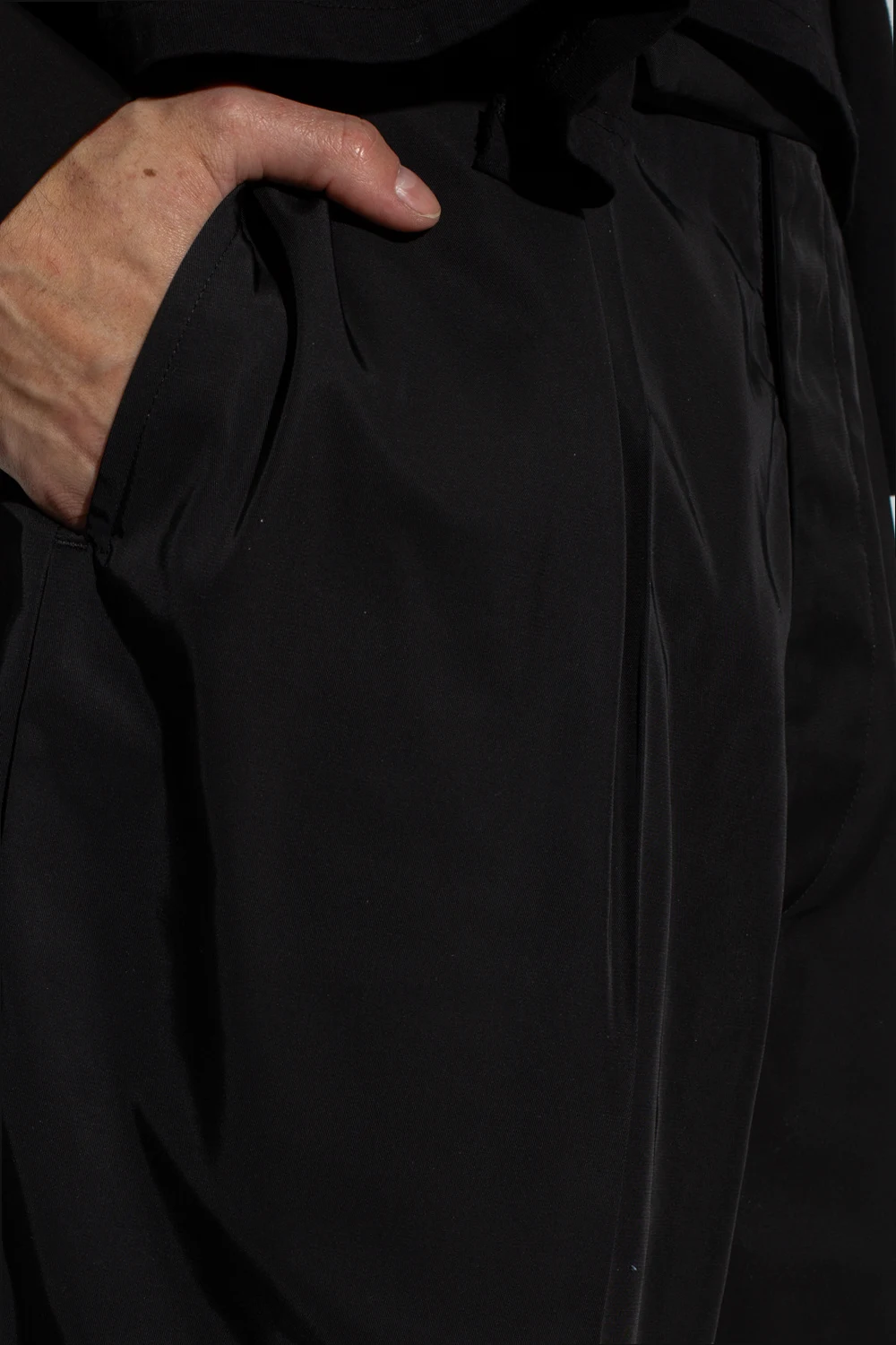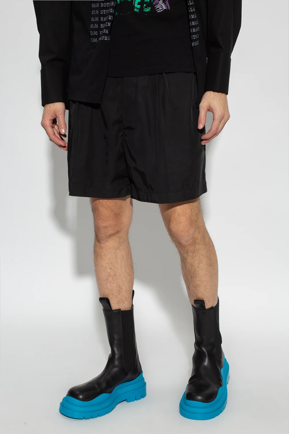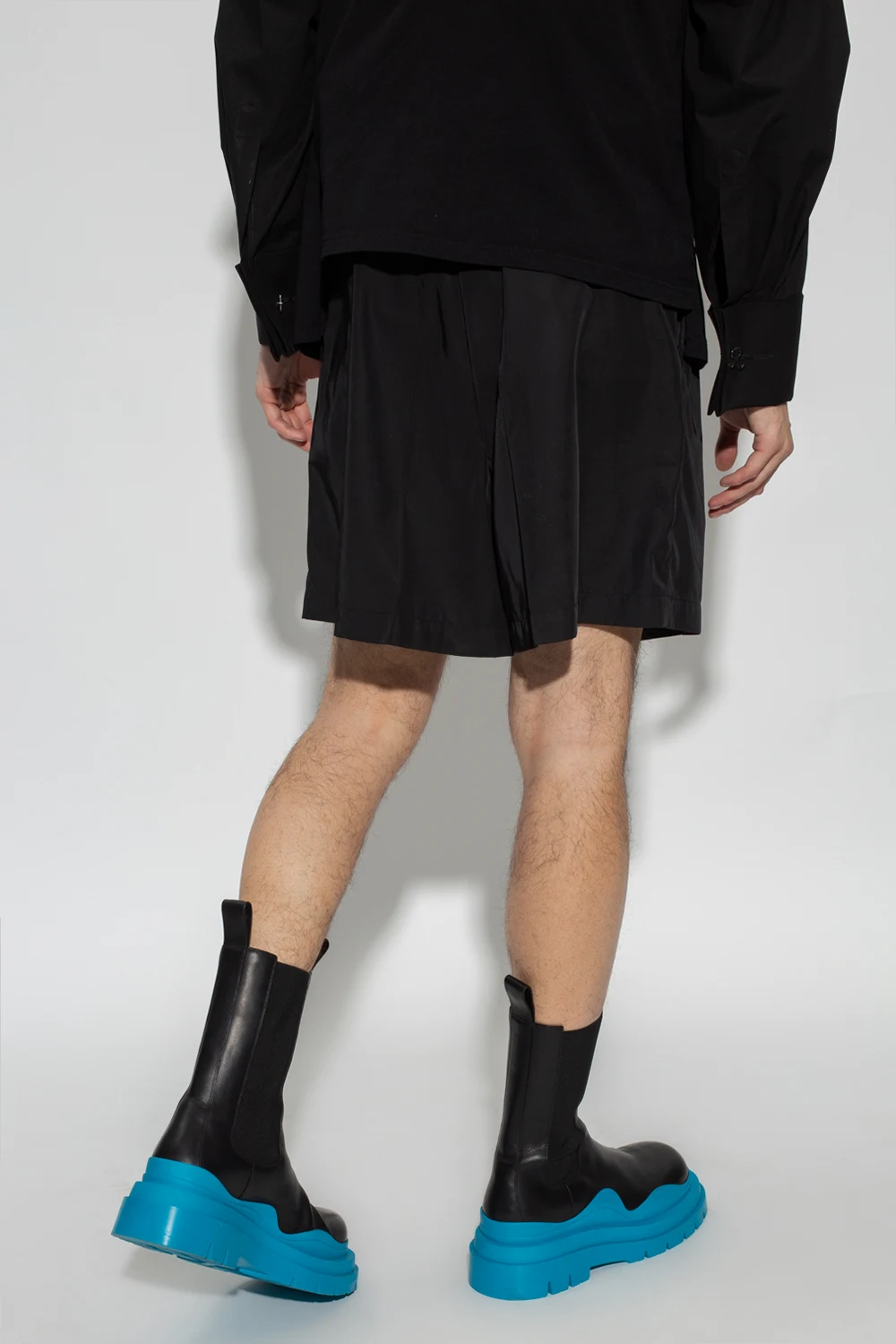Black shorts from Raf Simons. Distinguished by tucks at the waist, this pair features a hook closure accompanied by buttons, two front slip pockets and one back button pocket.