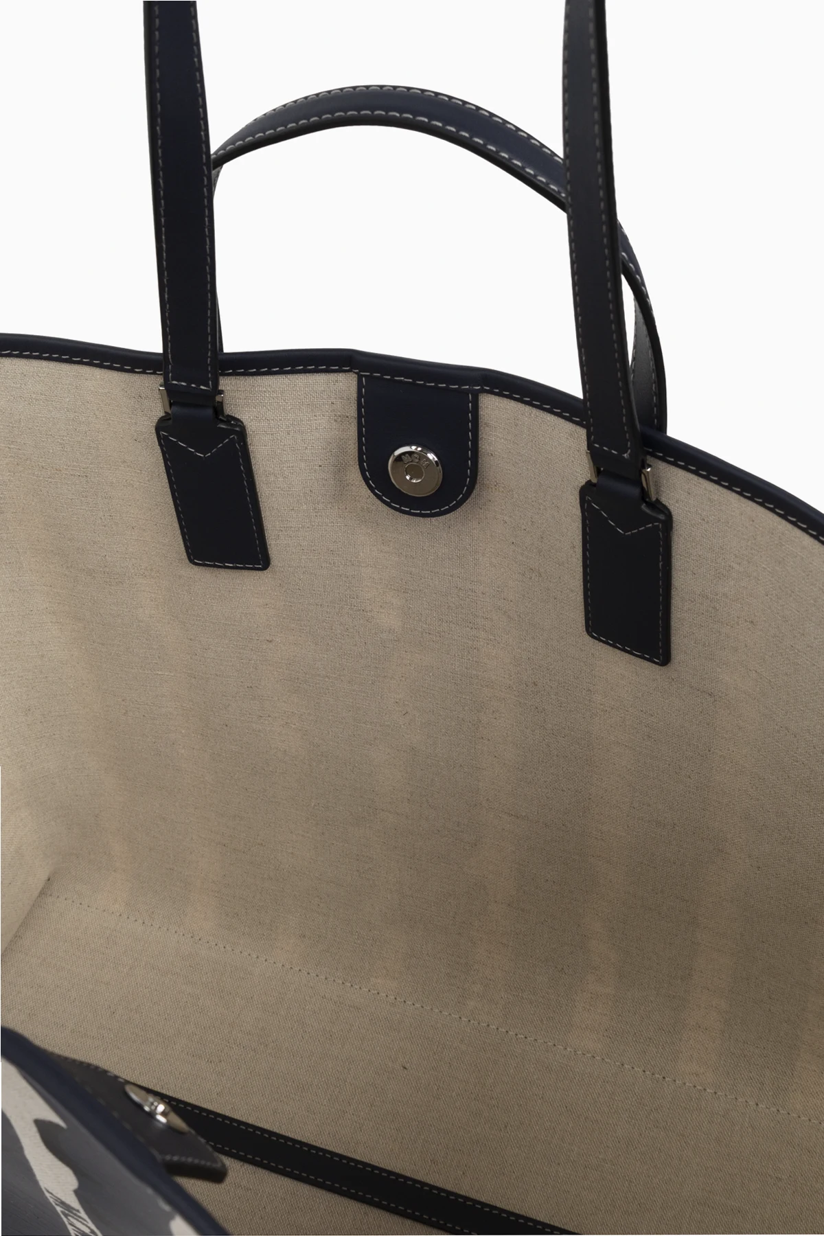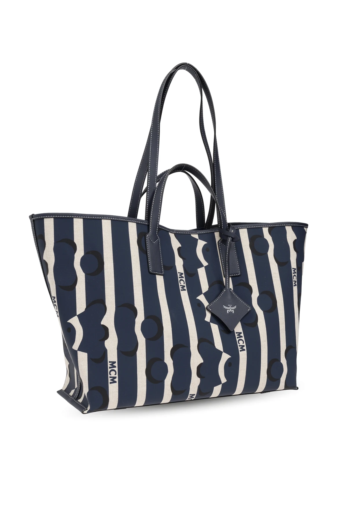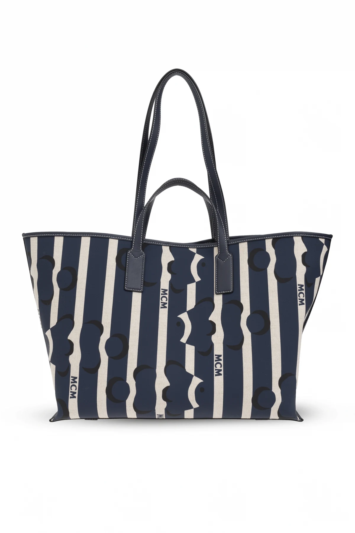 Introducing the exquisite Shopper Bag by MCM, a paragon of elegance and sophistication. This chic accessory, awash in a stately navy hue, is adorned with vertical light stripes that play host to darker, abstract shapes. The bag is crafted from a luxurious blend of cotton, linen, and polyurethane, ensuring both durability and style. The design is accentuated by two dark handles and a charming logo-embossed charm, embodying the avant-garde ethos of Mode Creation Munich. The interior is a contrasting light shade, equipped with a simple magnetic clasp for secure closure. Additionally, a matching pouch in the same captivating pattern offers practicality and style. Why Choose This Product? Timeless design with a modern twist. Crafted from premium materials for durability. Includes a matching pouch for added convenience. Perfect for daily use, combining elegance with functionality.