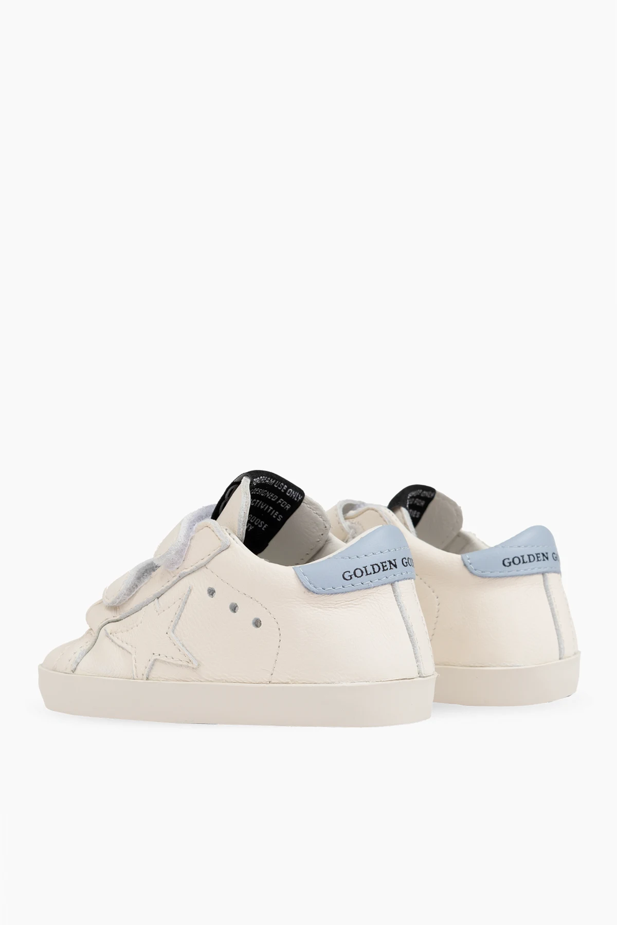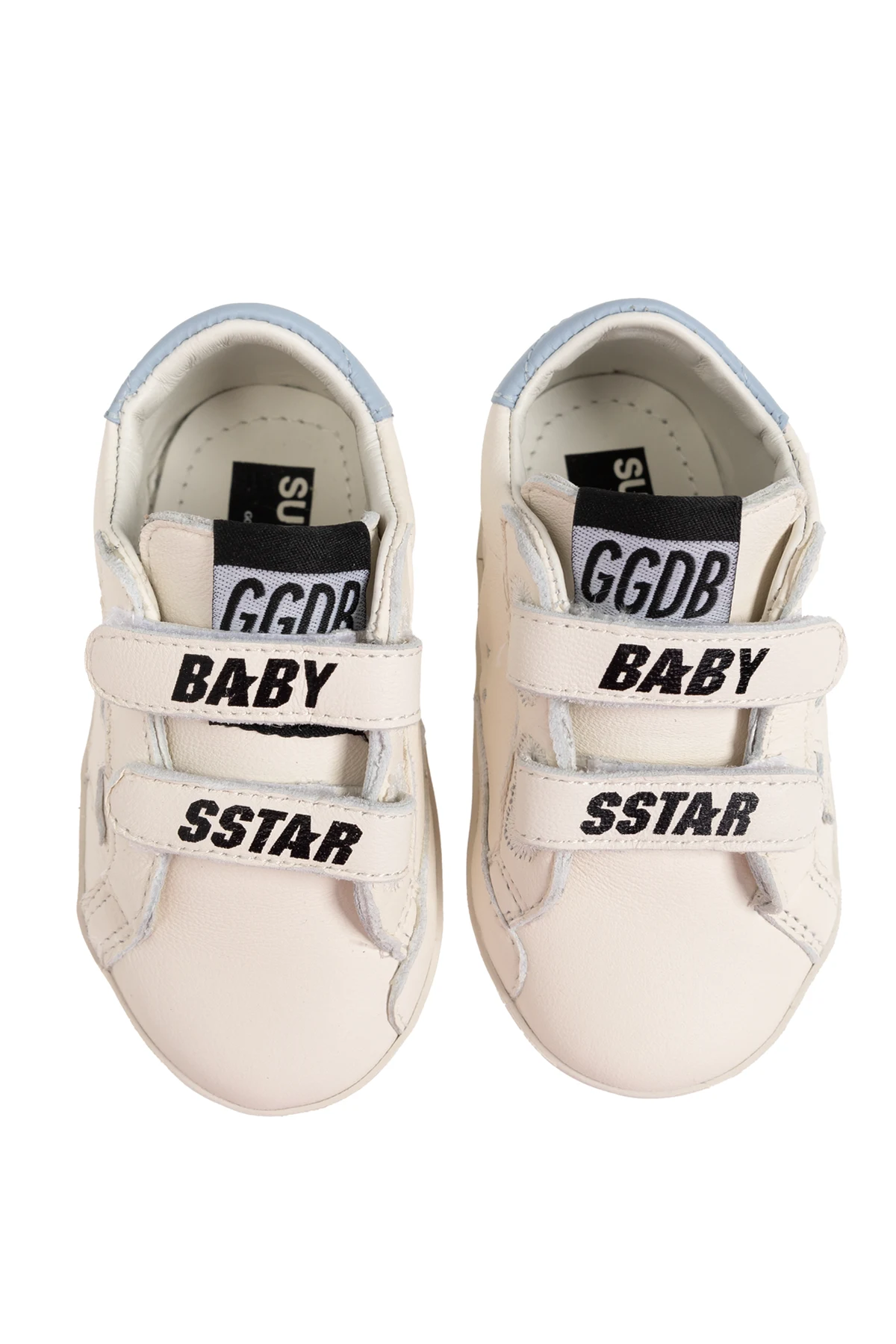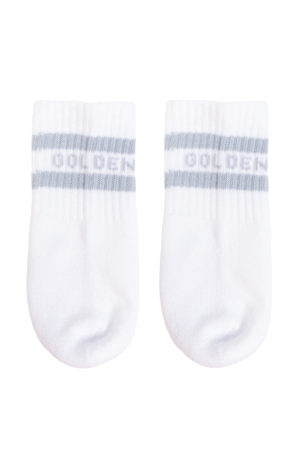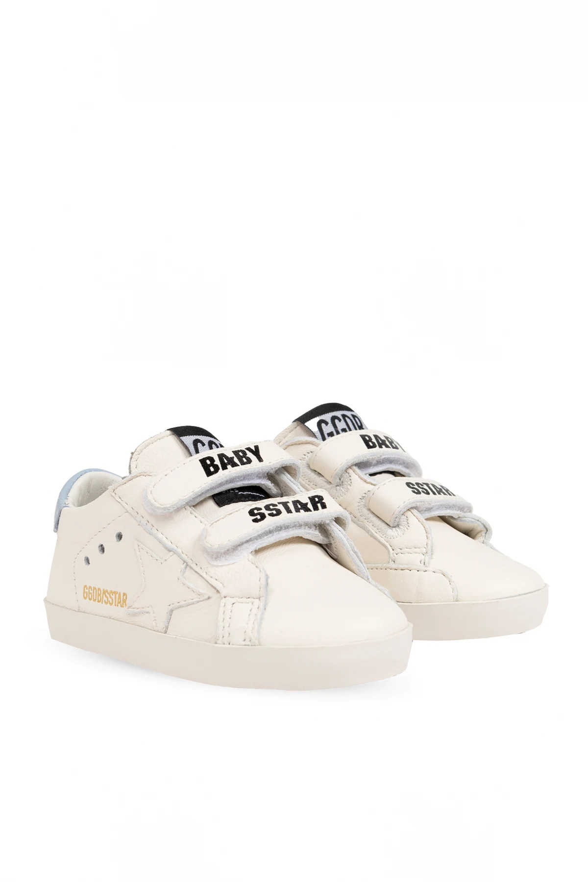 Presenting an exquisite ensemble for the little trendsetters - the Golden Goose Kids Set featuring pristine white sports shoes paired with a duo of socks. This set is meticulously crafted to blend unparalleled comfort with iconic style, making it a perfect choice for children aged 13-24 months. Sports Shoes: The white leather sports shoes, adorned with elegant blue accents, showcase a classic low-top design. Distinguished by a cutout star emblem, these shoes epitomize the brand\'s signature flair. The dual velcro straps, inscribed with \"BABY\" and \"SSTAR\", offer ease of wear, while the golden \"GGBD/SSTAR\" logo and the blue \"GOLDEN GOOSE\" strip on the heel accentuate their luxurious appeal. Perforations on the sides enhance breathability, ensuring comfort for your little one. Socks: The accompanying socks, crafted from a soft cotton blend, feature a timeless white hue with subtle gray stripes. The word \"GOLDEN\" graces the upper stripe, adding a touch of sophistication to this essential accessory. Why Choose This Product? Elegance and Style: A chic and fashionable design perfect for young children. Ease of Use: Velcro closures for quick and hassle-free dressing. Brand Excellence: Iconic logos and patterns synonymous with the elite Golden Goose brand. Comfort and Durability: Leather finish and soft, elastic socks ensure long-lasting wear and comfort.