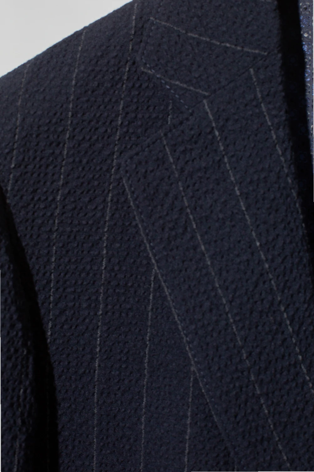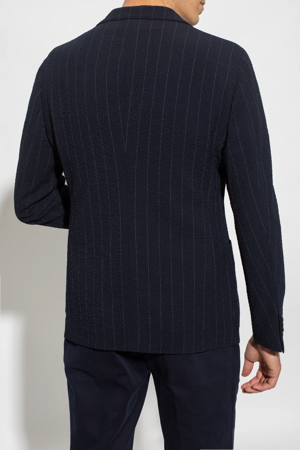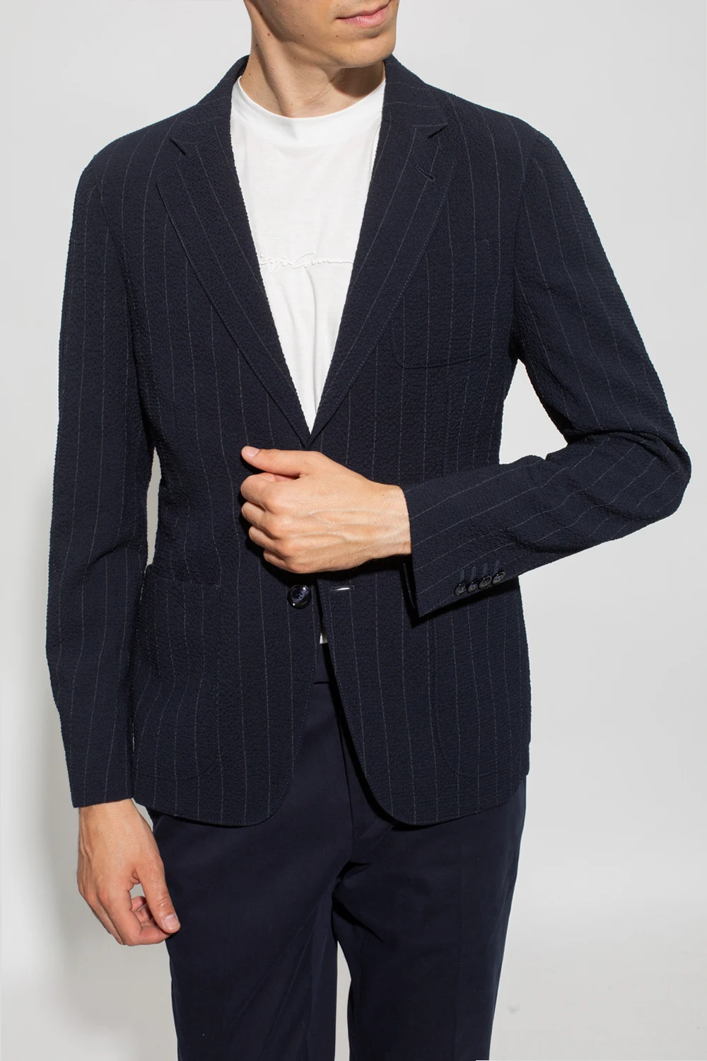 Navy blue blazer from Giorgio Armani. Made from wool, this style showcases all-over grey pinstripes, notch lapels, button fastenings, long sleeves and three slip pockets on the front.