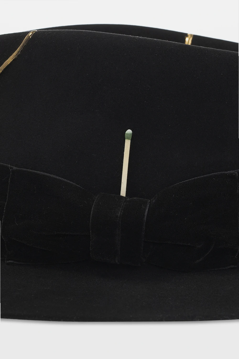 Black hat from Nick Fouquet. Made or beaver felt, this item showcases gold-tone trimming and a ribbon band with a bow and the iconic matchstick.