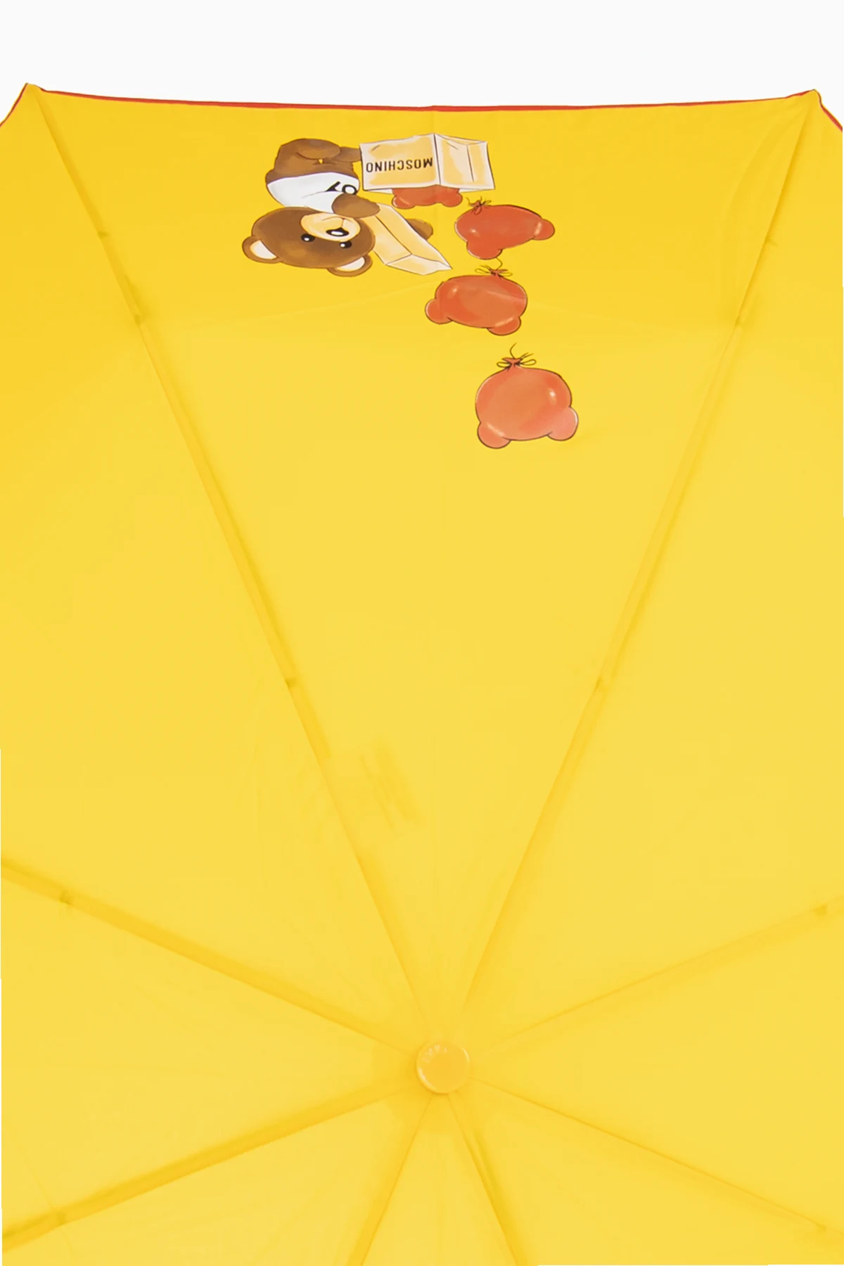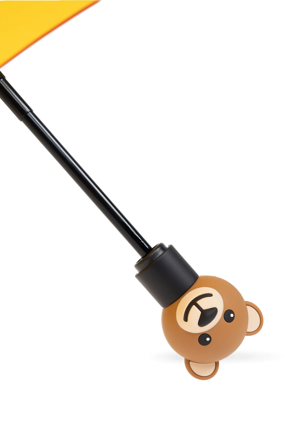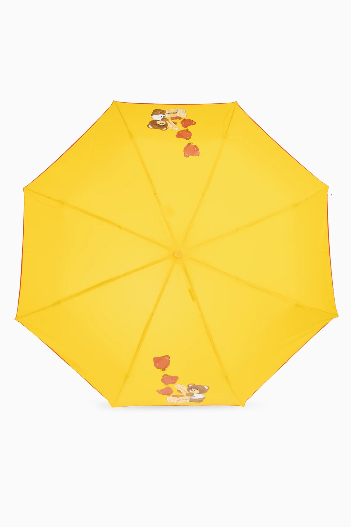 Introducing the Moschino Decorative Handle Umbrella – a fusion of whimsical design and practical elegance. Crafted from 100% polyester, this accessory promises not only durability but also a high degree of water resistance, ensuring you stay dry in the most stylish way possible. The umbrella\'s vibrant yellow hue is brilliantly accented with an exclusive animal character application, featuring a bear amidst an array of apples and a book, possibly hinting at the collection\'s theme or the Moschino brand itself. The handle\'s unique design, shaped into the head of the same bear, lends a playful yet sophisticated touch to the piece. This stylized animal face handle adds a quirky flair, transforming a simple accessory into a statement piece. An automatic or semi-automatic opening system, supported by sturdy metal ribs, ensures ease of use, blending functionality with the umbrella\'s distinctive aesthetic. Why Purchase This Product? Exceptional Craftsmanship: High-quality 100% polyester fabric offers durability and effective water resistance. Unique Design: The vibrant yellow color and bear motif with additional elements stand out, making it a signature Moschino collection piece. Whimsical Handle: A decorative handle shaped like a bear\'s head adds a playful touch to this elegant umbrella. Convenience: Easy to open and close with its automatic or semi-automatic mechanism, complemented by robust construction.