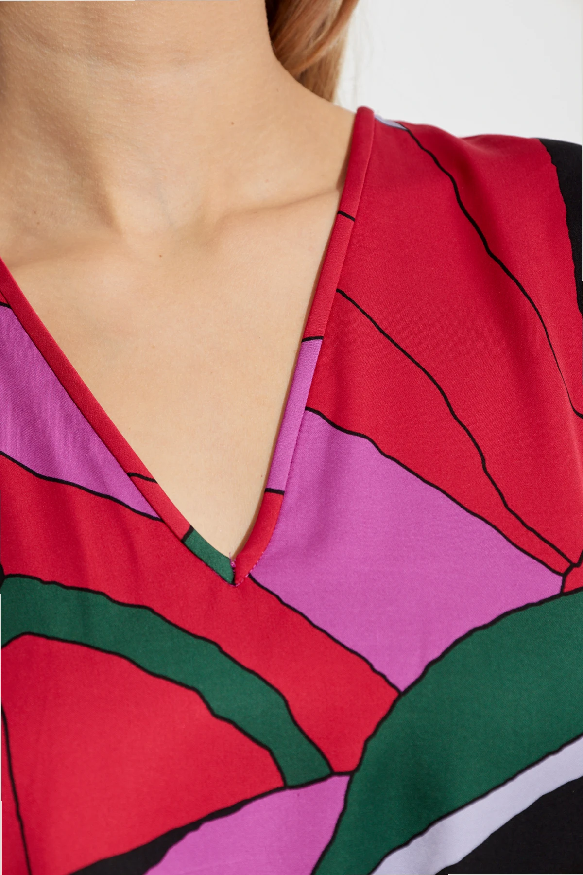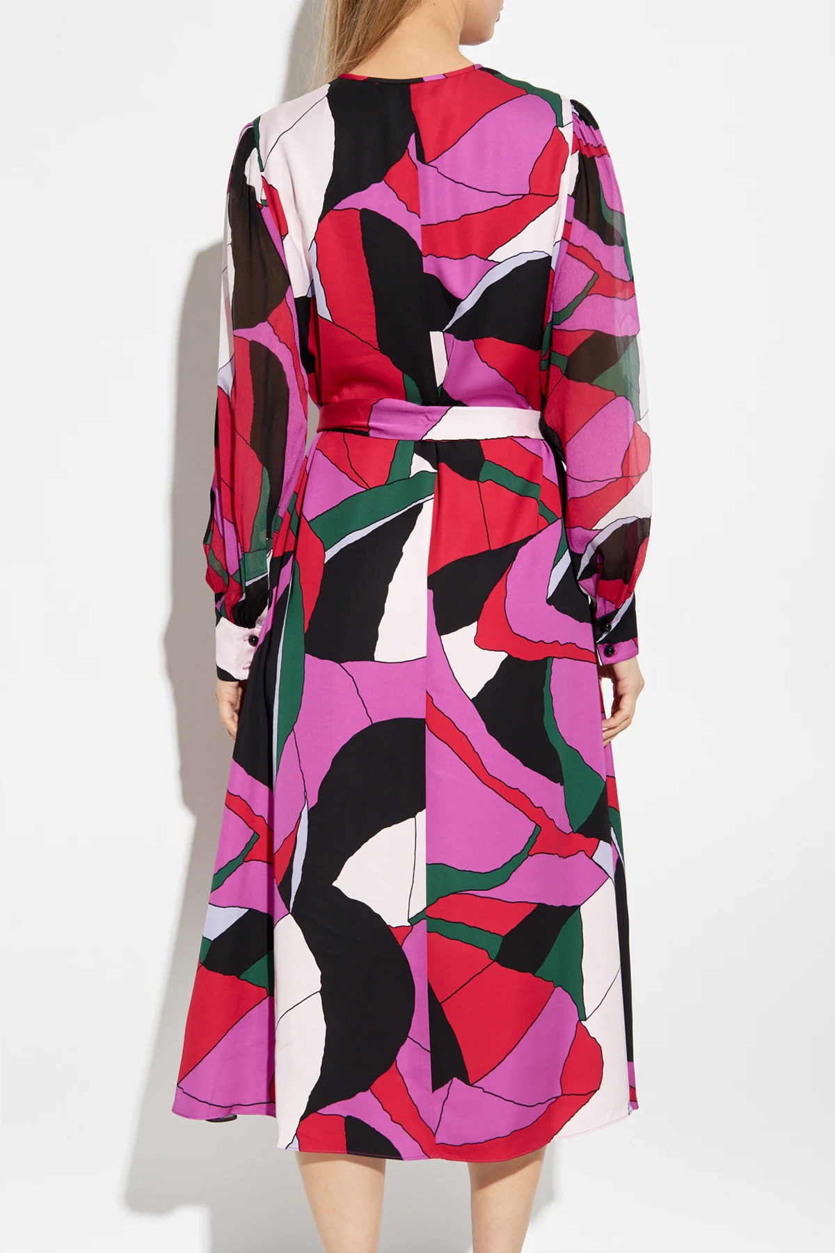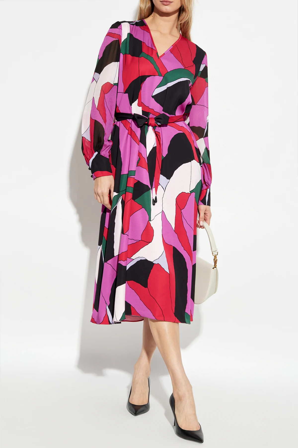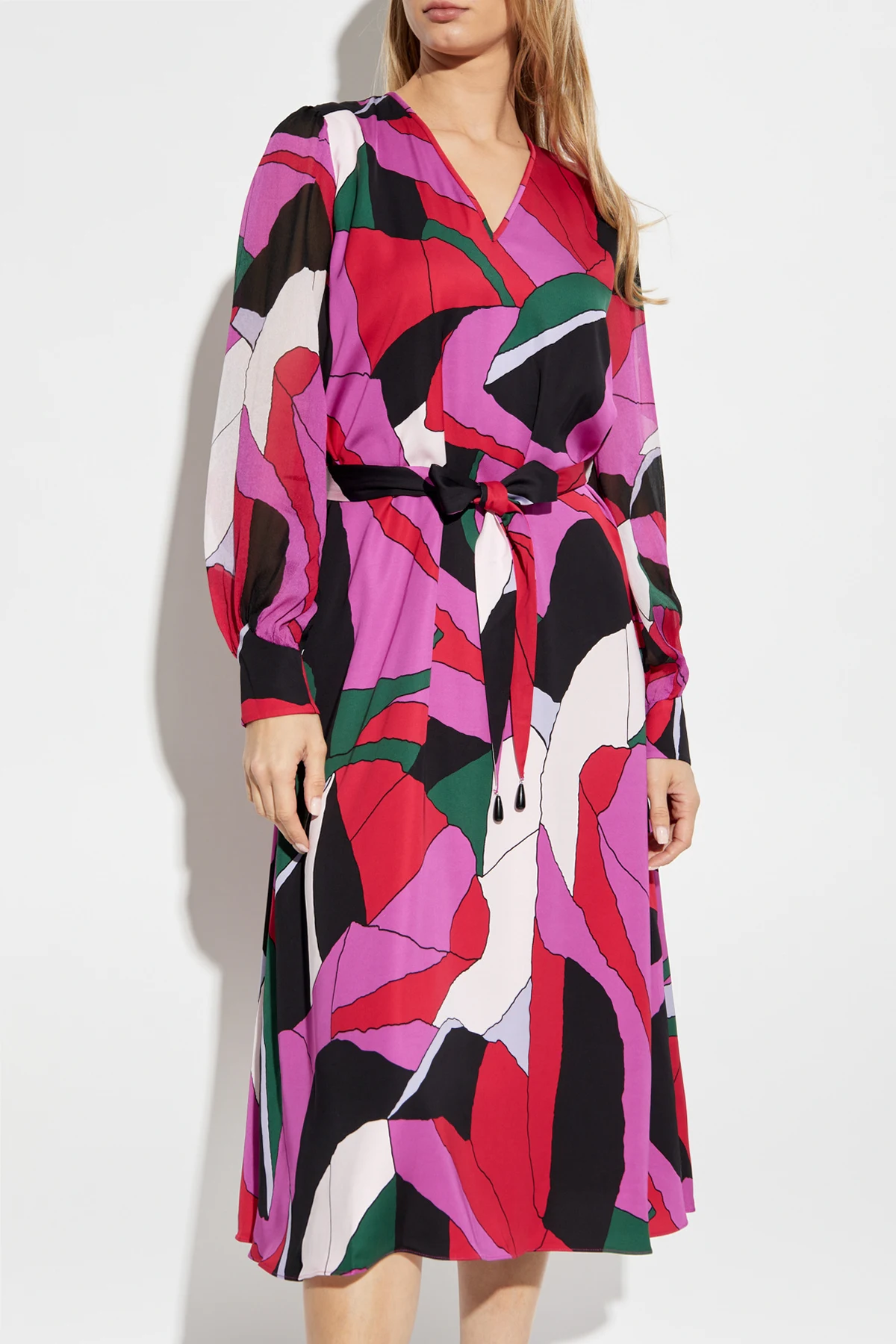 From the illustrious house of Diane Von Furstenberg, the \'Abel\' Dress is a testament to timeless elegance and modern flair. This exquisite piece, a part of an exclusive collection, embodies the quintessence of style and sophistication. Crafted from 100% Viscose, the dress offers a midi length with a relaxed fit, complemented by a matching belt to accentuate the waist. The ensemble exudes a captivating charm with a multicolored abstract pattern, predominantly featuring hues of red, pink, green, black, and white, while its asymmetrical design adds a striking visual appeal. Adorned with long sleeves and a V-neckline, this dress combines grace with an edge of modernity, making it an ideal choice for diverse occasions. The lightweight, airy fabric ensures unparalleled comfort, while the included belt allows for personalized styling. Why Choose This Product? Designed by the iconic Diane Von Furstenberg, a symbol of effortless elegance and empowerment. Features a unique, eye-catching asymmetrical pattern in vibrant colors. Includes a matching belt for customizable fit and silhouette enhancement. Crafted from high-quality viscose, ensuring comfort and durability.