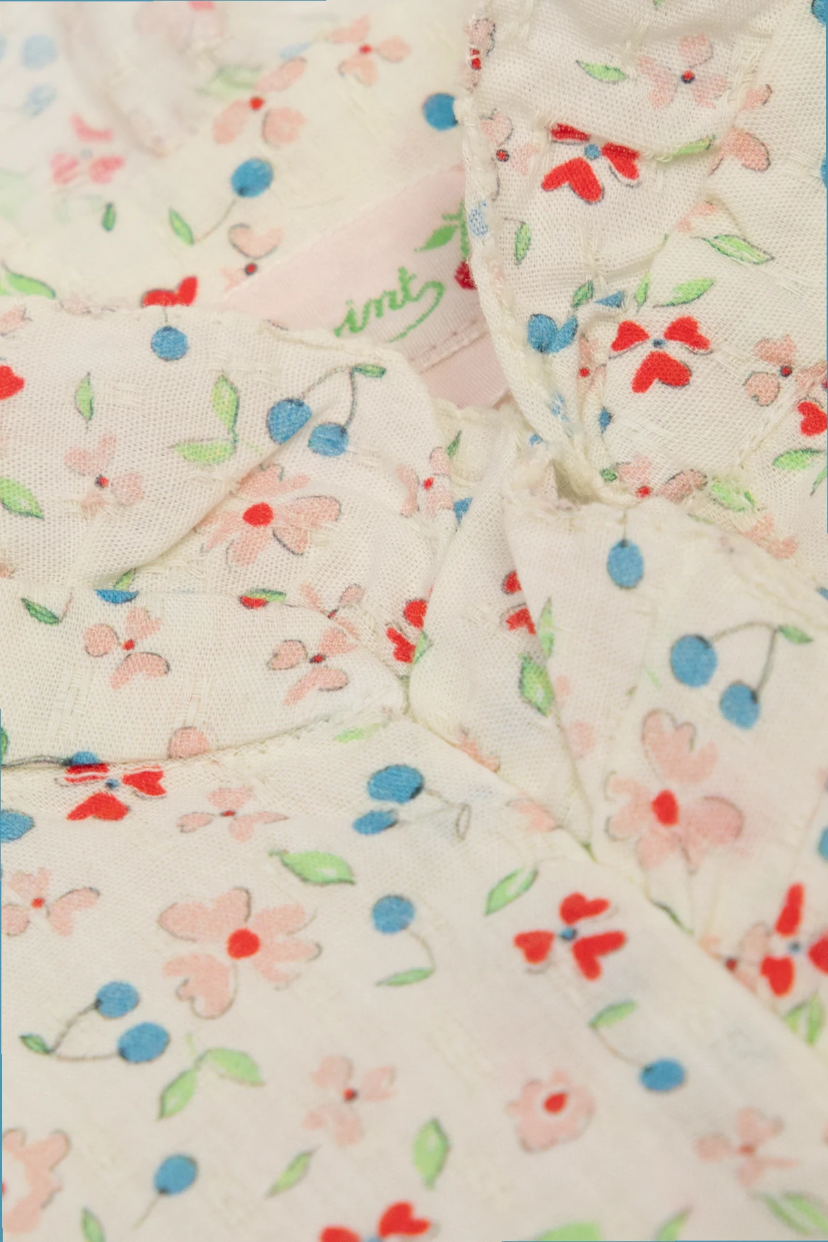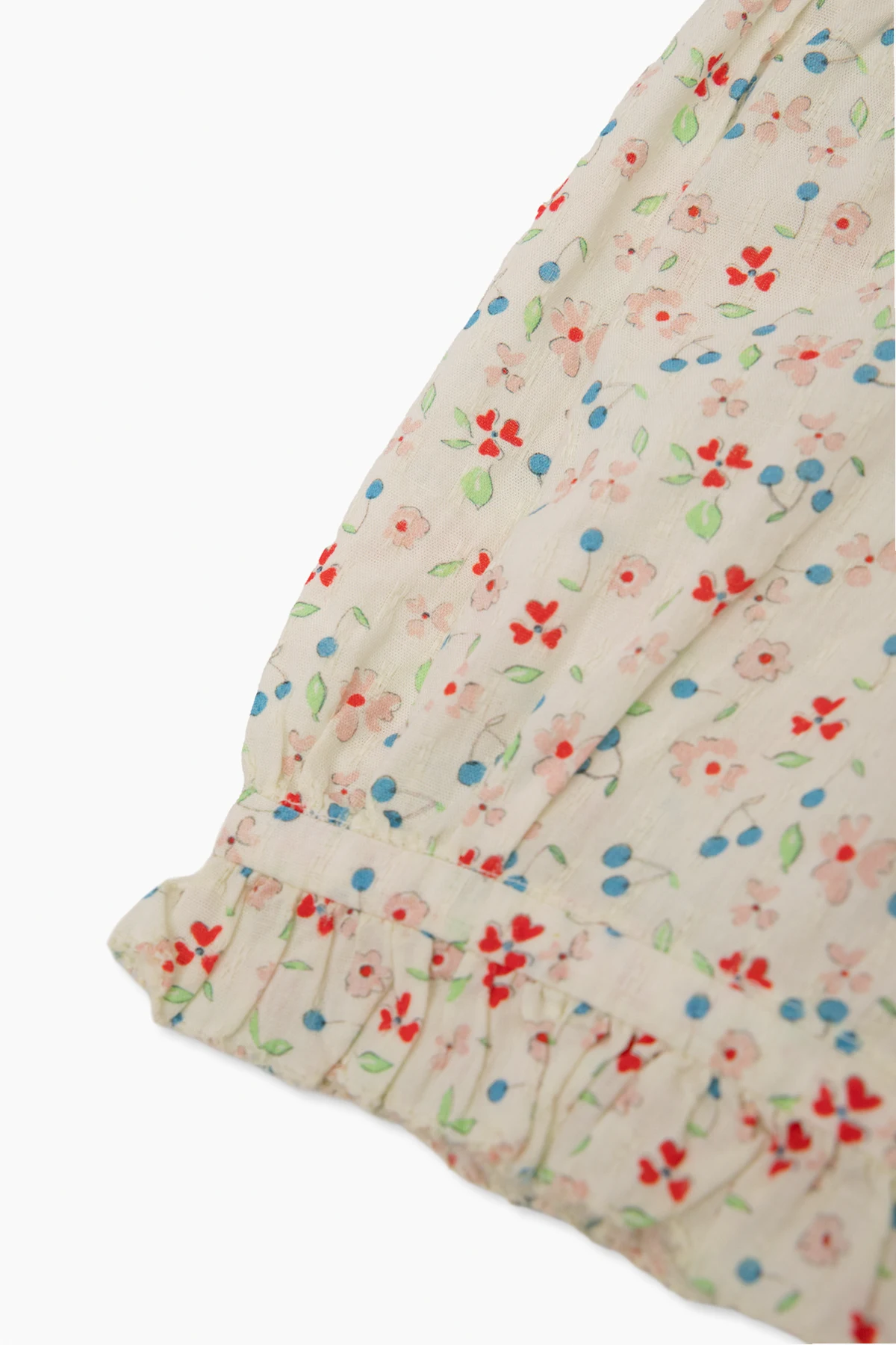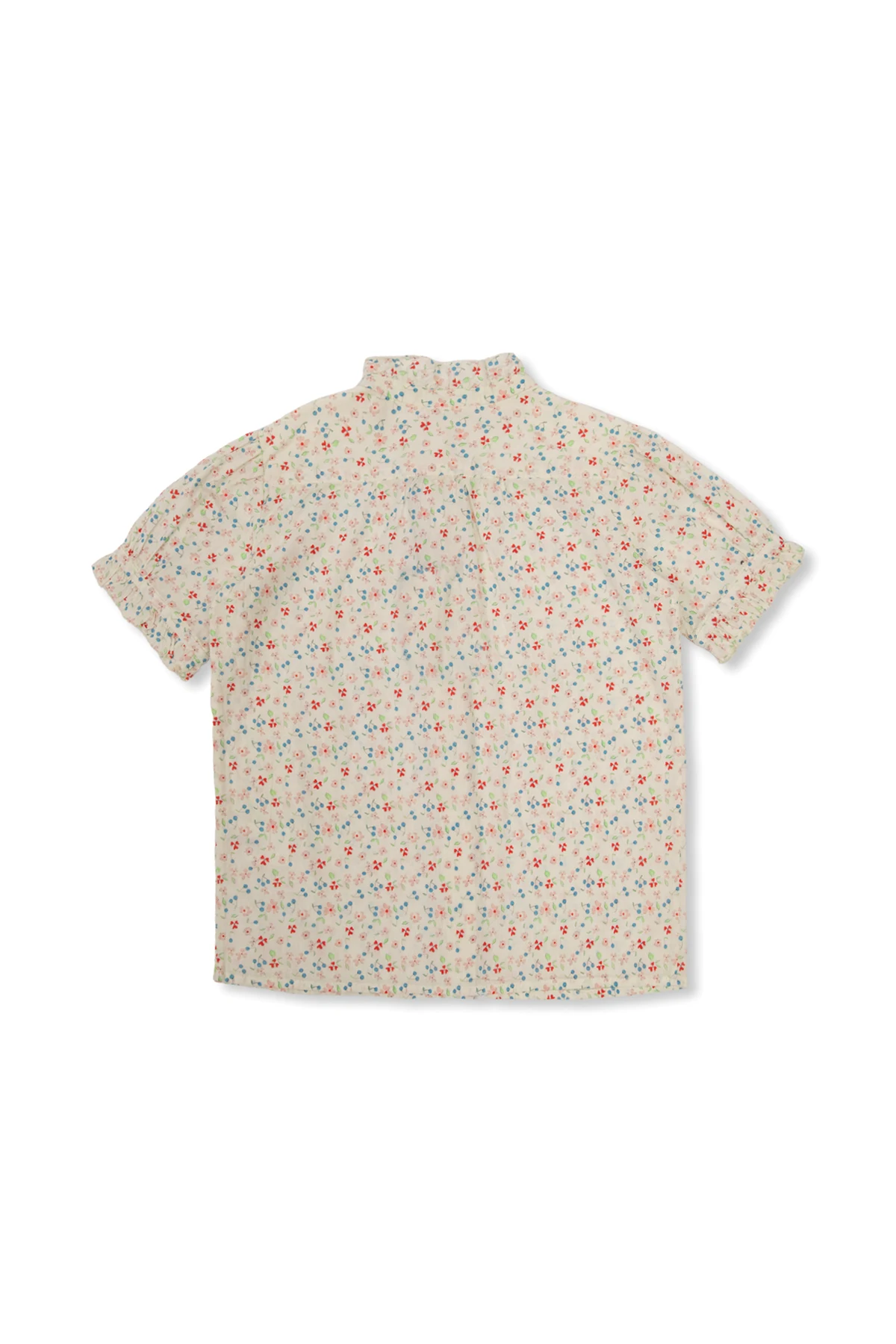 Light beige ‘Cindy’ shirt from Bonpoint. Made of cotton with a relaxed fit, this style showcases a graphic pattern with flowers and fruits, puff short sleeves, button fastenings and a standing collar.