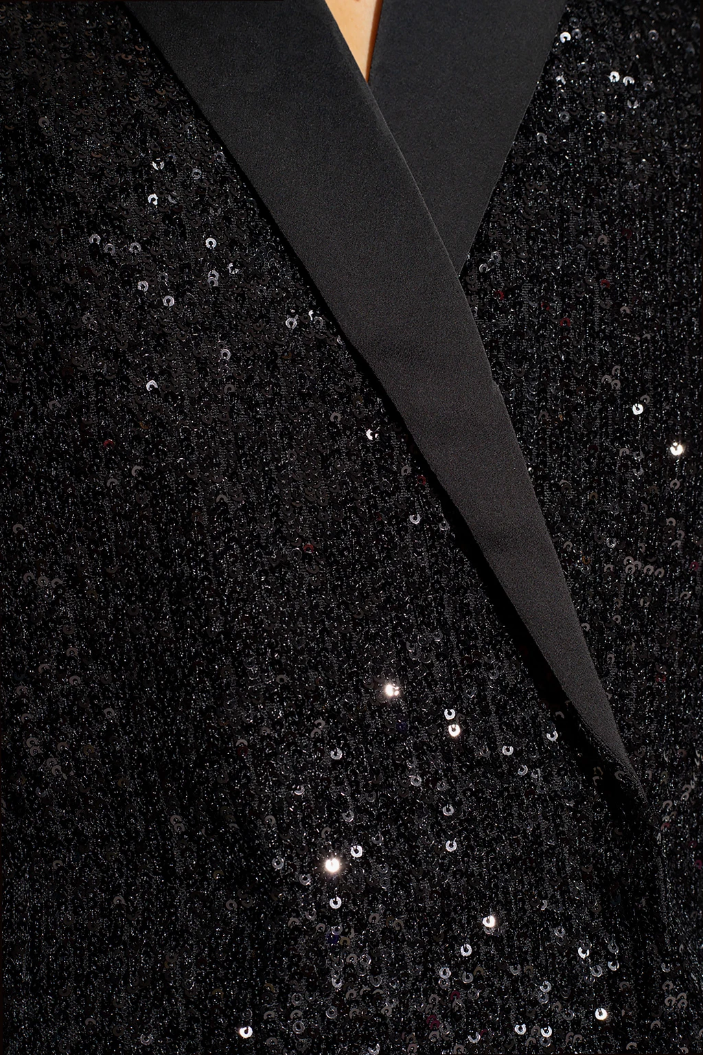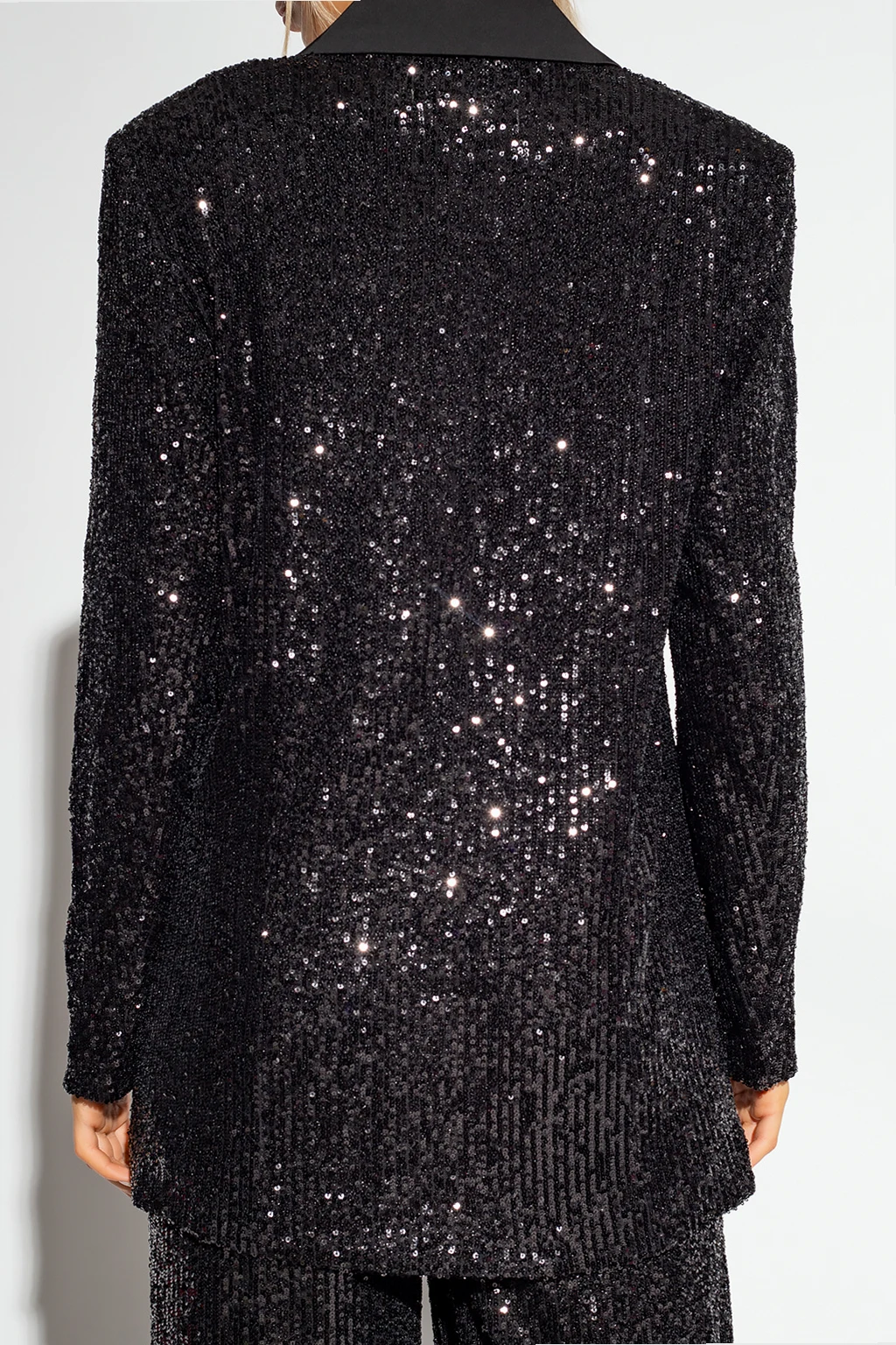 Black ‘SittiaGZ’ double-breasted blazer from Gestuz. Spruced up with sequins all over, this style features satin notch lapels, snap closures, exaggerated shoulders and long sleeves.