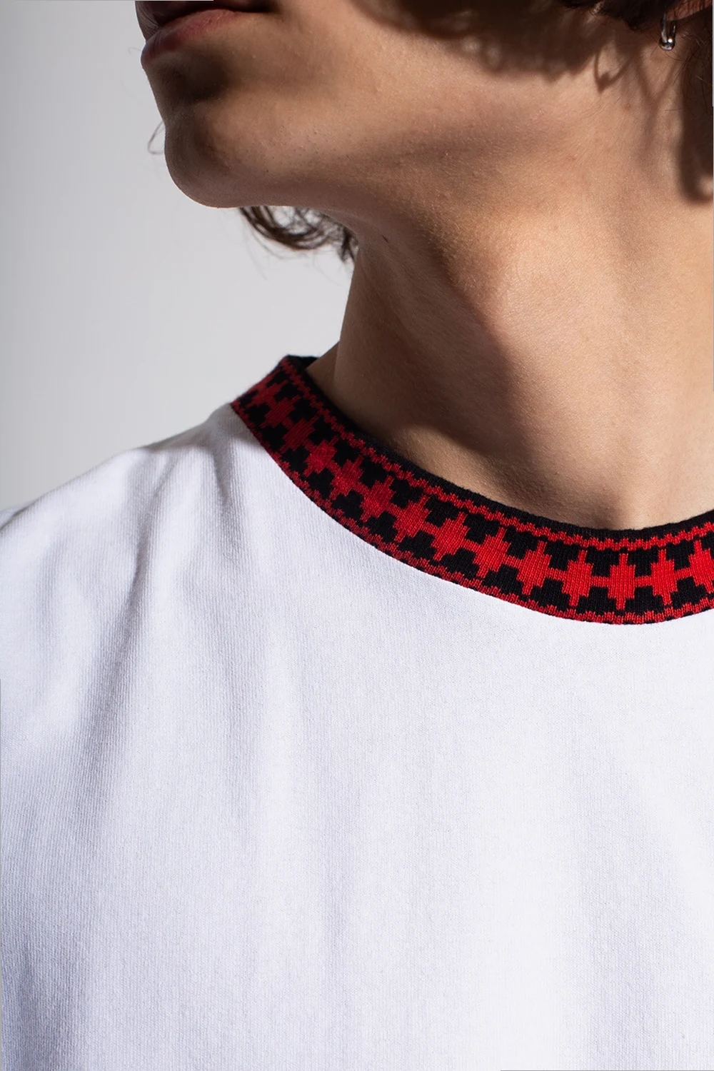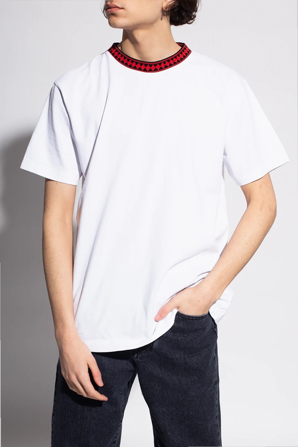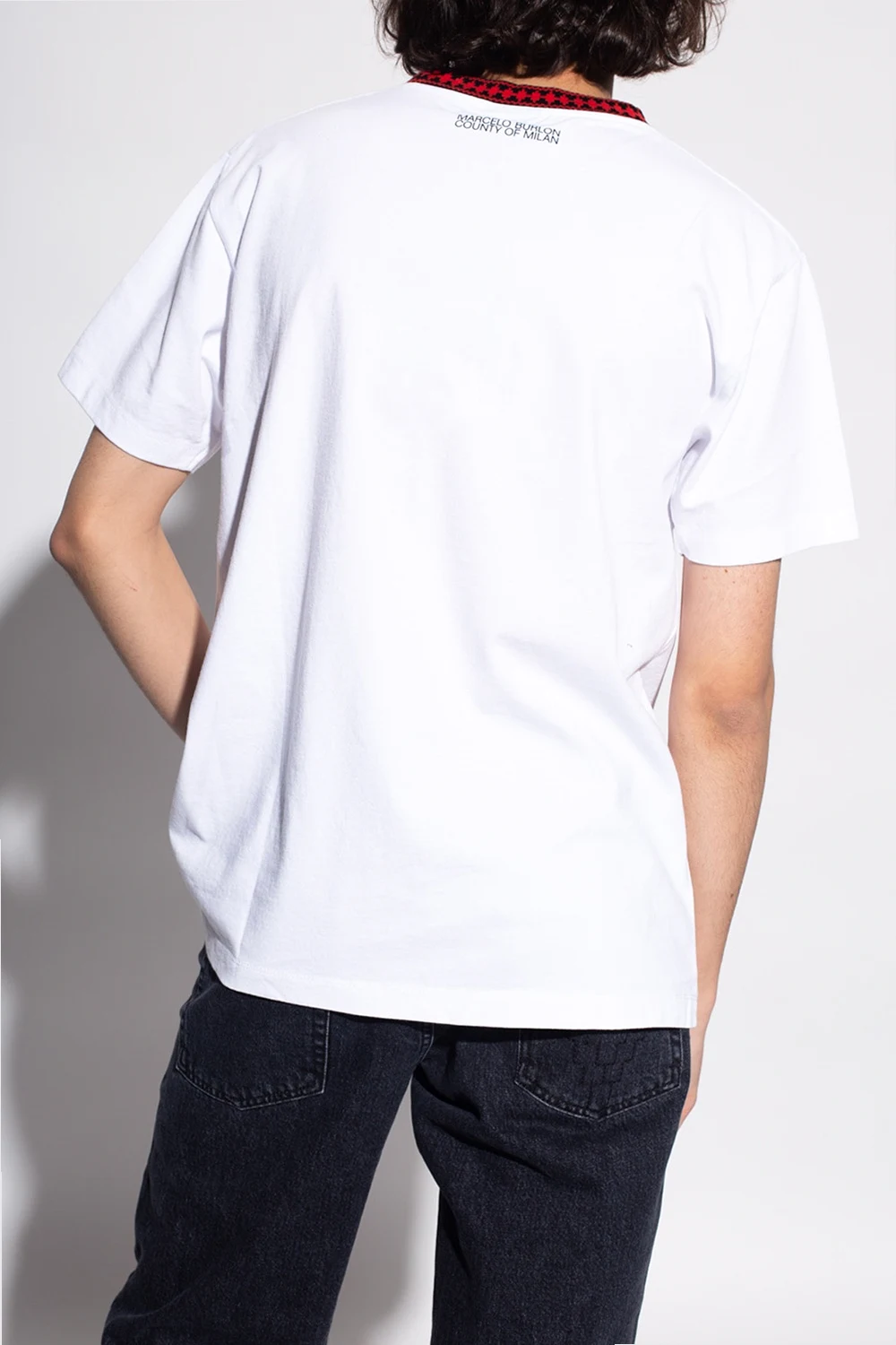 White T-shirt from Marcelo Burlon. Crafted from cotton, this short-sleeved design features a ribbed round neck decorated with an embroidered pattern in black and red.