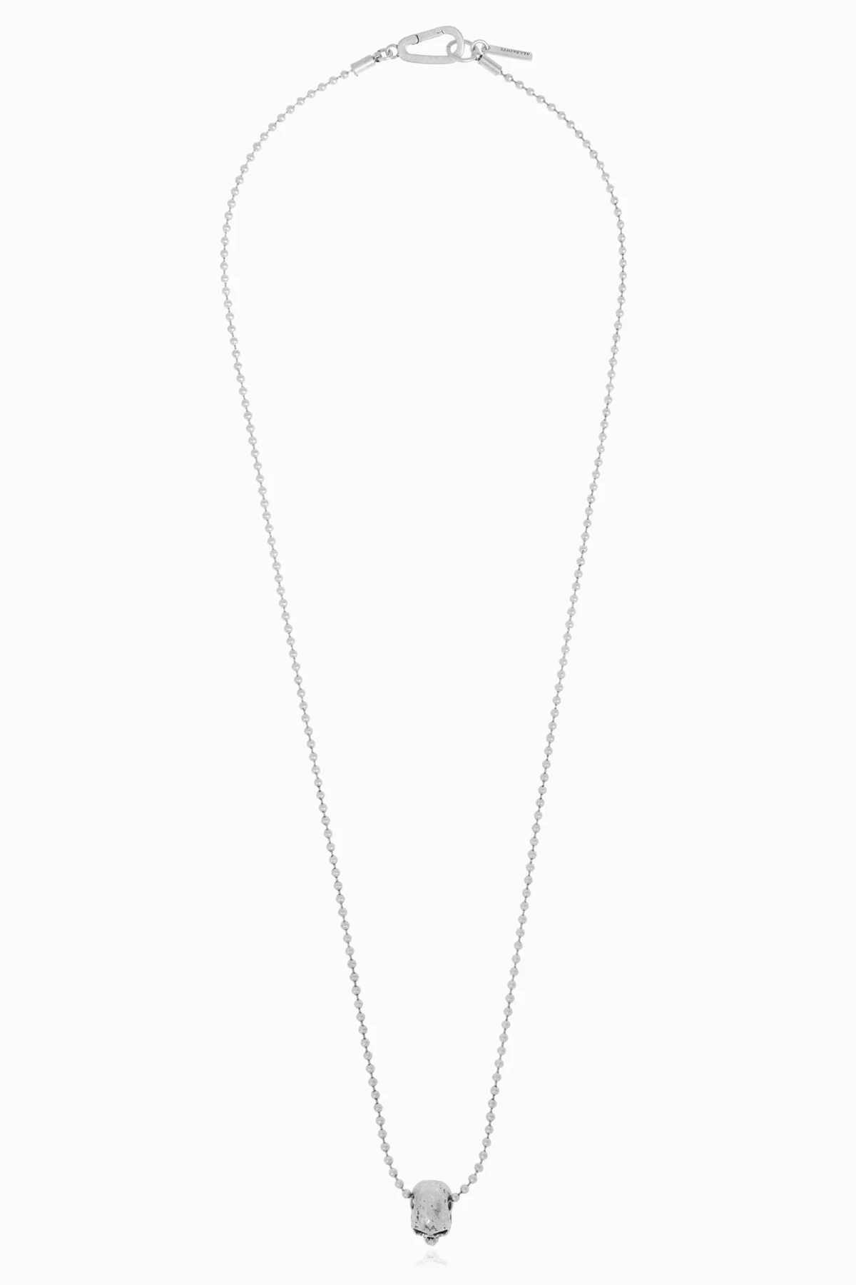 Introducing the AllSaints Brass Necklace, a masterpiece of artisan design that epitomizes both elegance and edge. Crafted from brass, this exquisite piece features a delicate chain of fine, circular links, culminating in a striking skull pendant. The pendant\'s antiqued finish imbues it with a raw, rock-inspired allure, accentuated by darkened details that dramatize the eyes and nose. Securely fastened with a classic lobster clasp, the necklace is adorned with a subtle plaque, engraved with the designer\'s name, ensuring its exclusive allure. Its silver-tone finish offers a sophisticated yet slightly brooding aesthetic, perfect for those who cherish originality and unique style. Why Purchase This Product? Distinctive design by the renowned AllSaints, a brand synonymous with innovation and individuality. Meticulously crafted with premium brass and intricate details. Exclusive engraved plaque for a touch of luxury. Secure lobster clasp for peace of mind while wearing.