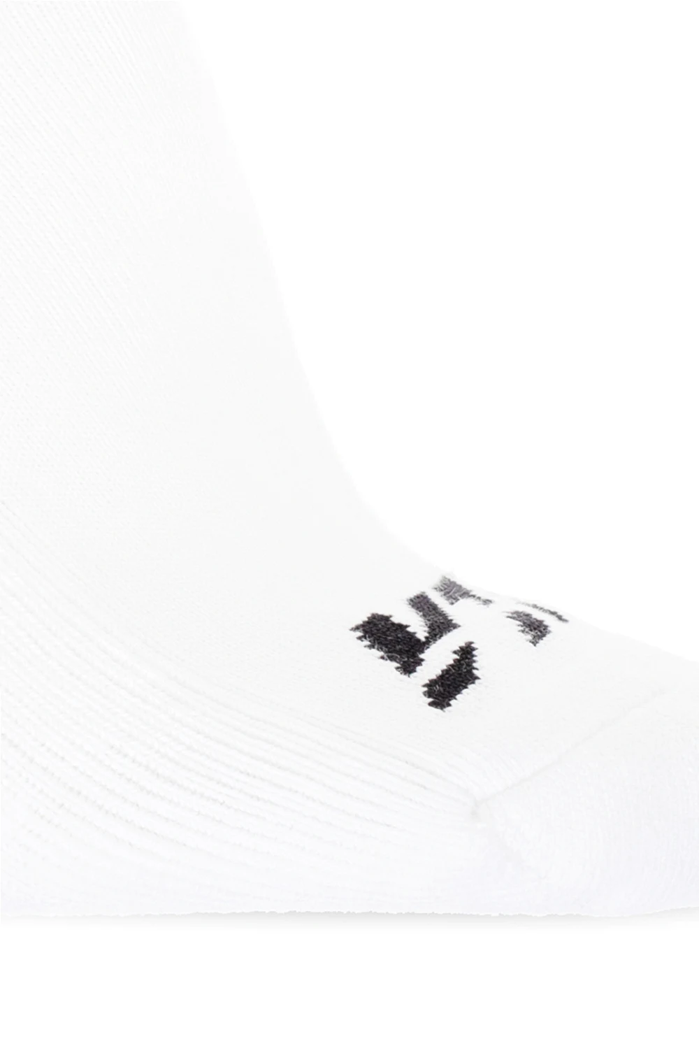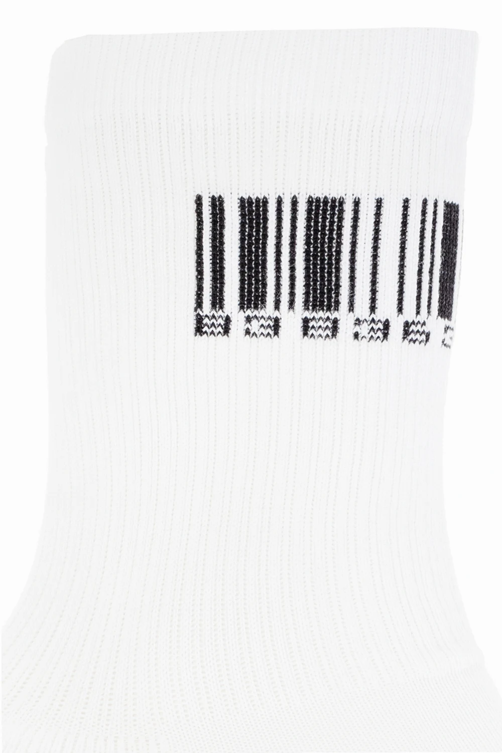 White socks from VTMNTS. Made of cotton, this pair features a ribbed cuff embroidered with the label’s signature barcode in black.