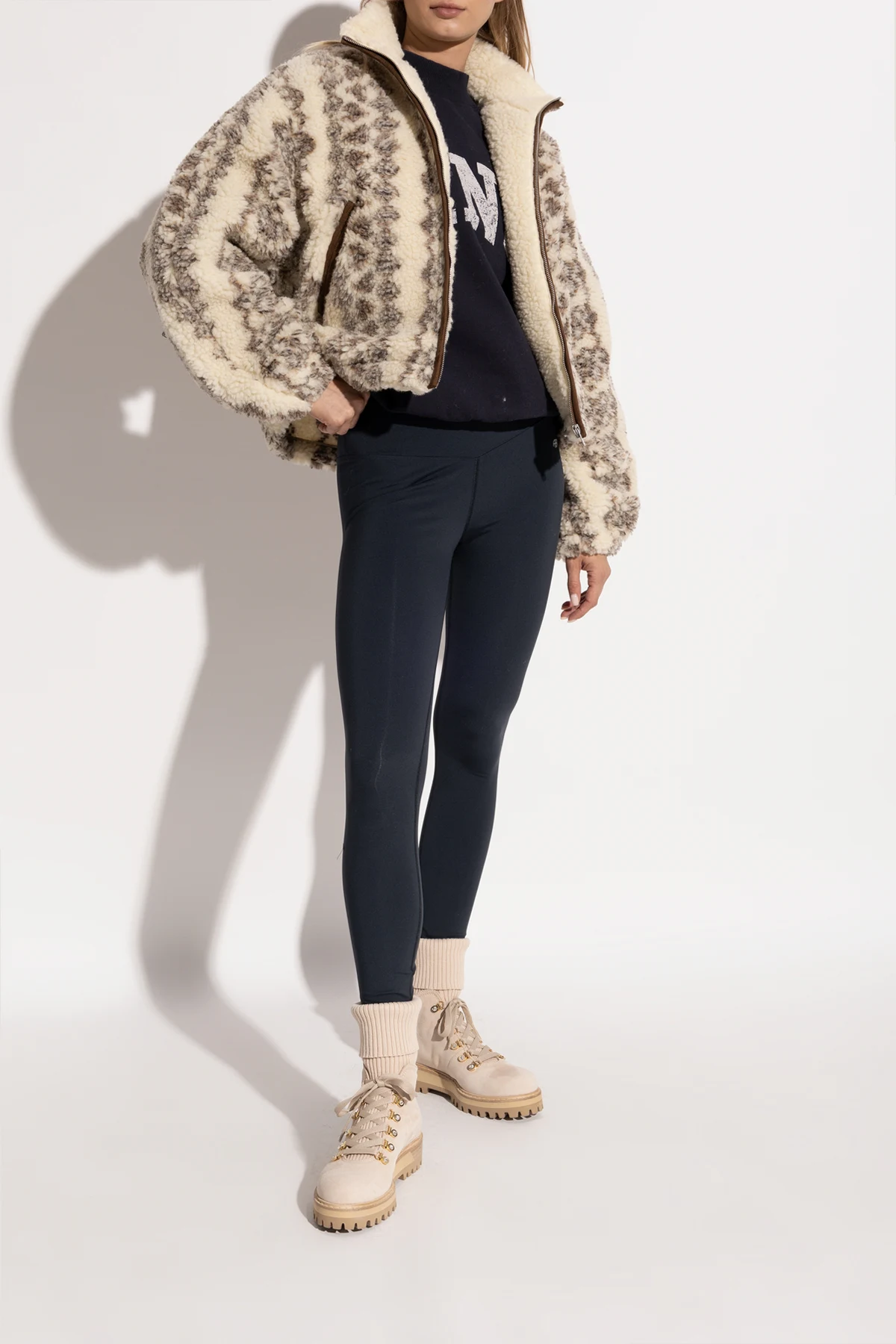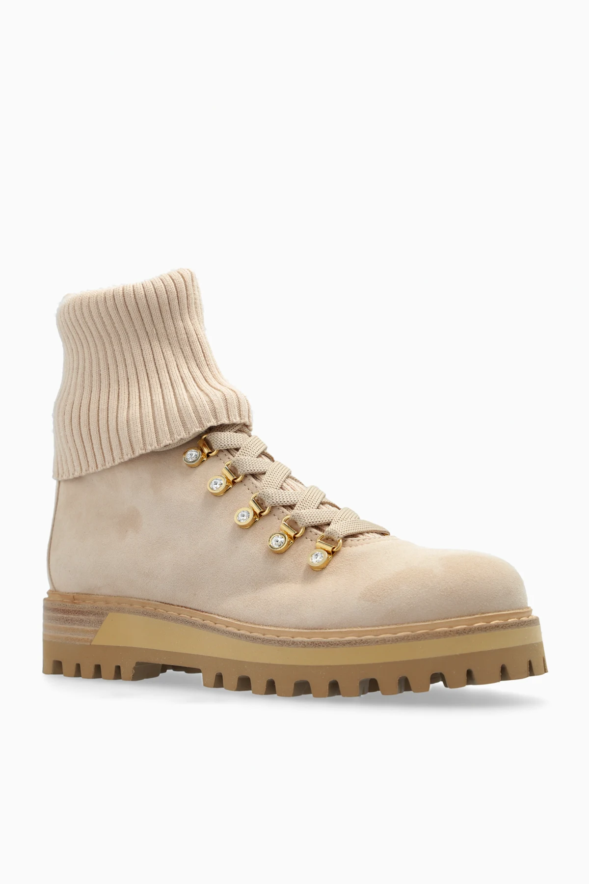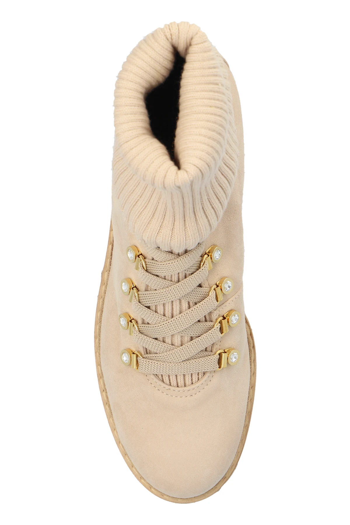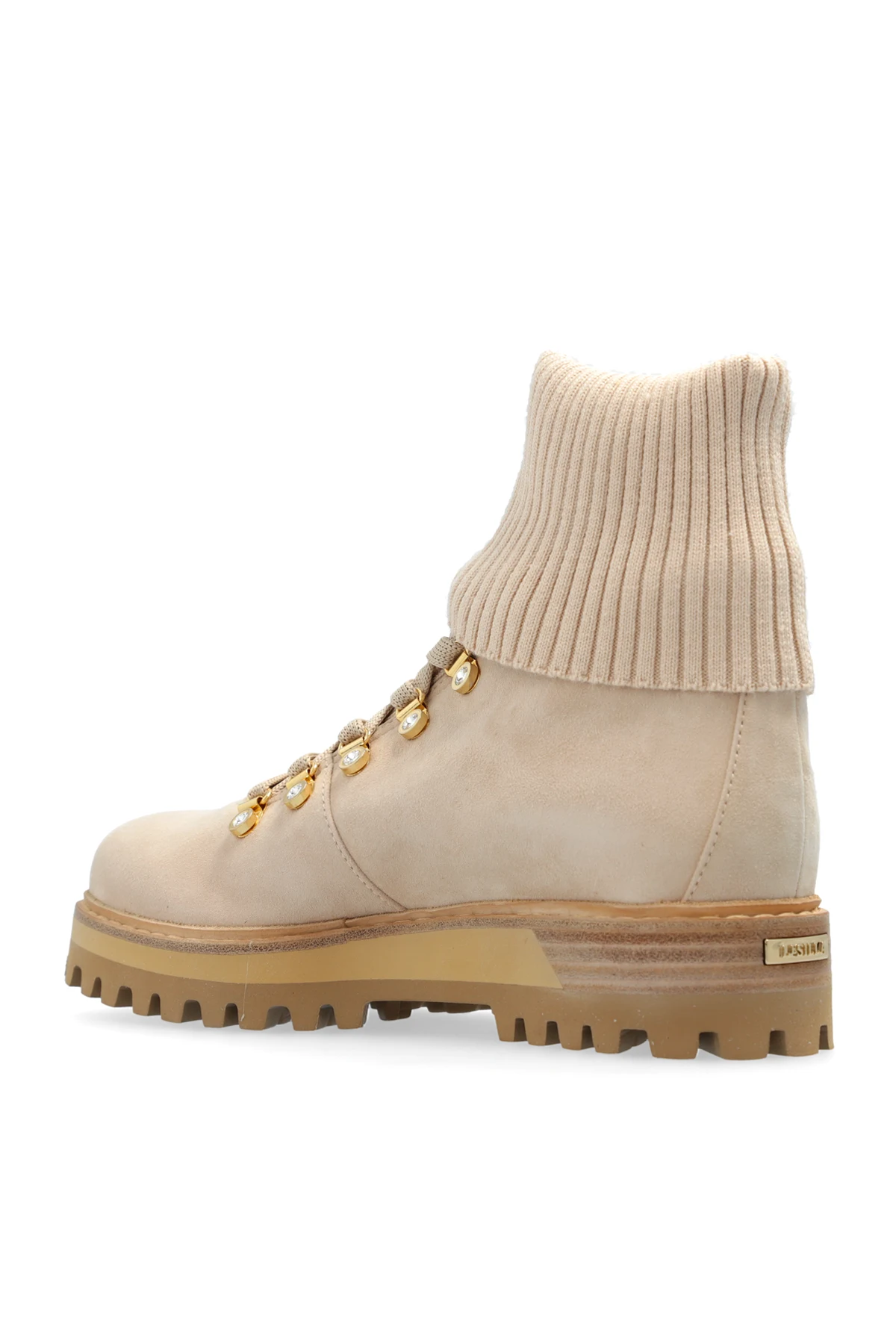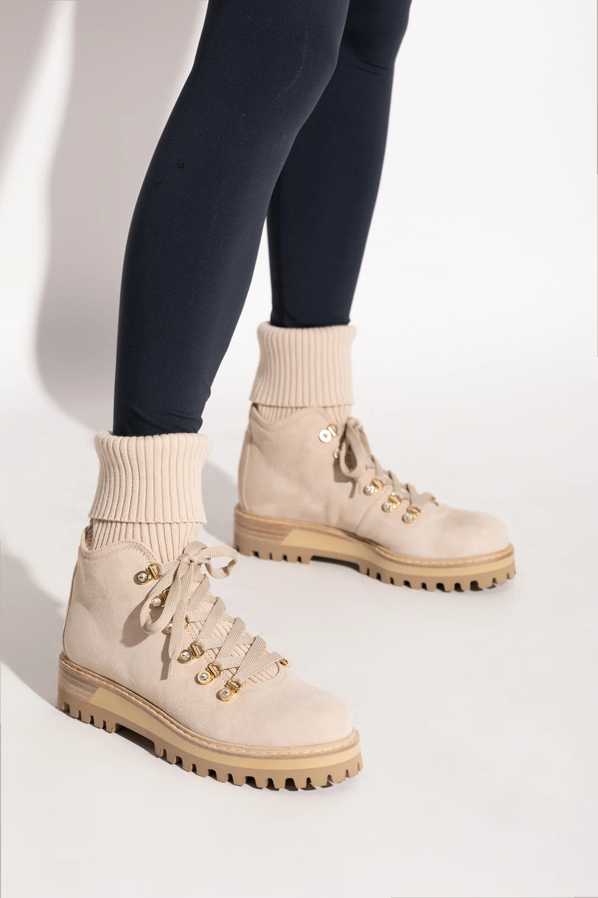 Introducing the exquisite women\'s boots, St. Moritz, by the illustrious designer Le Silla. These boots epitomize the perfect blend of classic hiking shoe design with a modern, elegant touch. Crafted from premium beige suede, these boots feature a uniquely elevated shaft, adorned with a wide, ribbed, elastic cuff, providing both comfort and warmth. The soft knit material of the cuff adds an extra layer of coziness, making them ideal for colder days. The refined details include golden eyelets for lacing, robust shoelaces for added stability, and a discreet designer logo patch on the heel, highlighting the meticulous attention to detail. The interior is luxuriously lined with supple kid leather, ensuring enduring comfort. The durable rubber sole, in a harmonious light brown hue, is designed with deep treads for superior traction across various surfaces. Reinforced around the toes and heels, these boots deliver additional protection and durability, making them as practical as they are stylish. Why Choose This Product? Exquisite blend of classic and modern design. Premium materials: beige suede exterior and kid leather interior. Comfortable and warm elastic knit cuff. Elegant golden eyelets and sturdy laces for stability. Reinforced structure for added protection. Durable rubber sole with deep treads for excellent grip.