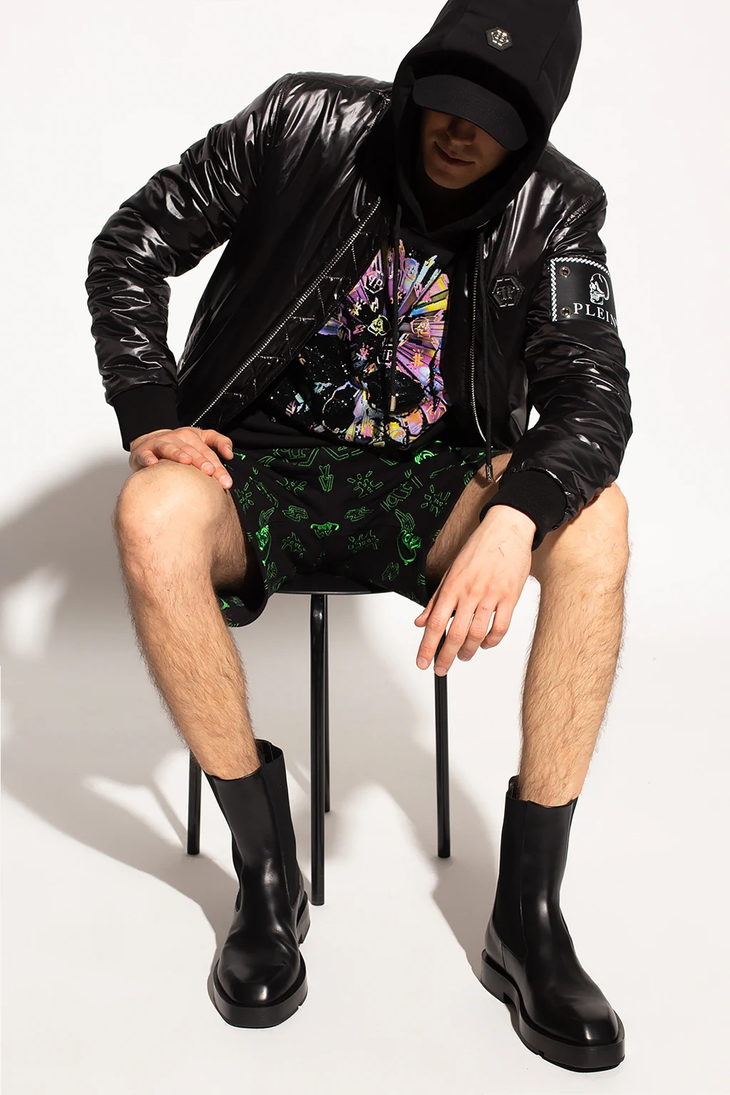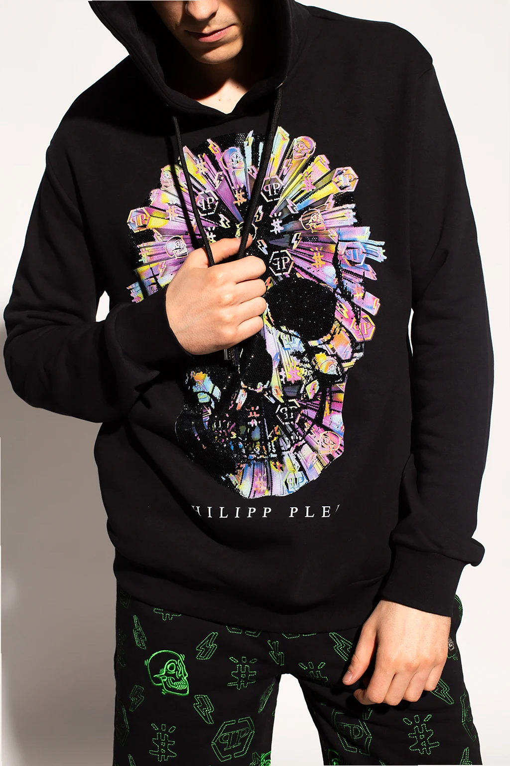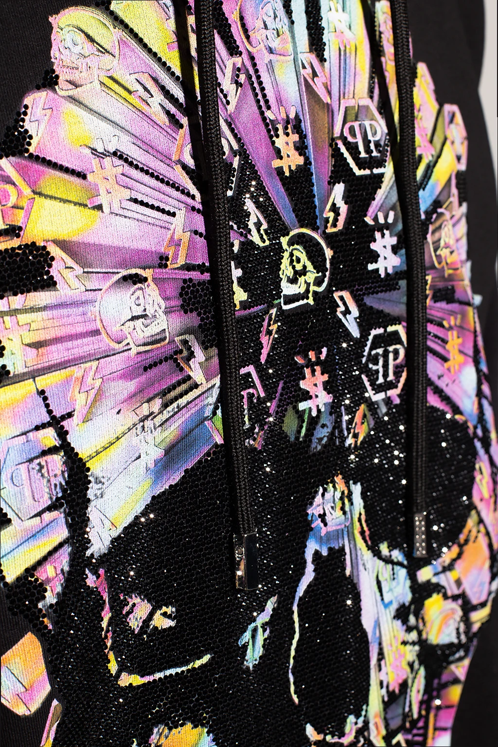 Black sweatshirt with a drawcord-adjustable hood from Philipp Plein. Crafted from cotton jersey, this hoodie showcases a black rhinestones-encrusted digital logo print on the front and two slip pockets.
