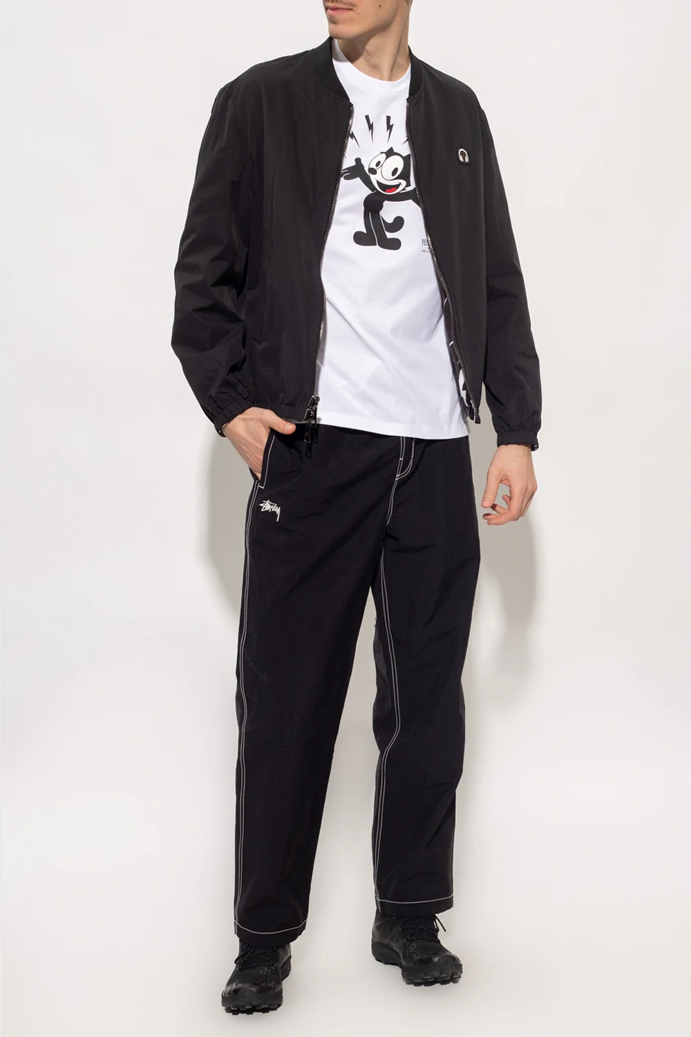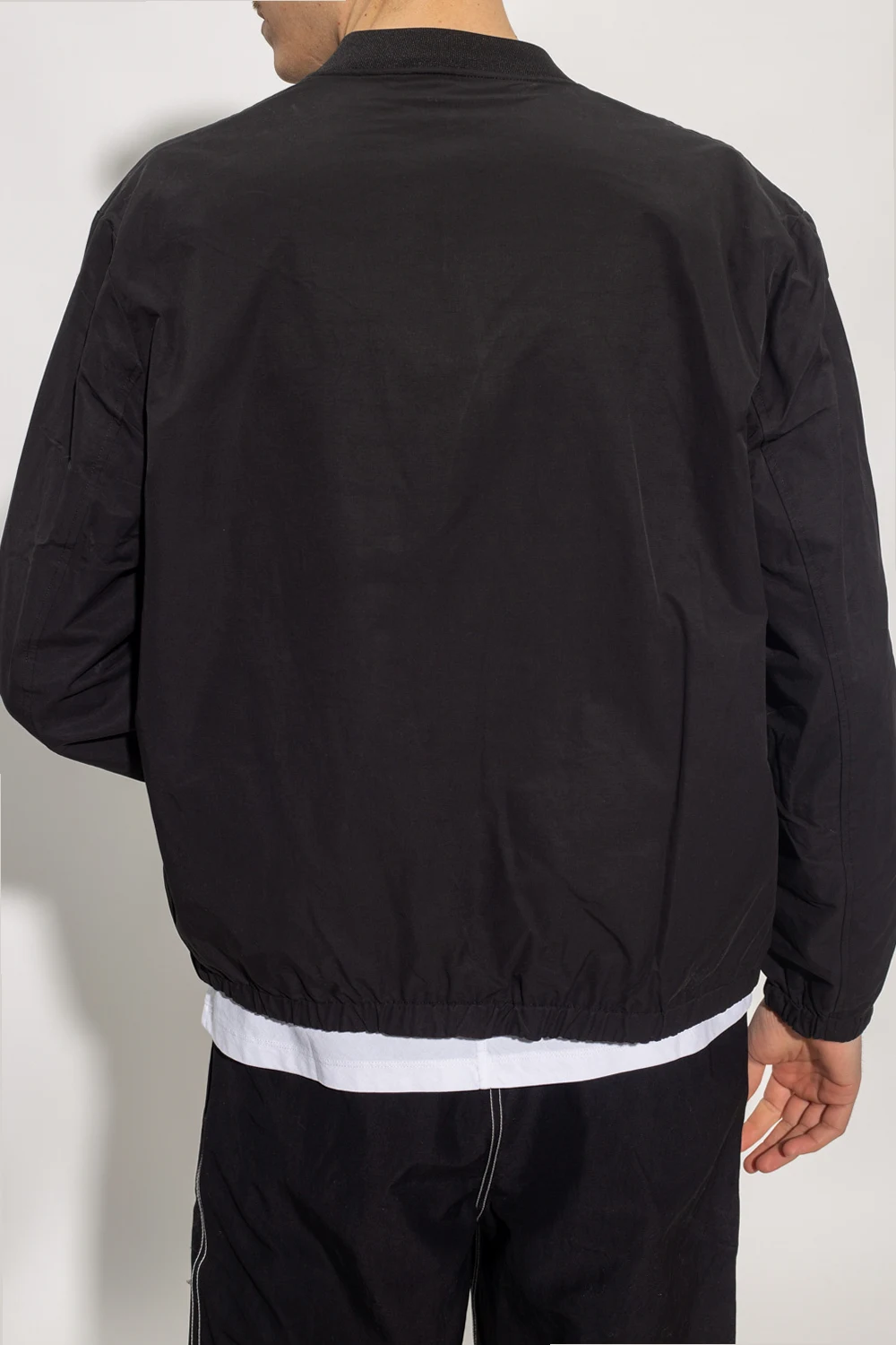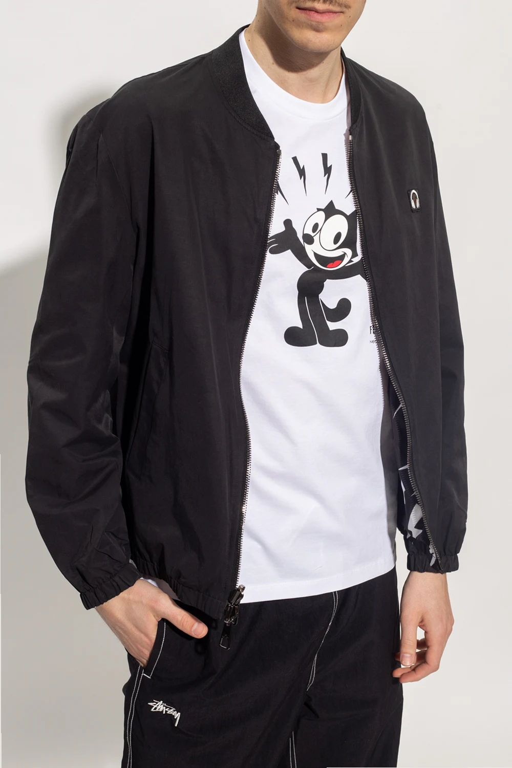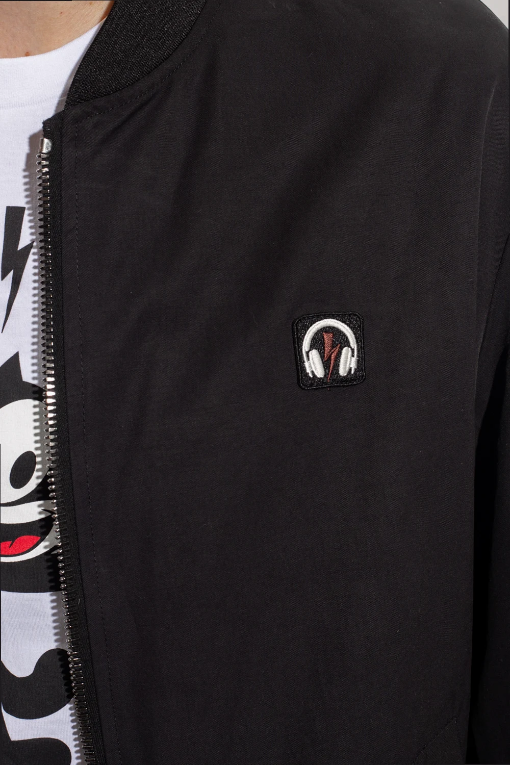 Reversible black jacket from Neil Barrett. Fastened with a two-way zip, this garment features two slip pockets, one zip pocket, ribbed collar as well as an elasticated hem and cuffs. One side with smooth and features a patch, the other side is decorated with a white print.