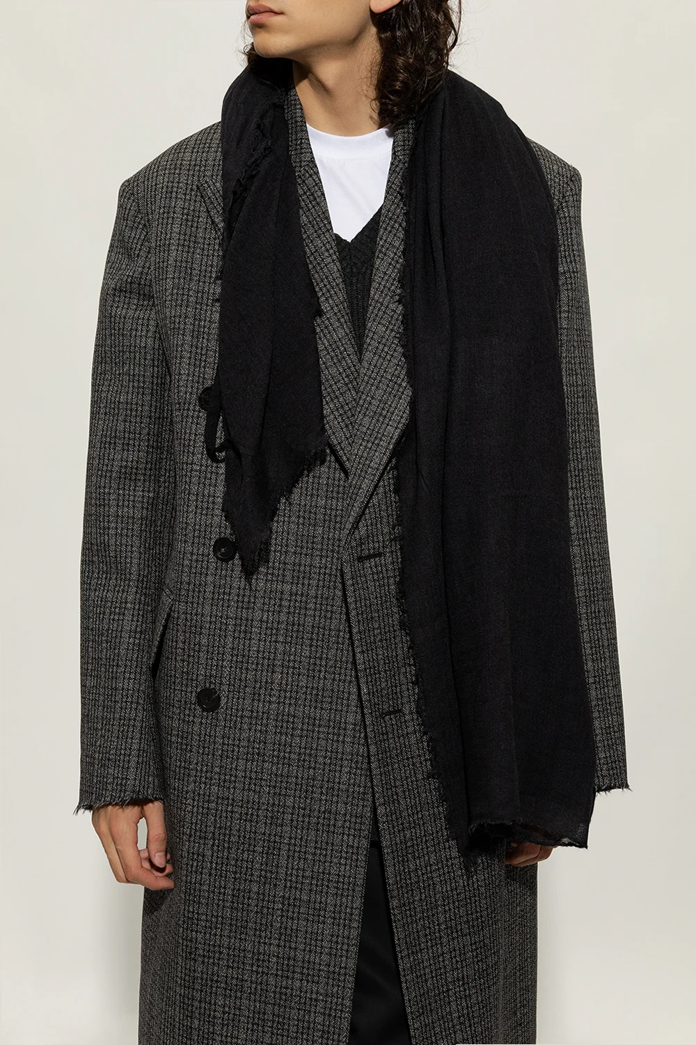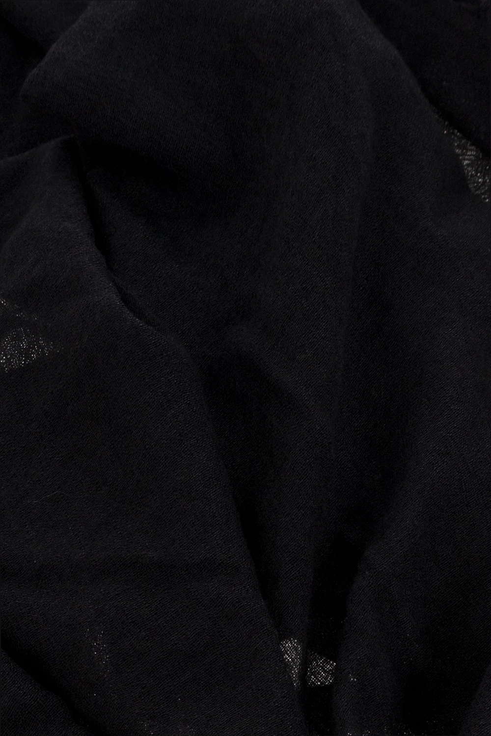 Black scarf from Ann Demeulemeester. Crafted from a wool, silk and cashmere blend, this item showcases frayed edhes and a strap with embroidered ‘What Remains Is Future’ appliqués.