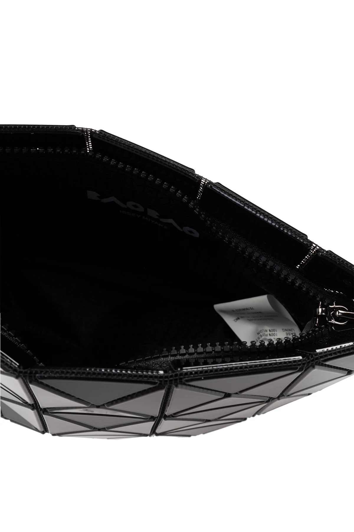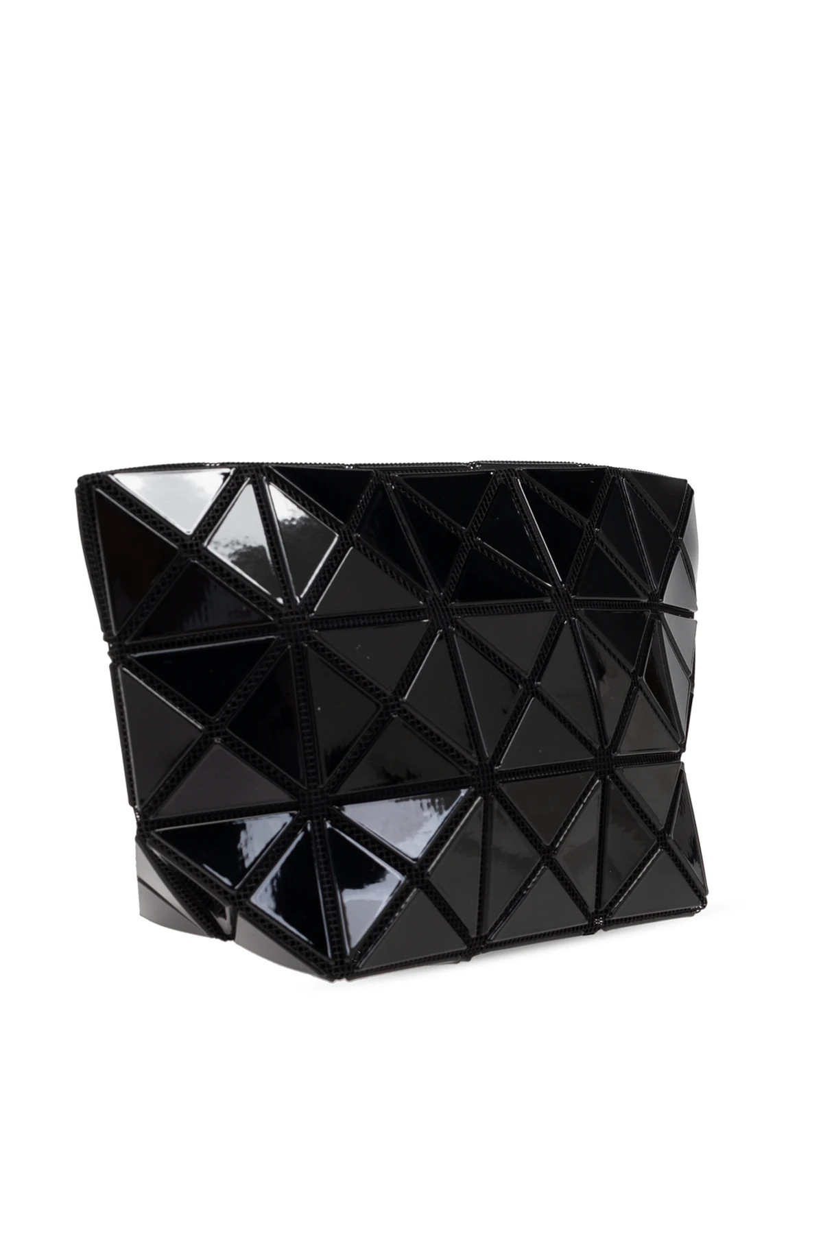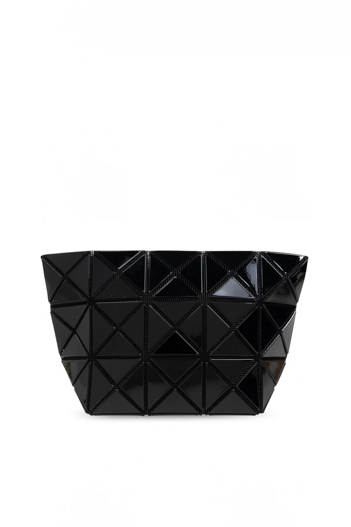Introducing the Cosmetic Bag by Bao Bao Issey Miyake, a paragon of modern luxury and avant-garde design. This exquisite accessory, part of our exclusive WOMEN, ACCESSORIES, SMALL ACCESSORIES, COSMETIC collection, epitomizes the perfect blend of elegance and functionality. Boasting a distinctive trapezoidal shape, this cosmetic bag is broad at the top and narrows towards the base, offering a unique silhouette. The exterior is adorned with a mesmerizing geometric pattern of numerous small, gleaming triangles, creating a stunning mosaic and three-dimensional effect. This gives the bag a contemporary, futuristic allure. Crafted from a glossy, black material, likely either high-quality synthetic or lacquered leather, it exudes sophistication and luxury. The deep, rich black hue further enhances its elegance, making it a versatile accessory for any style. The bag is secured with a zip closure, ensuring the safety of your essentials. Inside, the monochromatic black interior houses a label bearing the designer\'s logo, affirming its authenticity and prestige. Why Choose This Product? Unique Design: Trapezoidal shape with a geometric, 3D pattern. High-Quality Materials: Glossy, luxurious black material. Secure Storage: Zip closure for added security. Authenticity: Interior designer logo label.