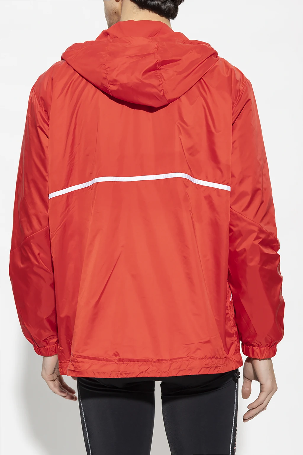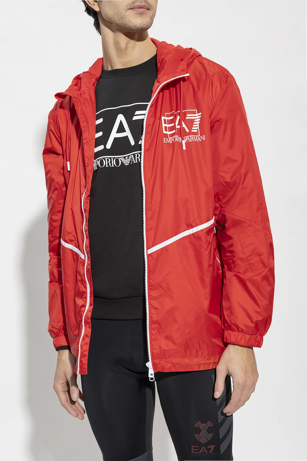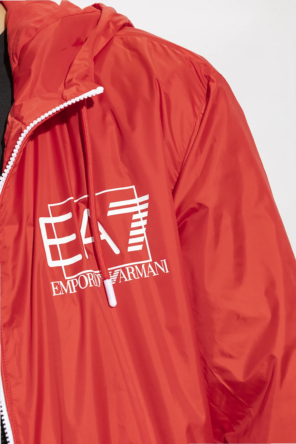 Red and white jacket from EA7 Emporio Armani, the ‘Sustainable’ collection. Fastened with a two-way zip, this design features drawstrings at the hood and hem, white logo print, two front zip pockets, long sleeves and cotton lining.