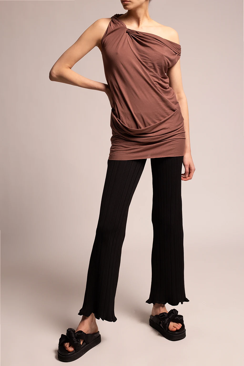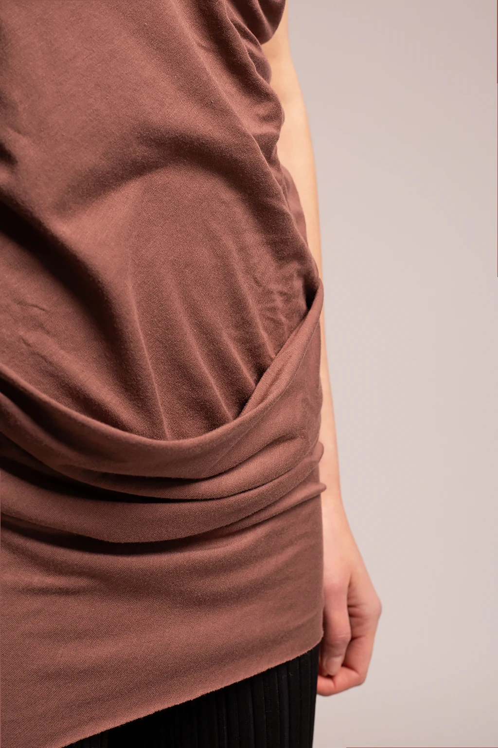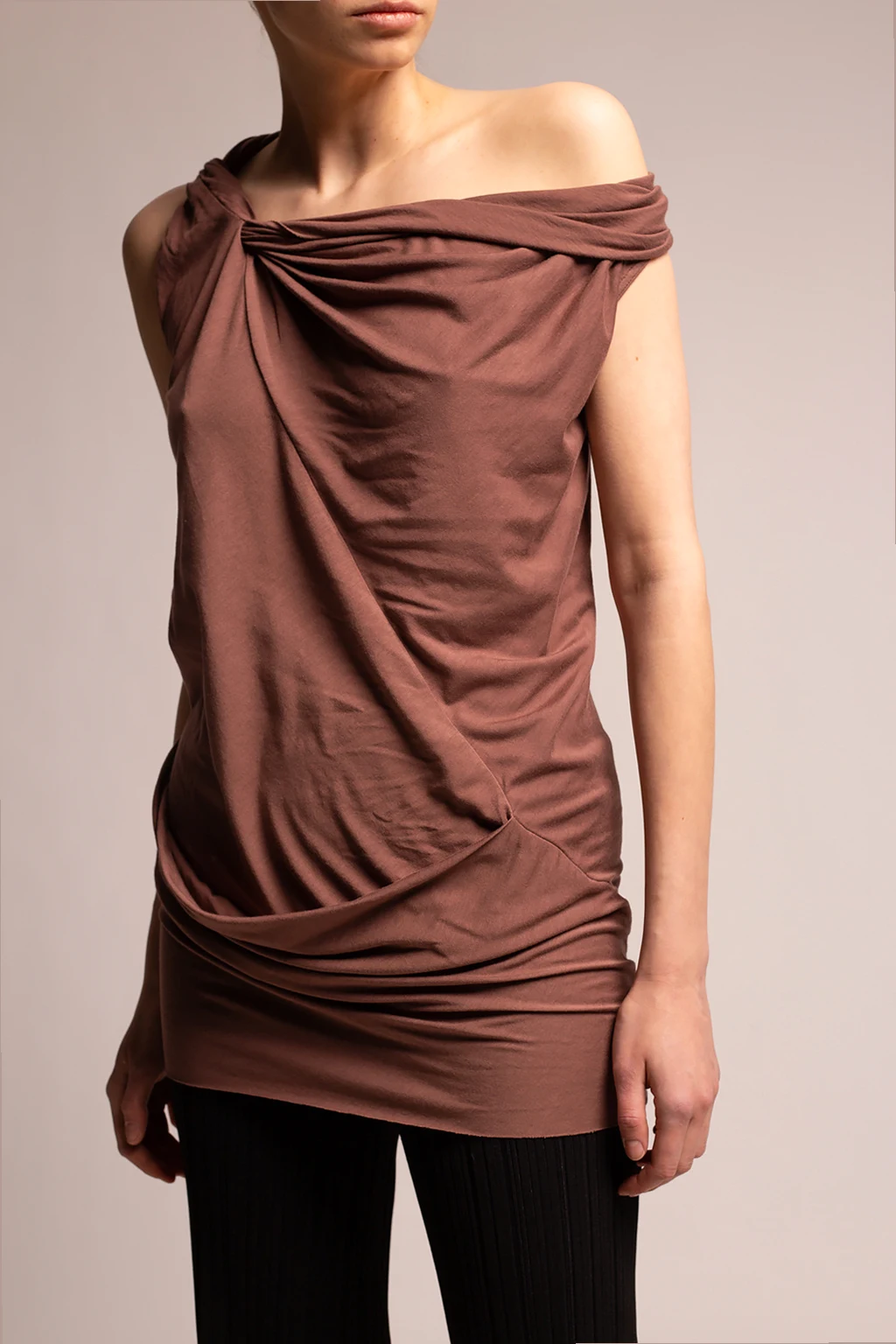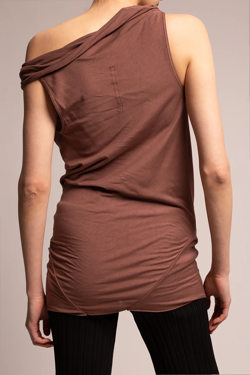 Brown tank top from Rick Owens Lilies. Crafted from a stretch cotton blend, this style features a decorative cowl neck and exposed stitching details.