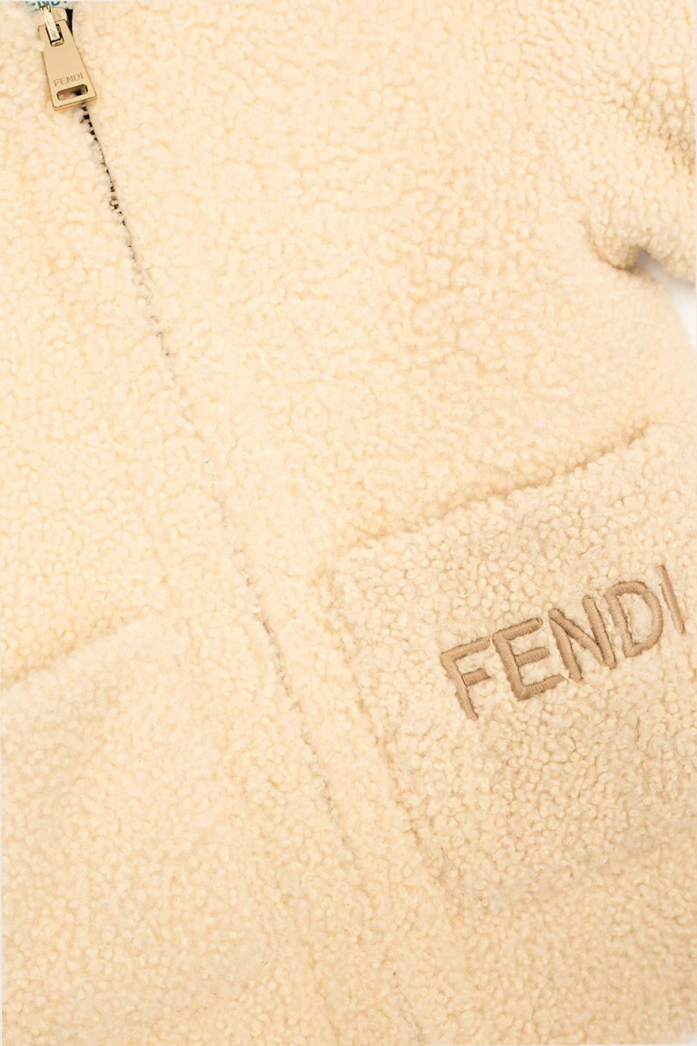 Cream hooded jacket from Fendi Kids. Made of lamb leather, this garment features a zip fastening, logo embroidery, two slip pockets and long sleeves with ribbed cuffs.
