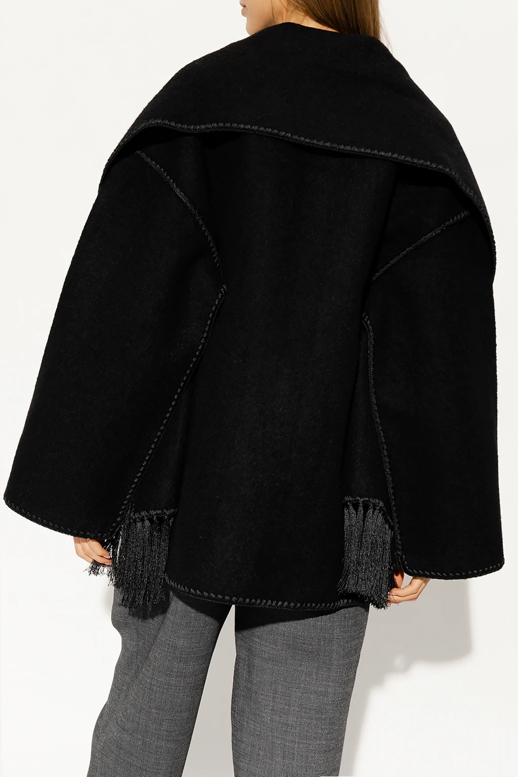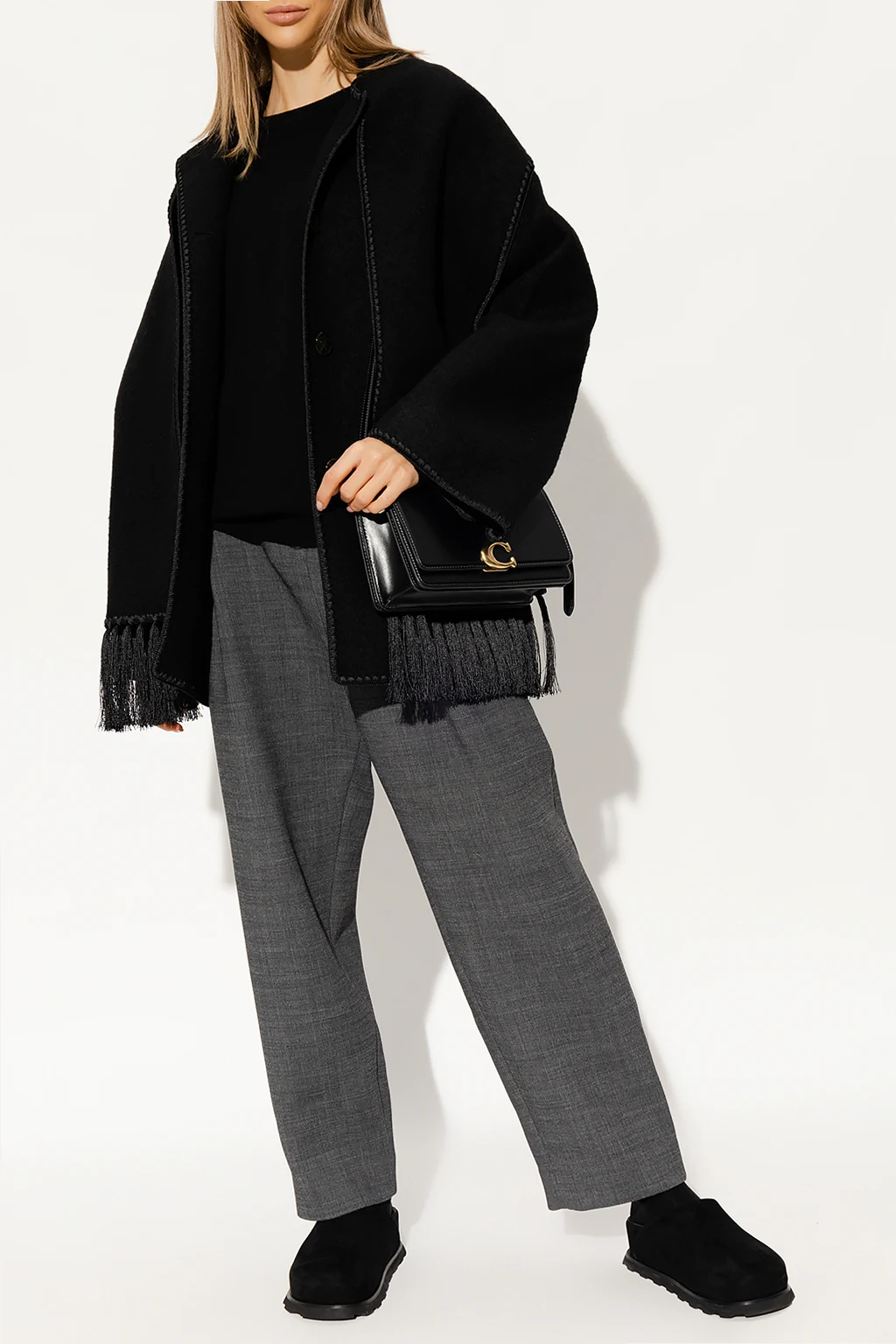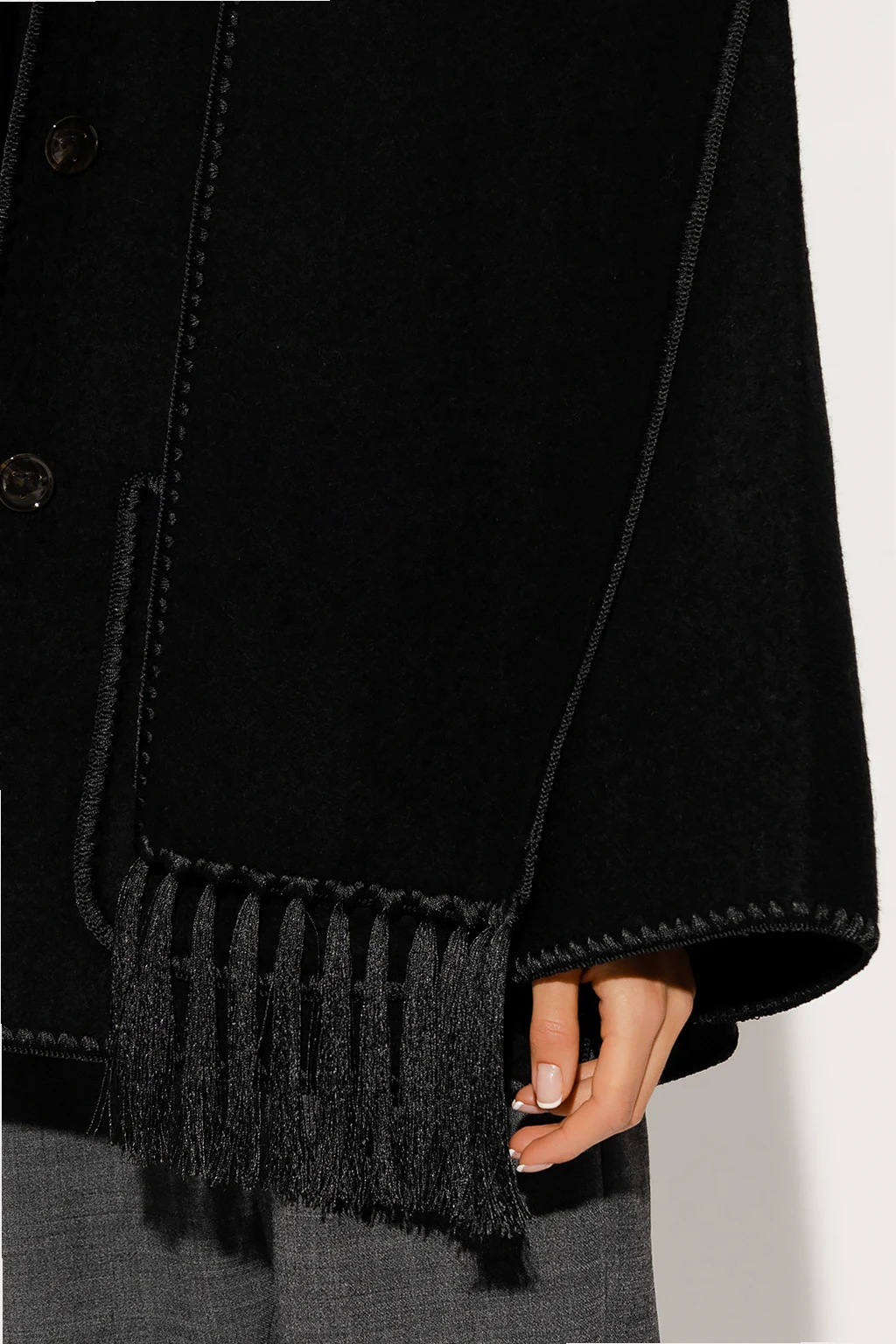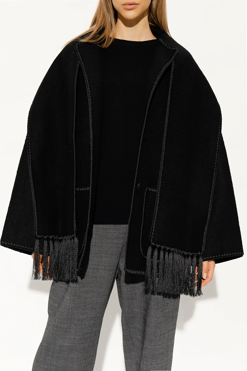 Black coat from Toteme. Crafted from wool with a relaxed silhouette, this style features a short length, button fastenings, distinctive stitching details, two slip pockets, a fringed collar and long sleeves.