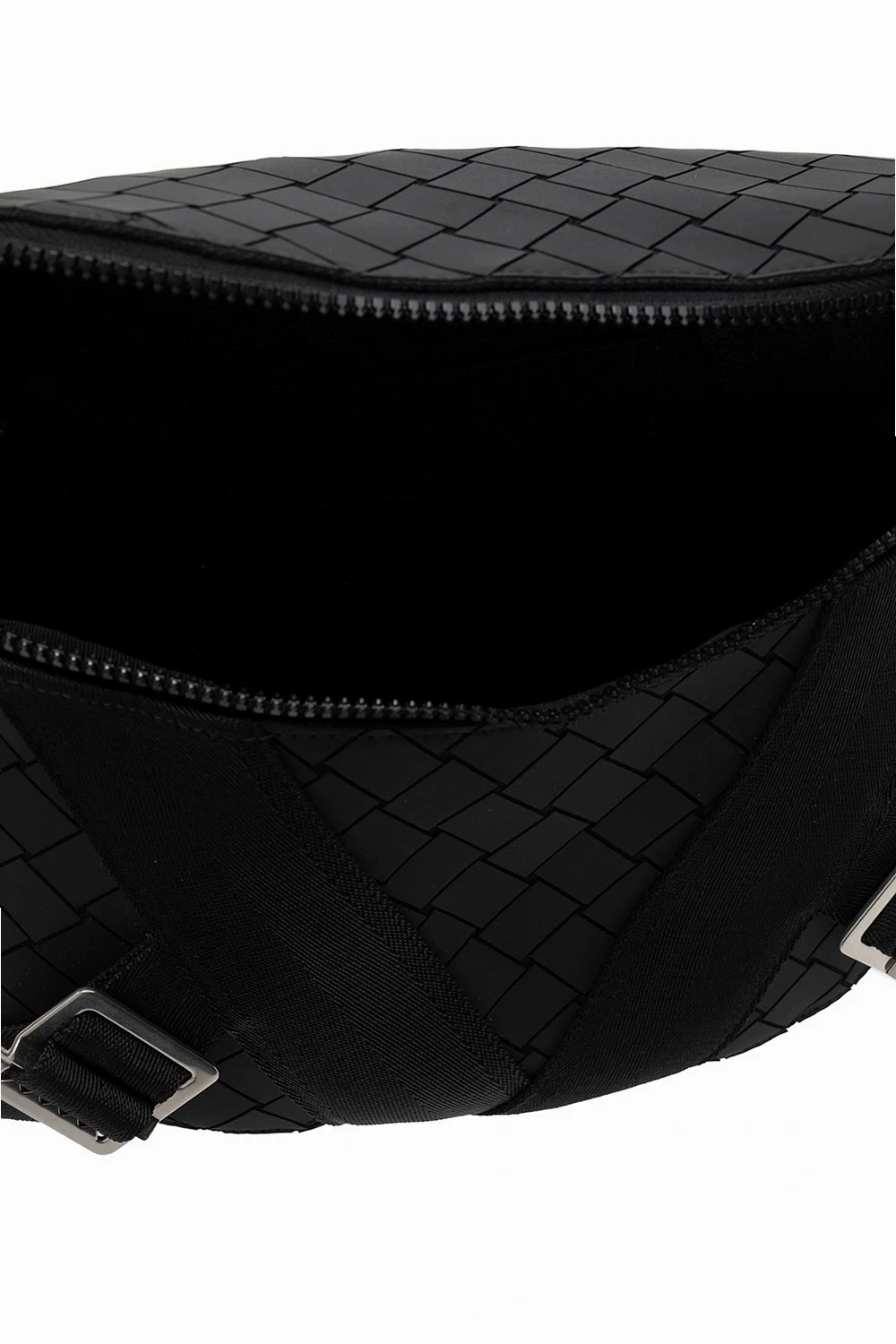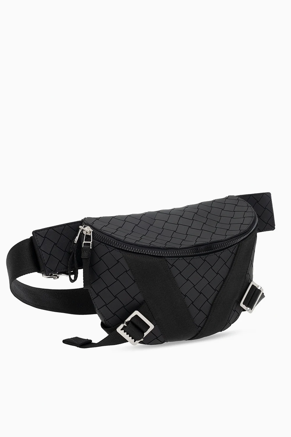 Black belt bag from Bottega Veneta. Enriched by a laser-cut Intrecciato pattern, this design secures with a zip and features decorative buckle straps on the front, an adjustable strap, silver-tone metal hardware and one internal compartment.
