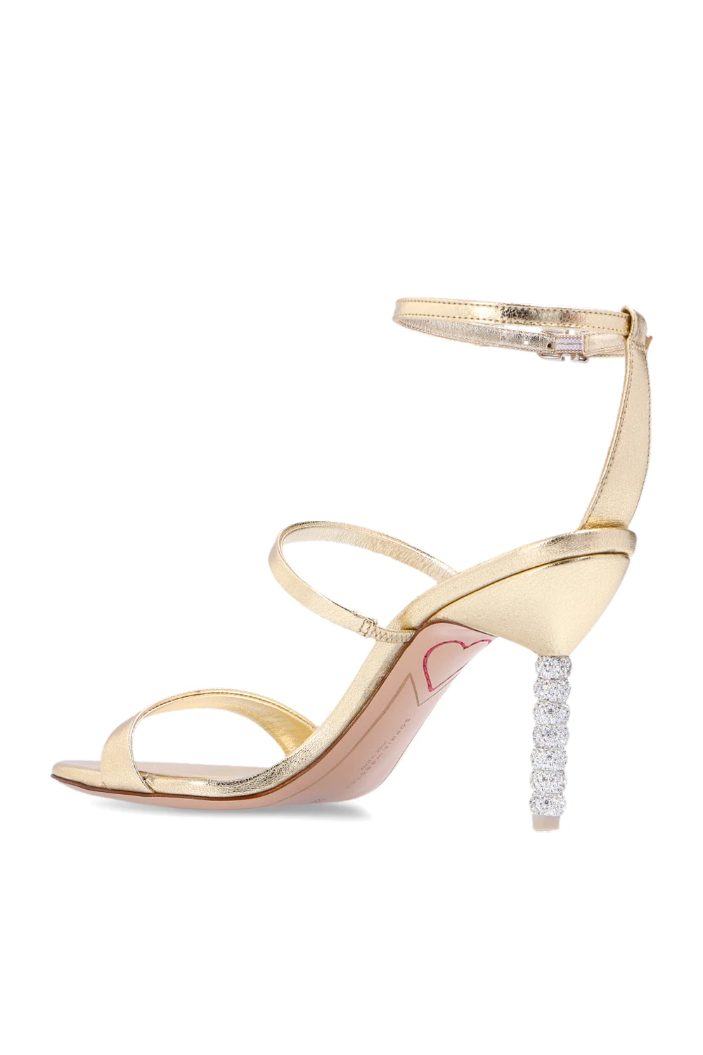 Gold-tone ‘Rosalind’ heeled sandals from Sophia Webster. Crafted from leather, this model secures with a buckle ankle strap and showcases a decorative heel and a beige leather sole.