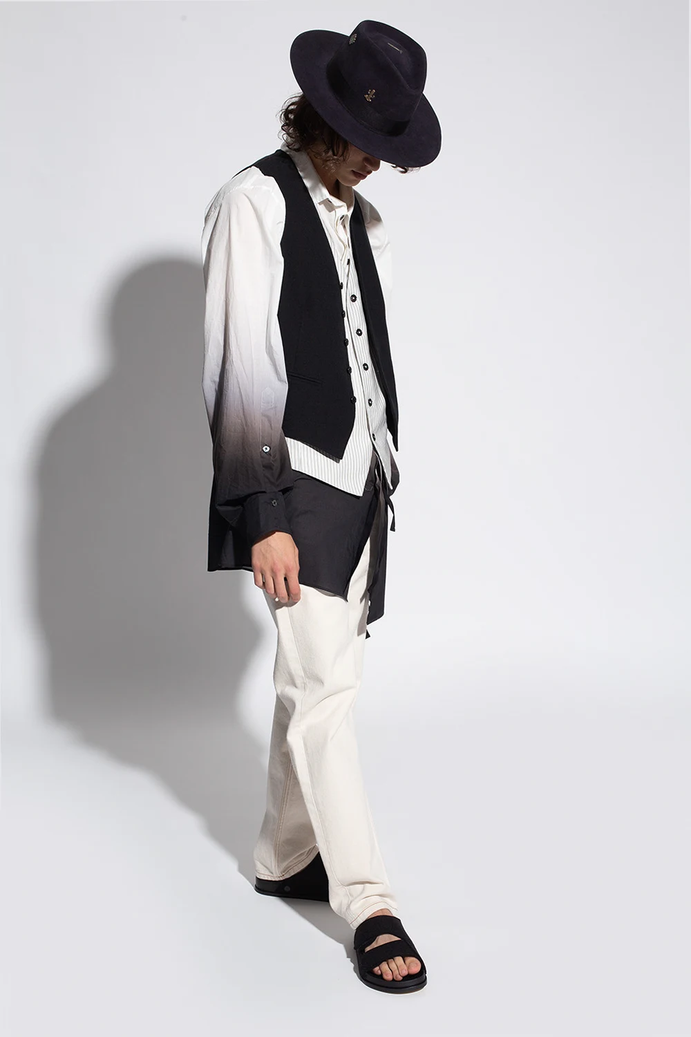 Black ‘The Forager’ slides from Birkenstock x Toogood. Made of felt, this pair fastens with velcro and is set on a black sole made of cork and EVA foam.