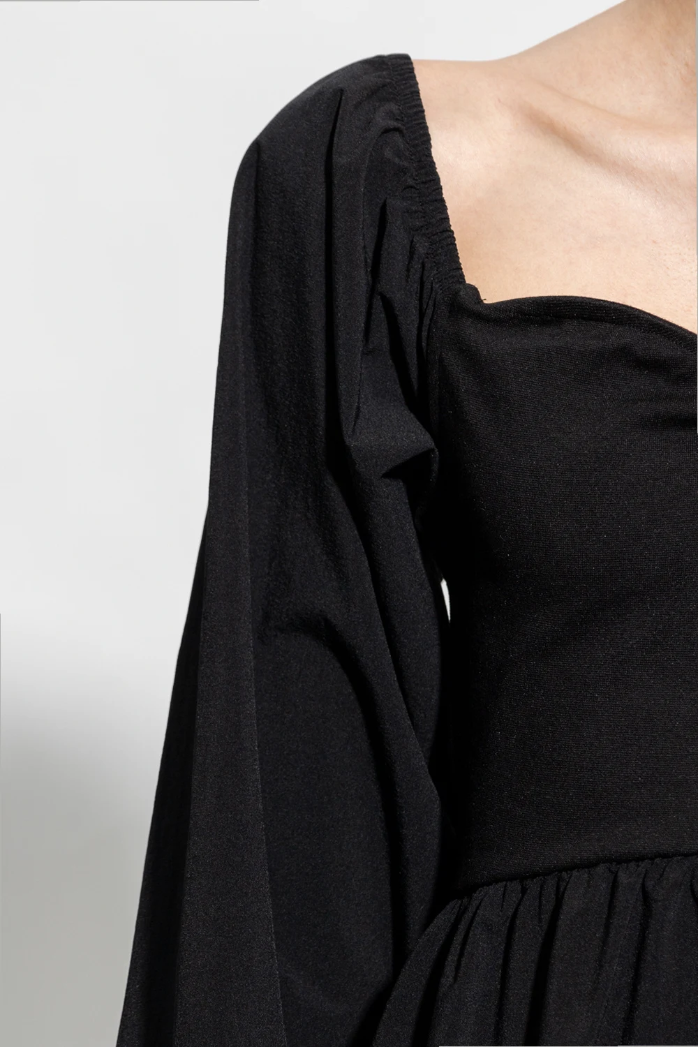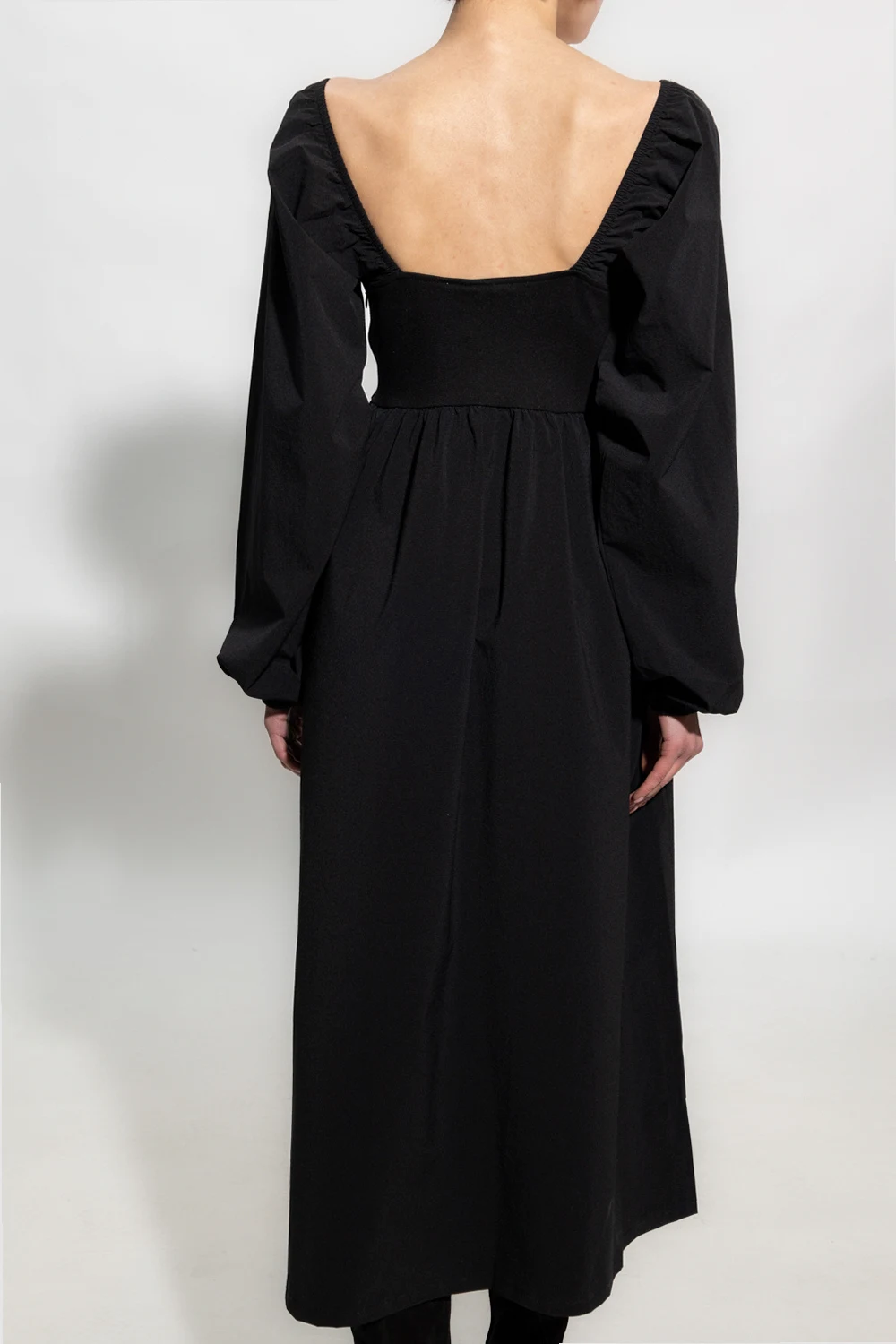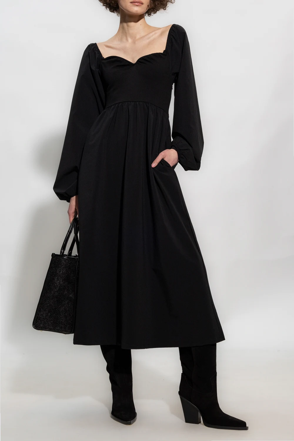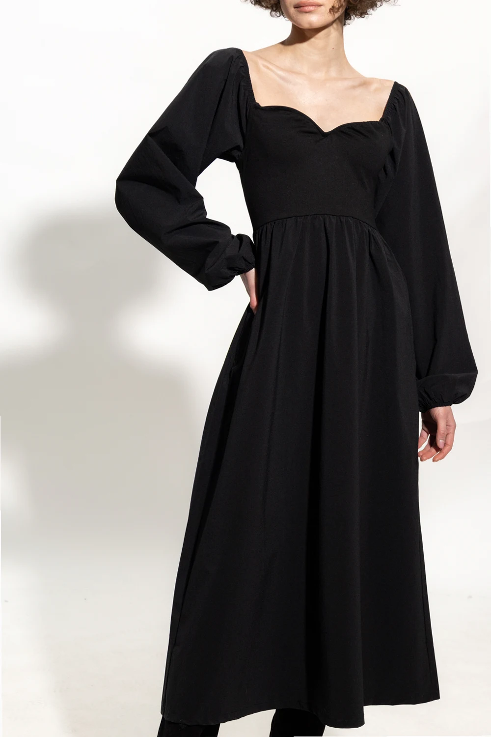 Black ‘MistGZ’ dress from Gestuz. Crafted in part from LENZING™ECOVERO™ viscose, this style fastens with a hidden back zipper and features a form-fitting bodice with a heart-shaped neckline with boning detailing, puff long sleeves with elasticated cuffs and a flared hem with two slip pockets.