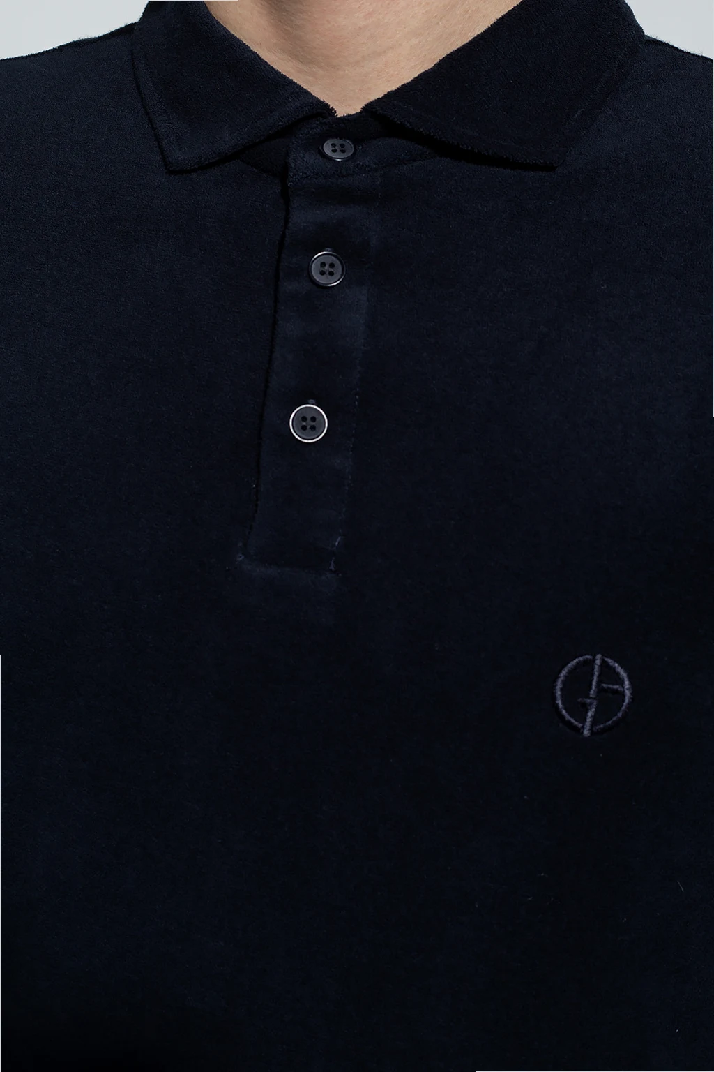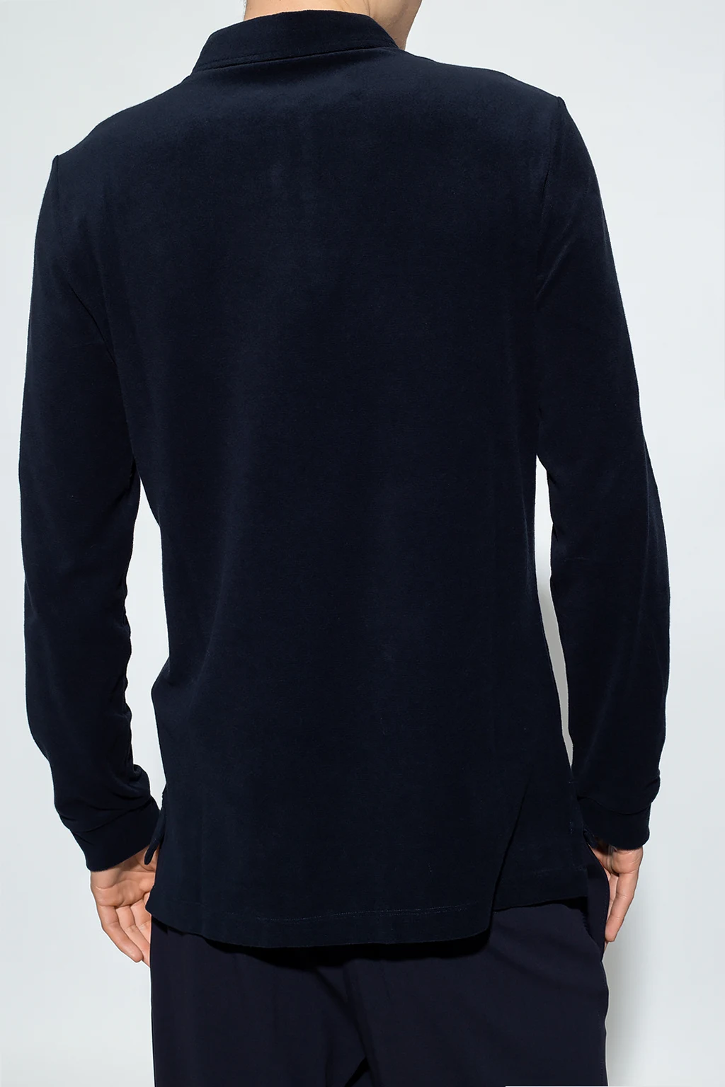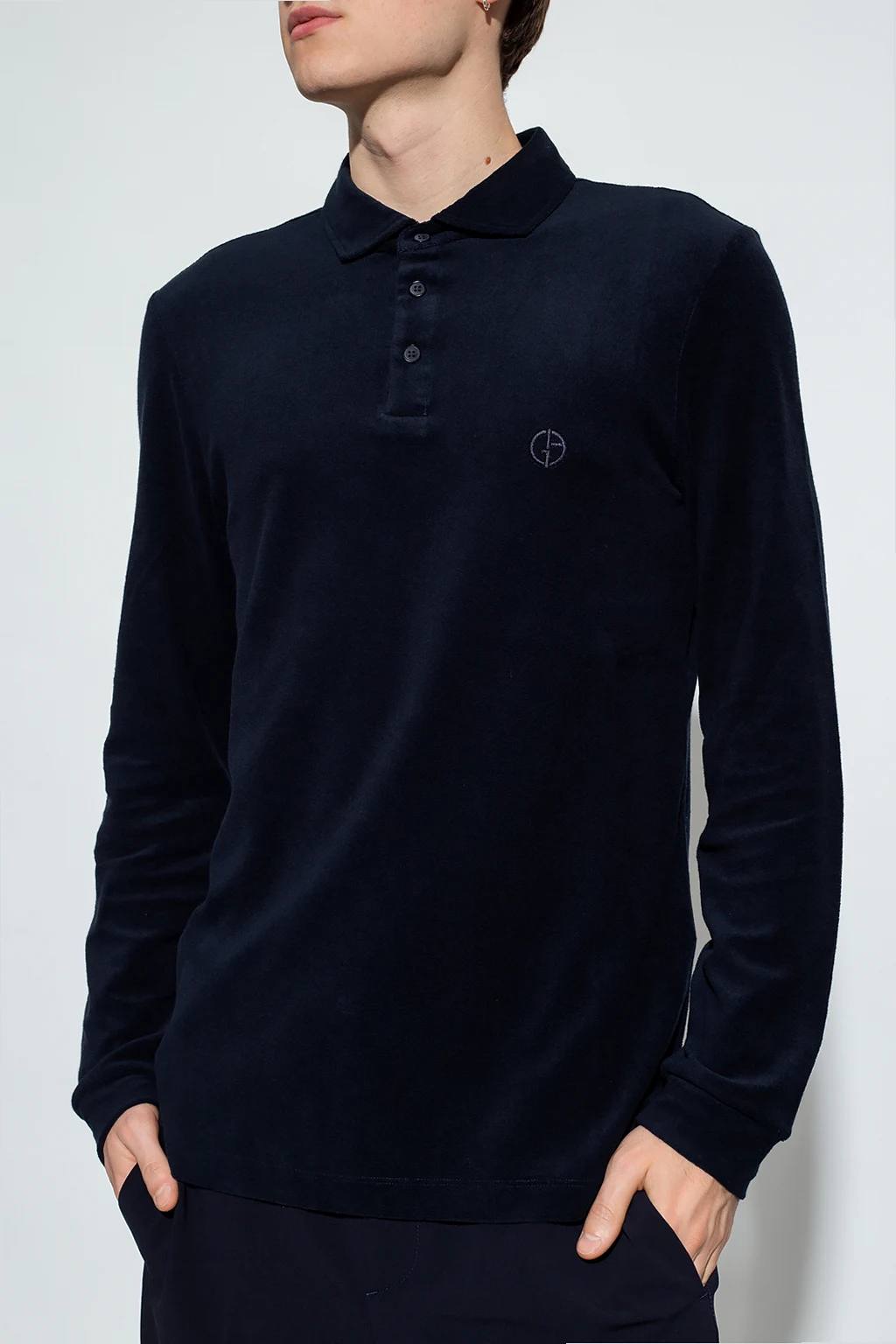 Navy blue polo shirt from Giorgio Armani. Crafted from a cotton blend, this style features button fastenings, an embroidered logo on the front, side splits on the bottom and long sleeves with elasticated cuffs.