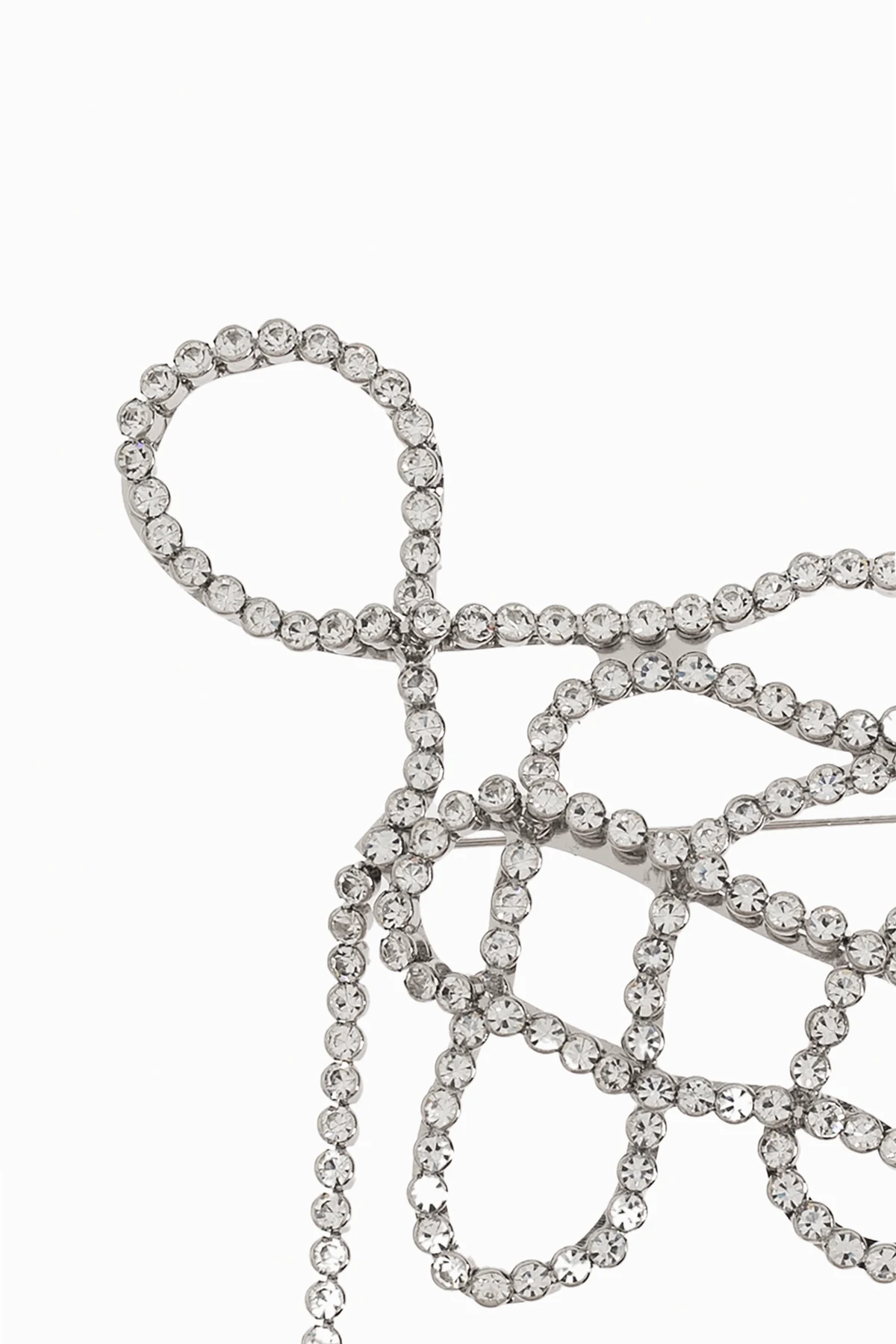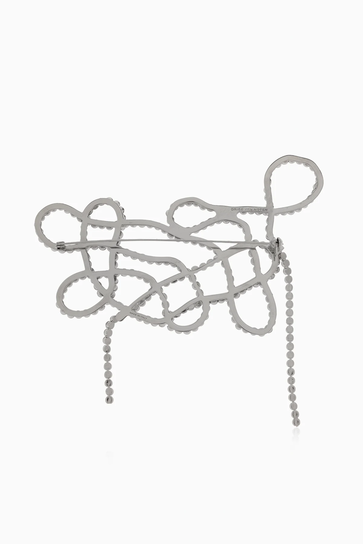 Introducing the Mosiężna Brooch, a masterpiece of artistry and elegance, crafted from shimmering, silver-toned elements that resemble fine crystals. This exquisite accessory, designed by the renowned Dries Van Noten, boasts a complex, artistic form featuring loops and intersecting lines, creating an abstract pattern that is both modern and luxurious. The brooch is large and striking, ideal for adorning formal attire and elevating any ensemble with its opulent charm. Fashioned from high-quality materials, it is composed of mosiądz and stras, ensuring durability and a lustrous finish. The brooch is showcased on a blazer, exemplifying its function as a sophisticated garment embellishment. Why Choose This Product? Designed by Dries Van Noten – A luminary of the Antwerp Six, celebrated for revolutionary aesthetics. Unique Artistic Design – An abstract pattern that captivates and inspires. High-Quality Finish – Made with premium materials, offering both beauty and resilience. Versatile Elegance – Perfect for adding a touch of sophistication to formal outfits.