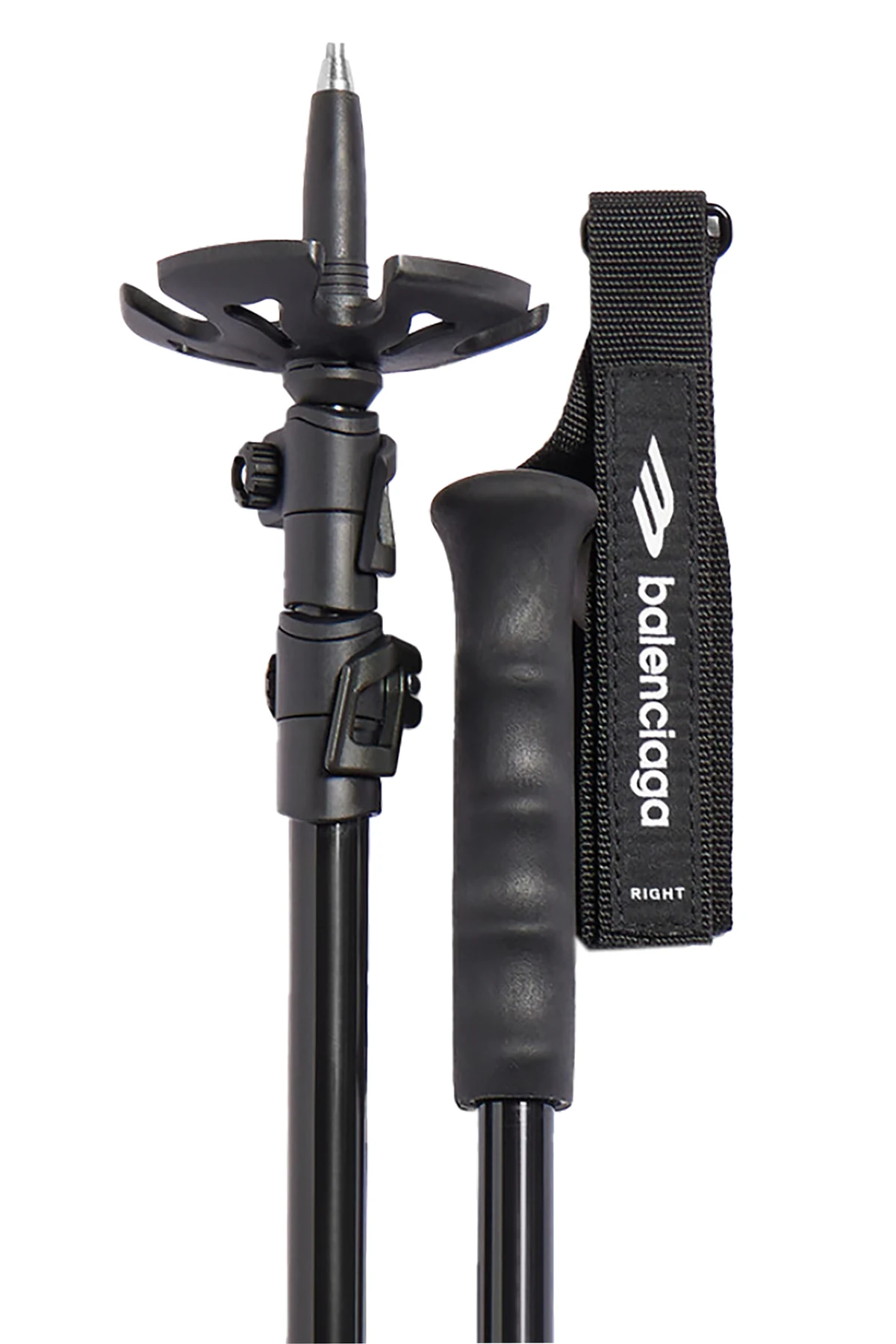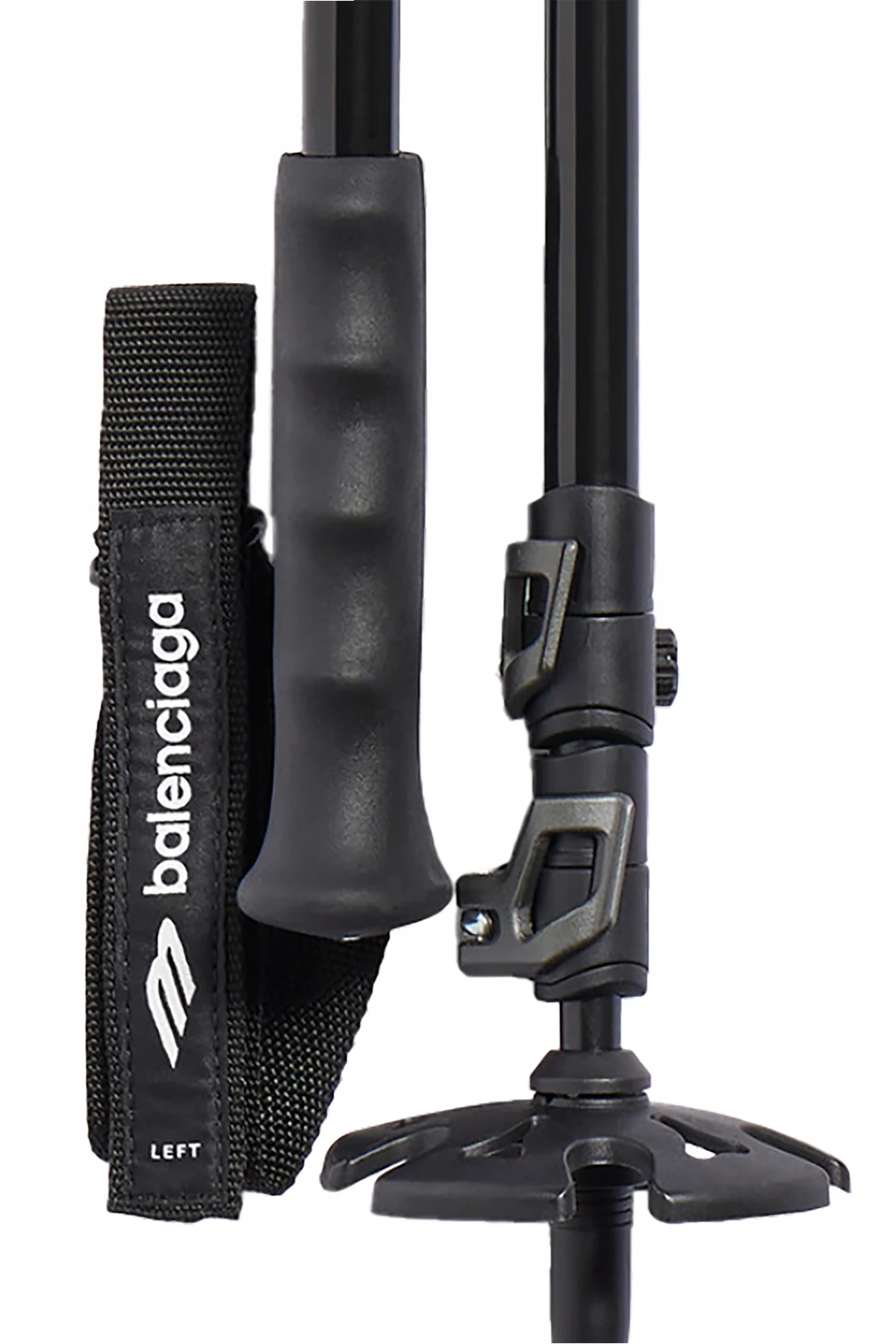 Introducing the quintessence of outdoor exploration, the Balenciaga Extendable Hiking Poles. Meticulously crafted for the enthusiast who does not compromise on style or functionality, these poles are a harmonious blend of innovative design and practicality. Constructed from a robust aluminum core, complemented by accents of nylon and rubber for grip and durability, these poles promise longevity and comfort. The presence of an adjustable segment feature with a secure clip-locking system ensures a customizable fit, catering to the individual\'s height and the terrain\'s demands. Additionally, the inclusion of sharpened tips and stabilizing plates at the base enhances traction on diverse landscapes, from the rugged trails of mountains to the soft surfaces of forest paths. Embodying Balenciaga\'s iconic aesthetic, the poles are adorned with the brand\'s logo in a striking white against the sleek black background, making a bold statement of luxury. The ergonomic handles with wrist straps feature the logo for a cohesive look, offering comfort and safety during prolonged use. Why Purchase These Hiking Poles? Expertly designed by Balenciaga, merging fashion with outdoor utility. Made from high-quality aluminum, ensuring durability and lightness. Adjustable length and secure locking for tailored use and convenience. Enhanced grip and stability with specialized tips and plates for all terrains. Elegant design with visible branding, standing out in functionality and style.