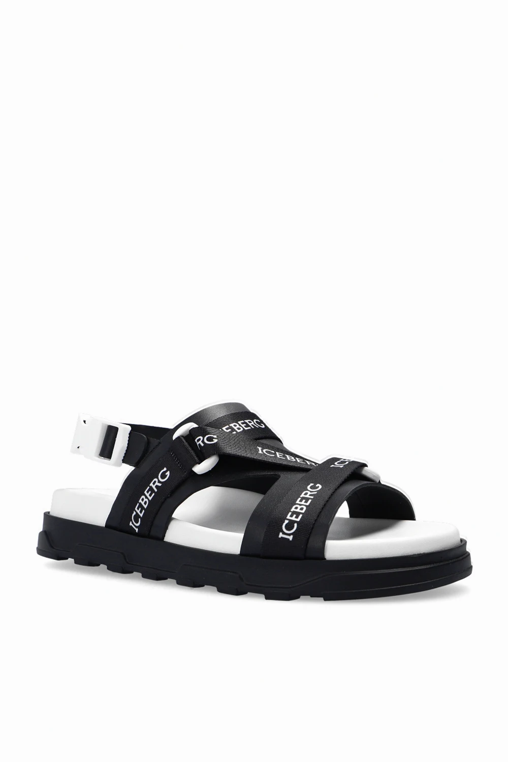 Black and white sandals from Iceberg. Crafted from leather, this design features a logo pattern, buckle belt and black rubber sole.