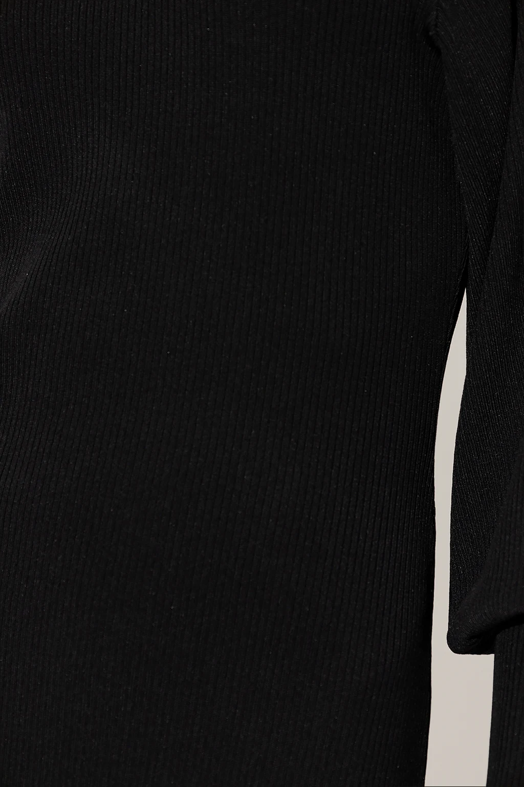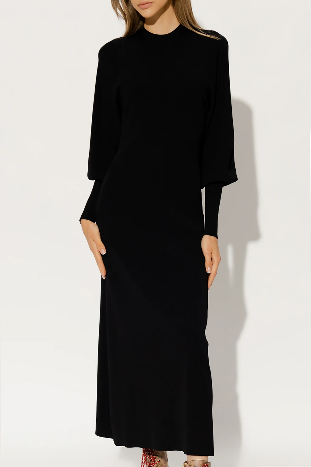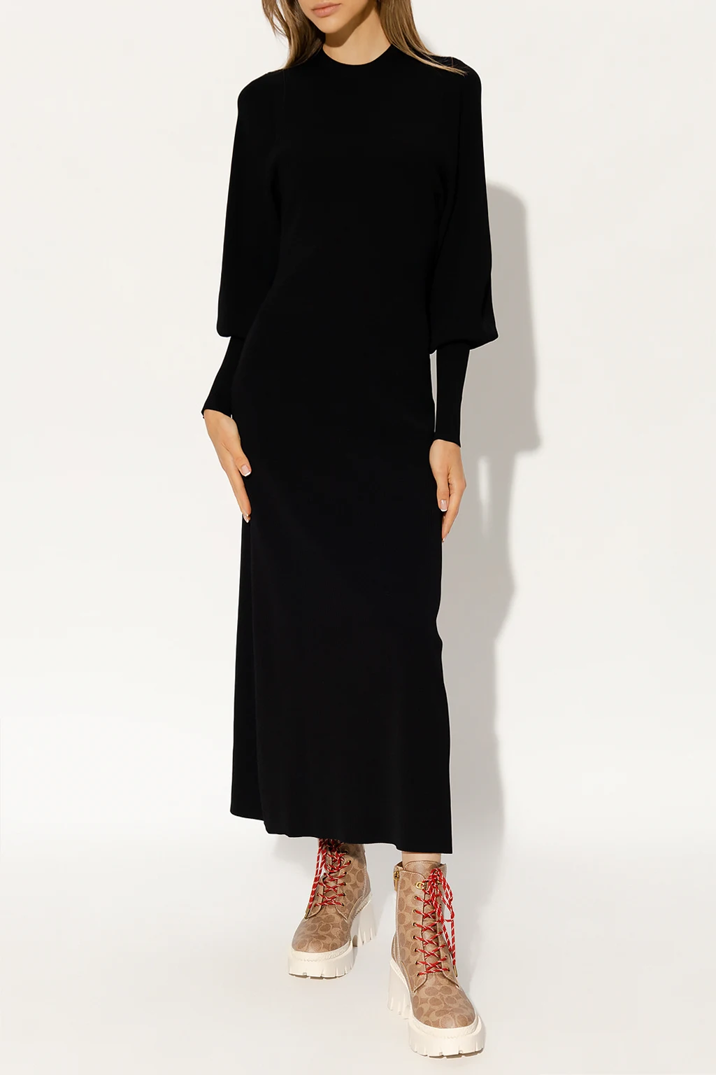 Black ‘MonaGZ’ dress from Gestuz. Crafted from a ribbed knit with a form-fitting silhouette, this style features a mid-calf length, long puff sleeves with elasticated cuffs and a denuded back with a distinctive tie detail.