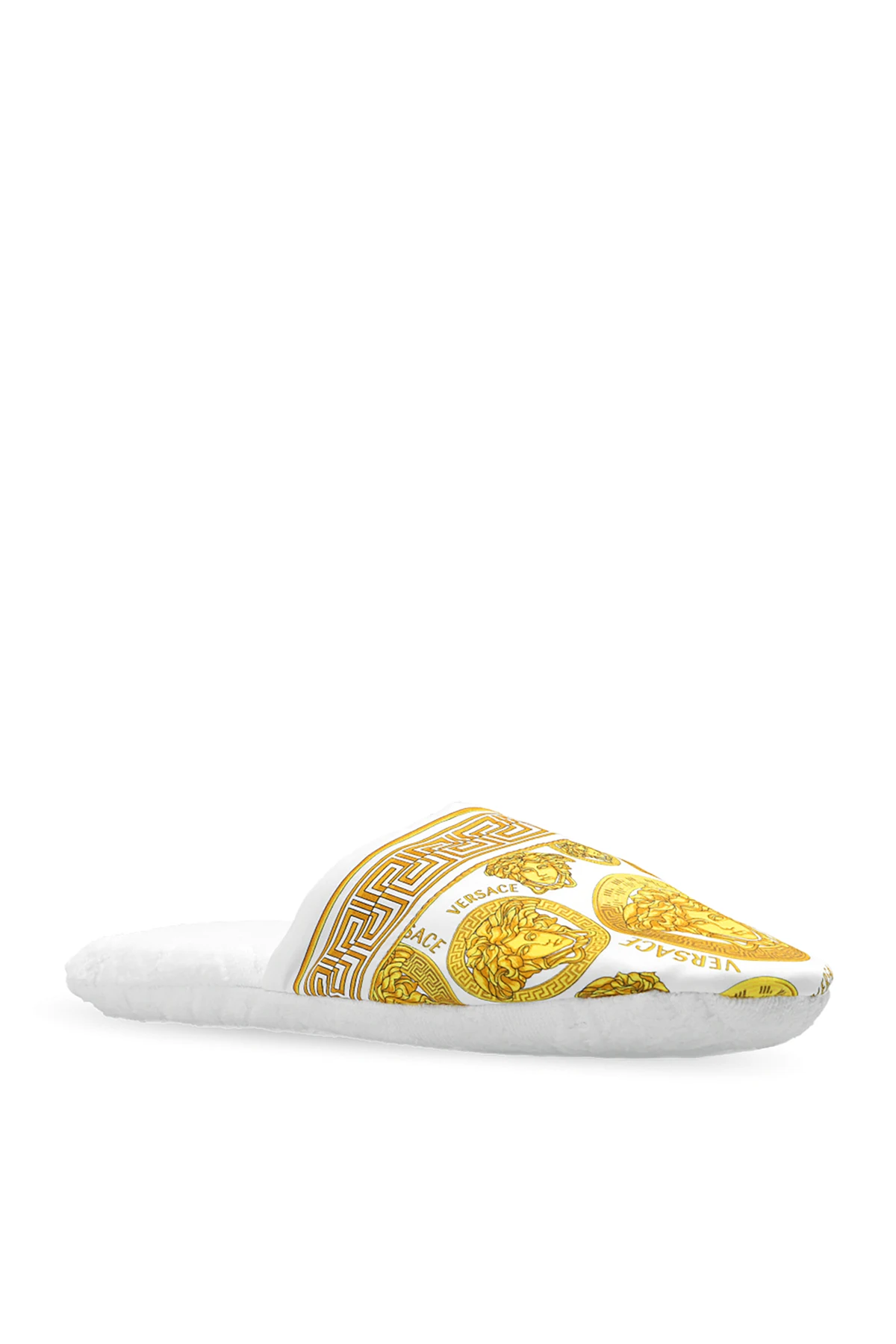 White slides from Versace Home. Crafted from cotton, this pair features the label’s signature Medusa Amplified print in yellow and brown.