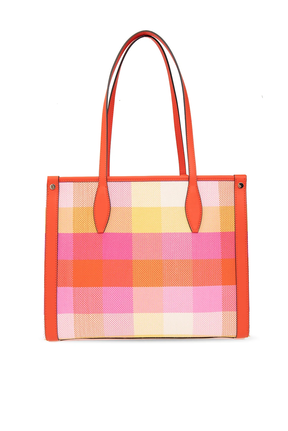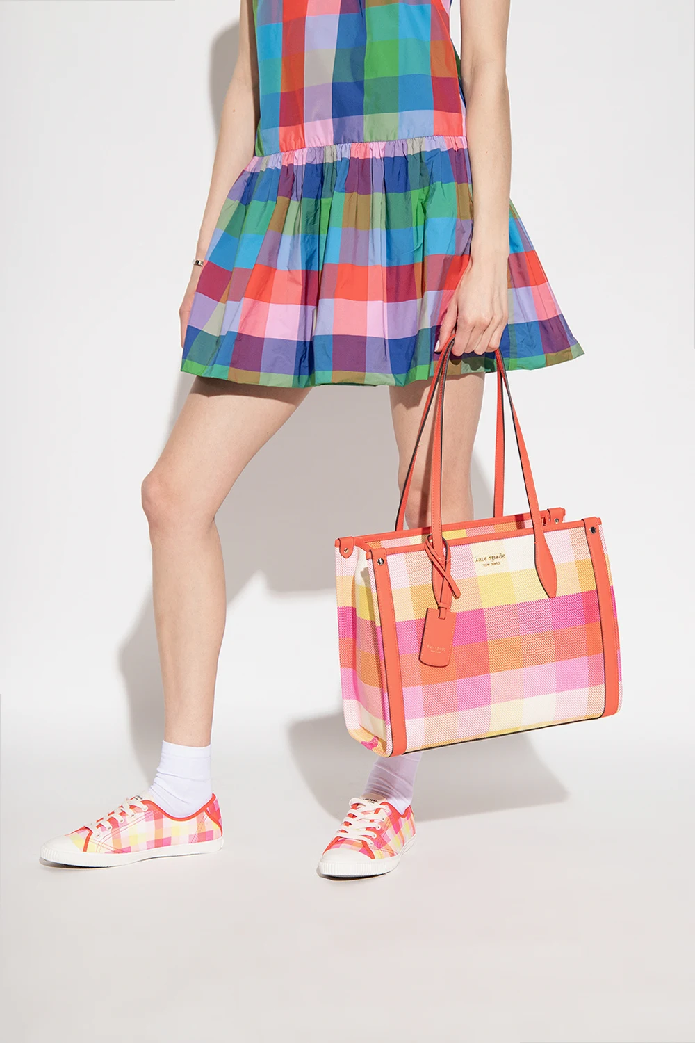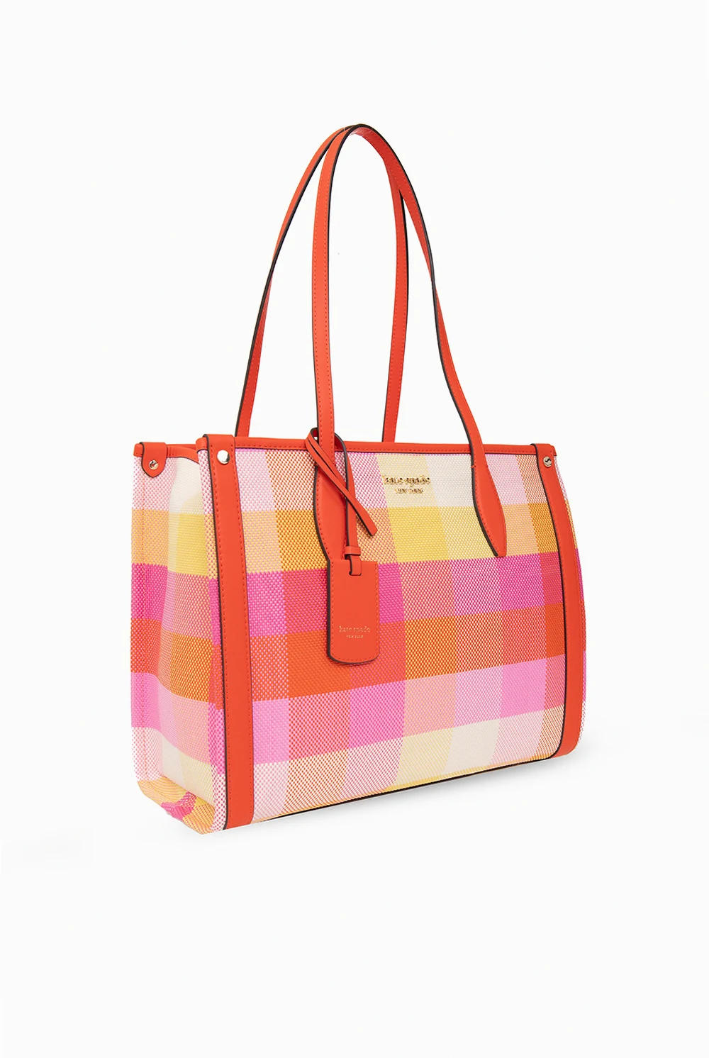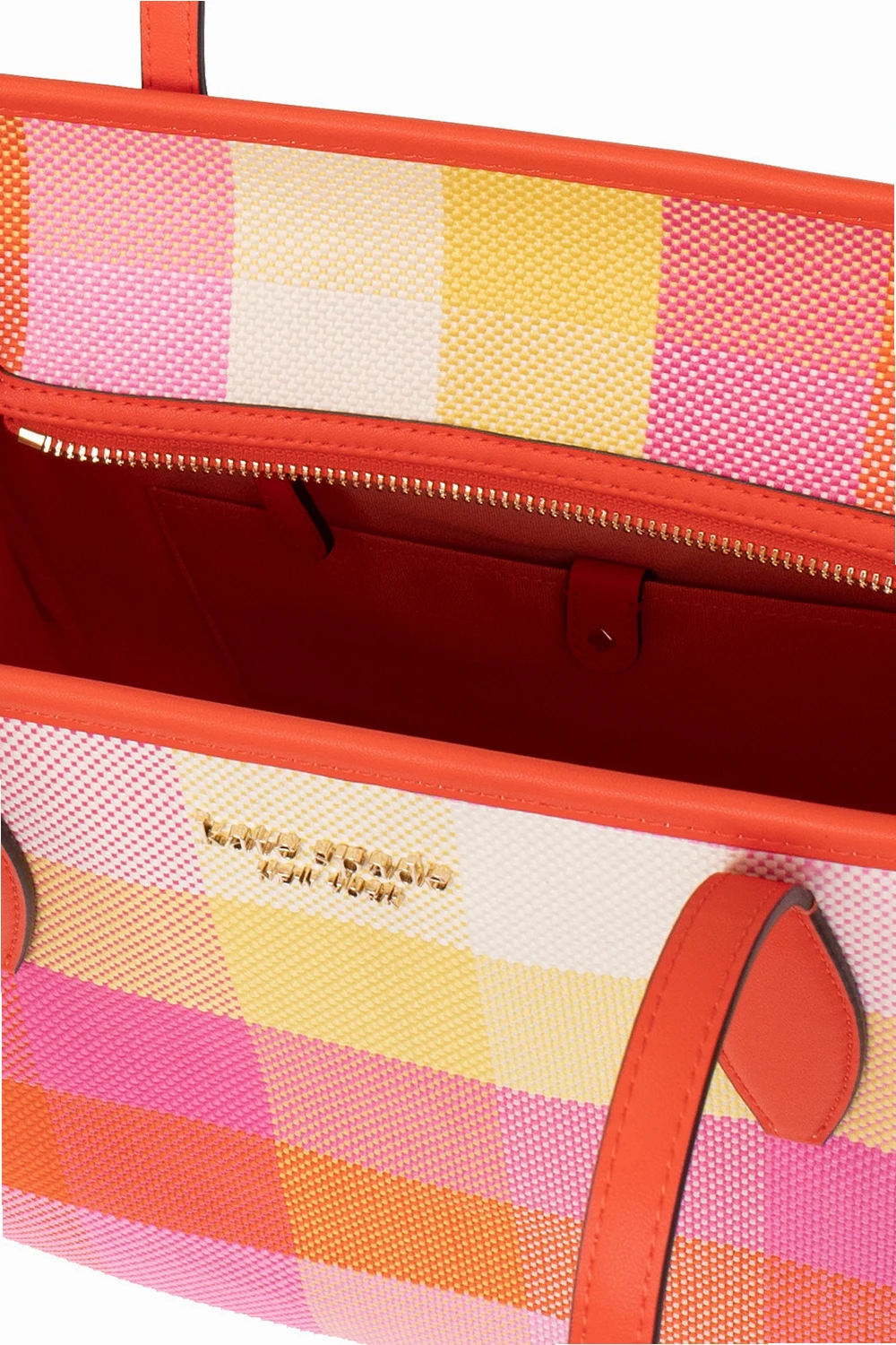 Multicoloured ‘Manhattan Medium’ shopper bag from Kate Spade. Embellished with a check pattern, this design features a zip fastening, a metal logo plaque accompanied by a detachable red logo pendant on the front, two half-round handles, light gold-tone metal hardware and one internal compartment with one zip pocket, one slip pocket and one snap-fastened pocket.