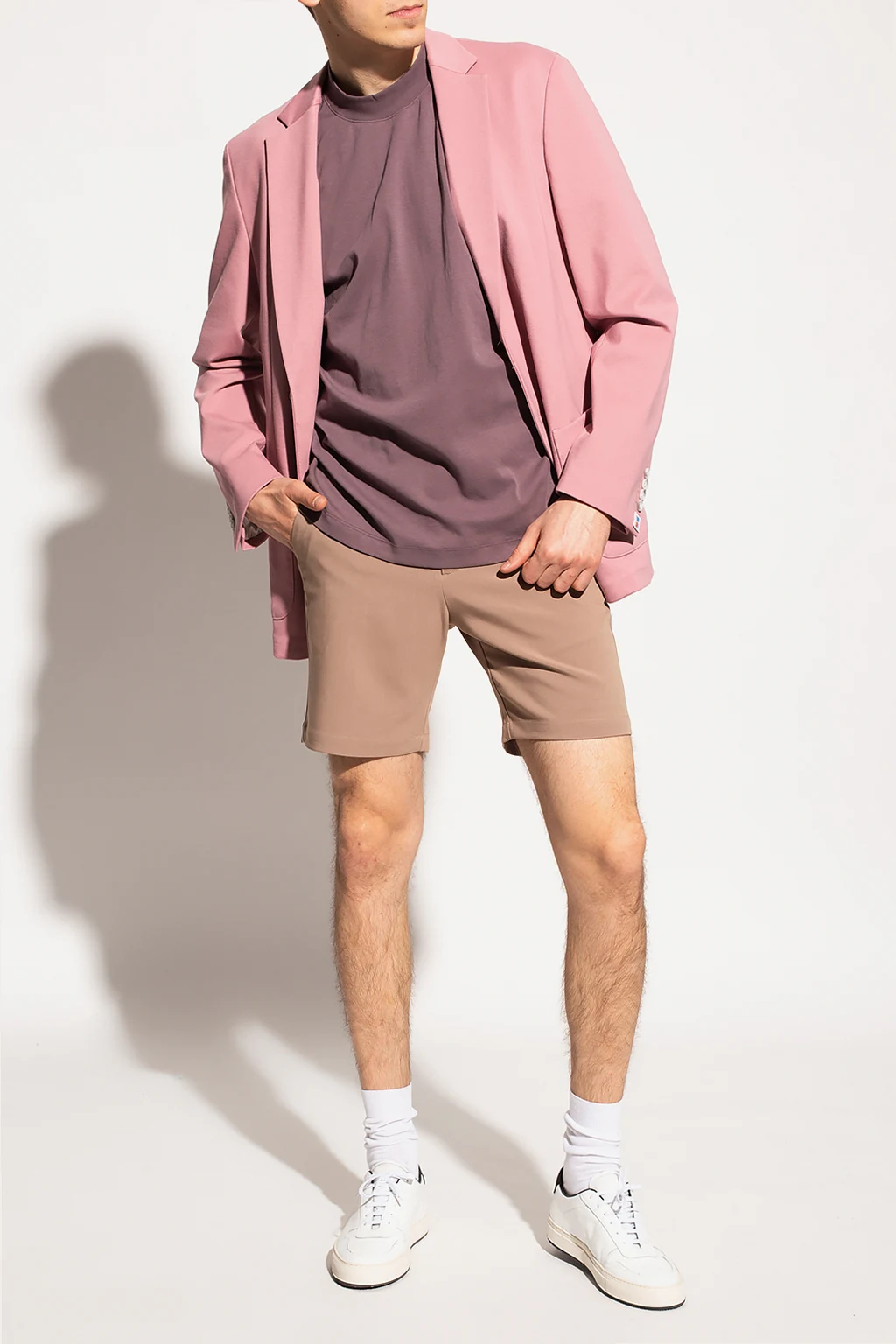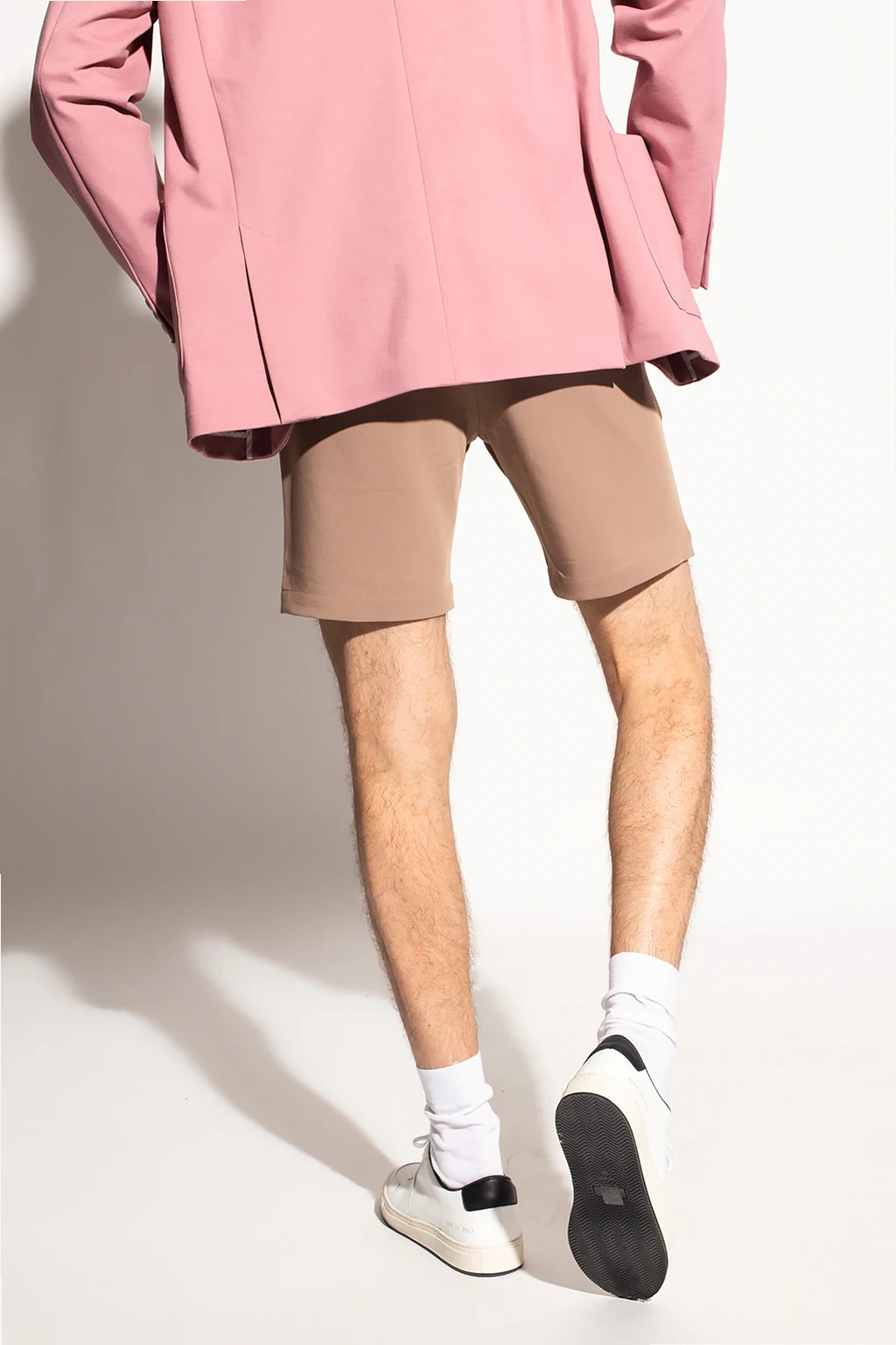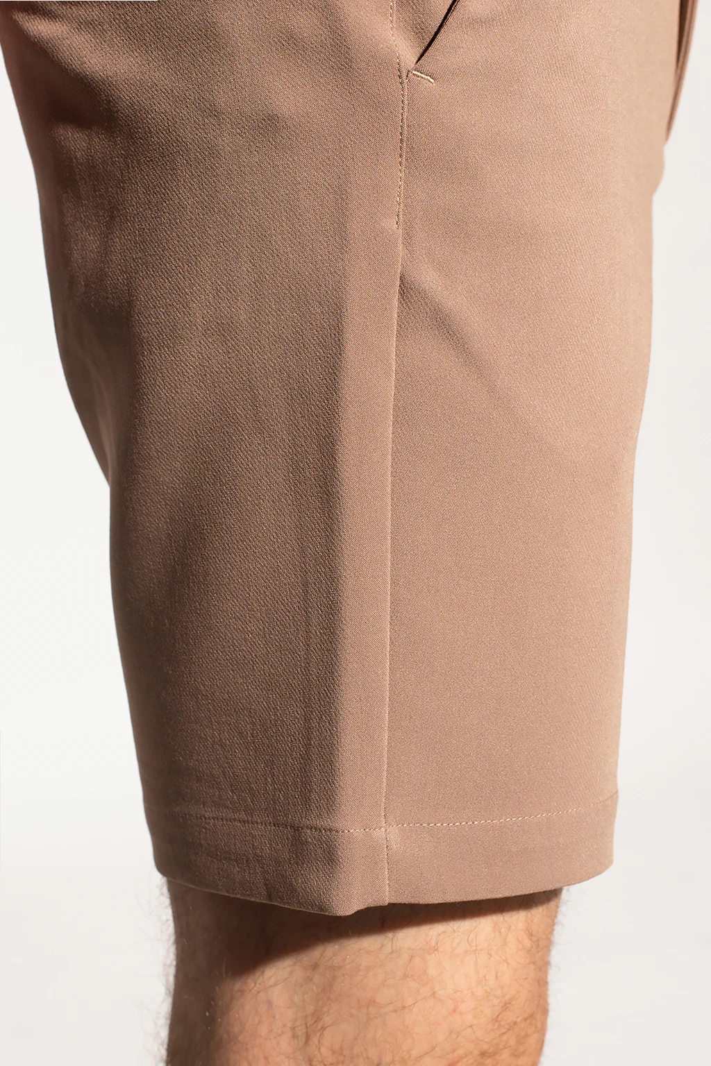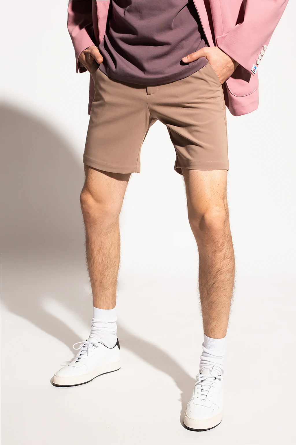 Beige pleat-front shorts from Samsoe Samsoe. Crafted from cotton, this design features a zip fly, button and hook, two front pockets and two buttoned back pockets.