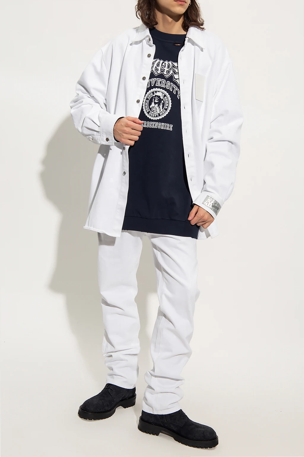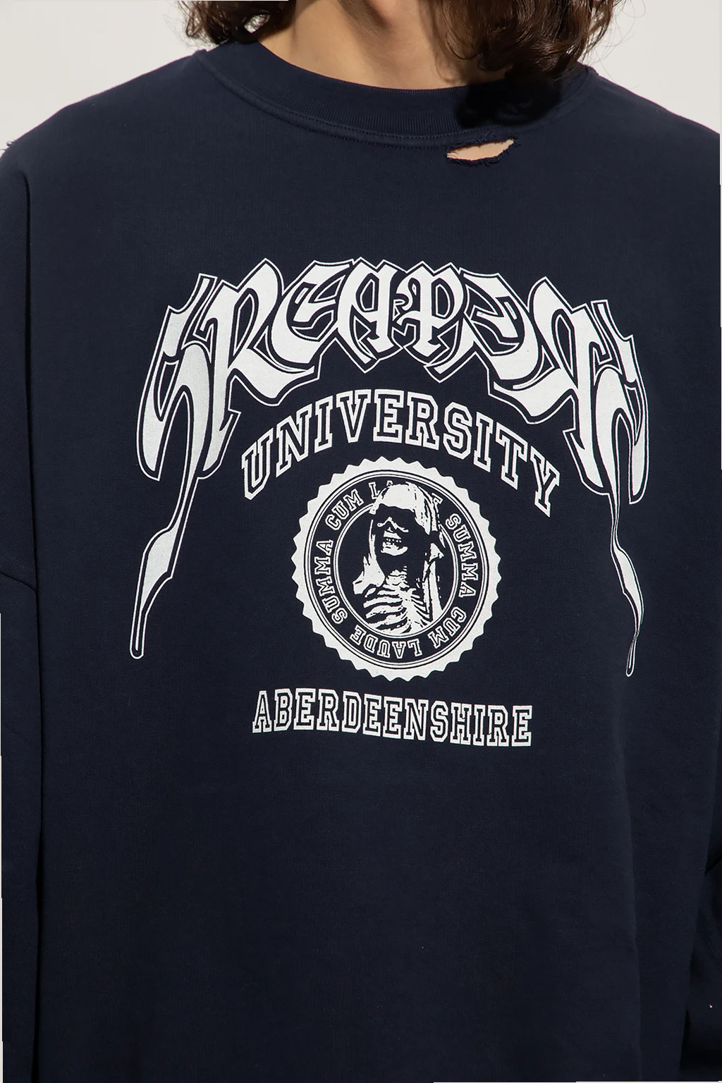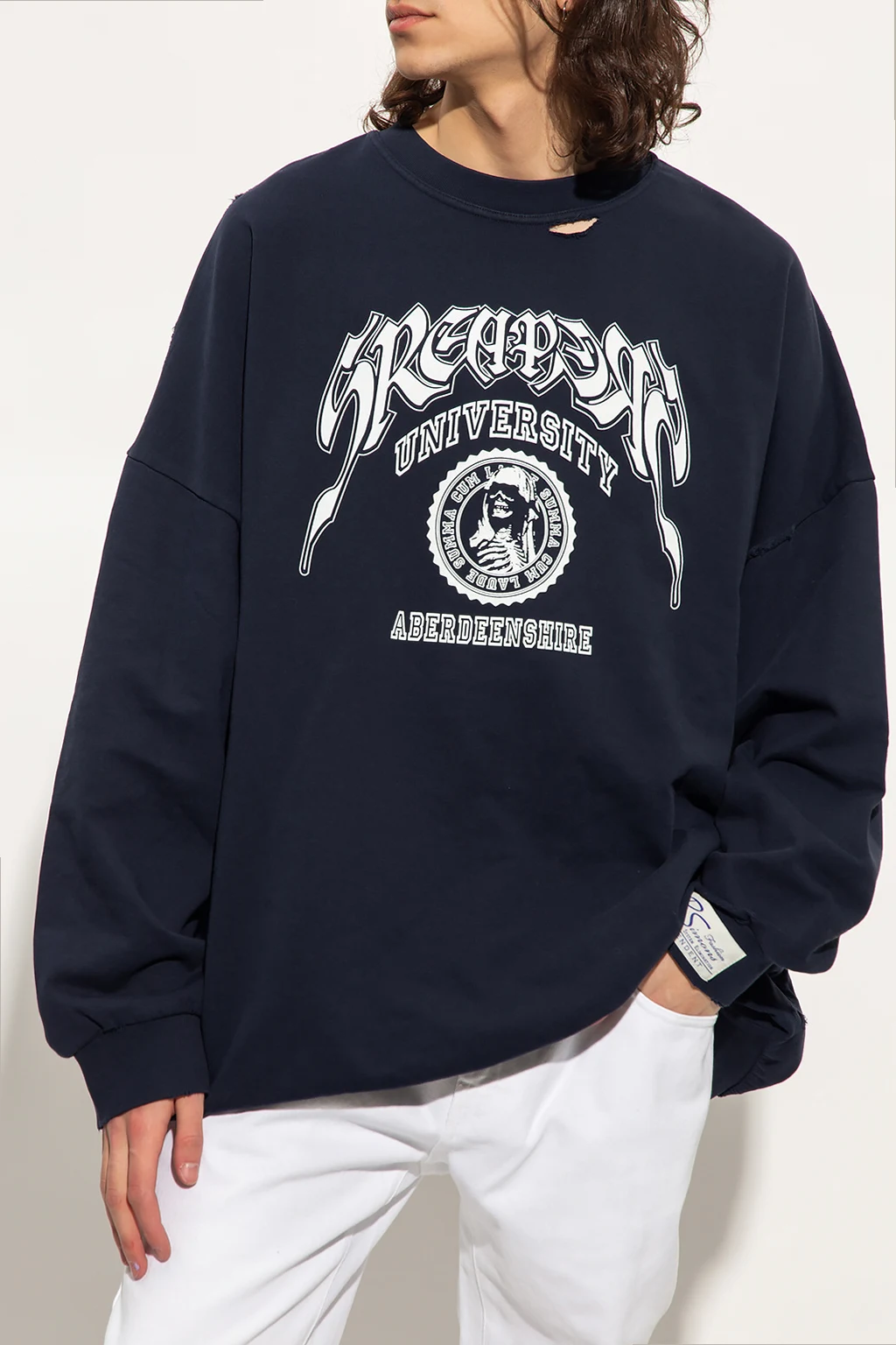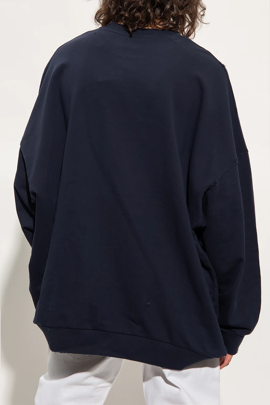 Navy distressed sweatshirt from Raf Simons. Made of cotton, this oversize design features a print and logo in white as well as ribbed trims at the round neck, hem and cuffs.