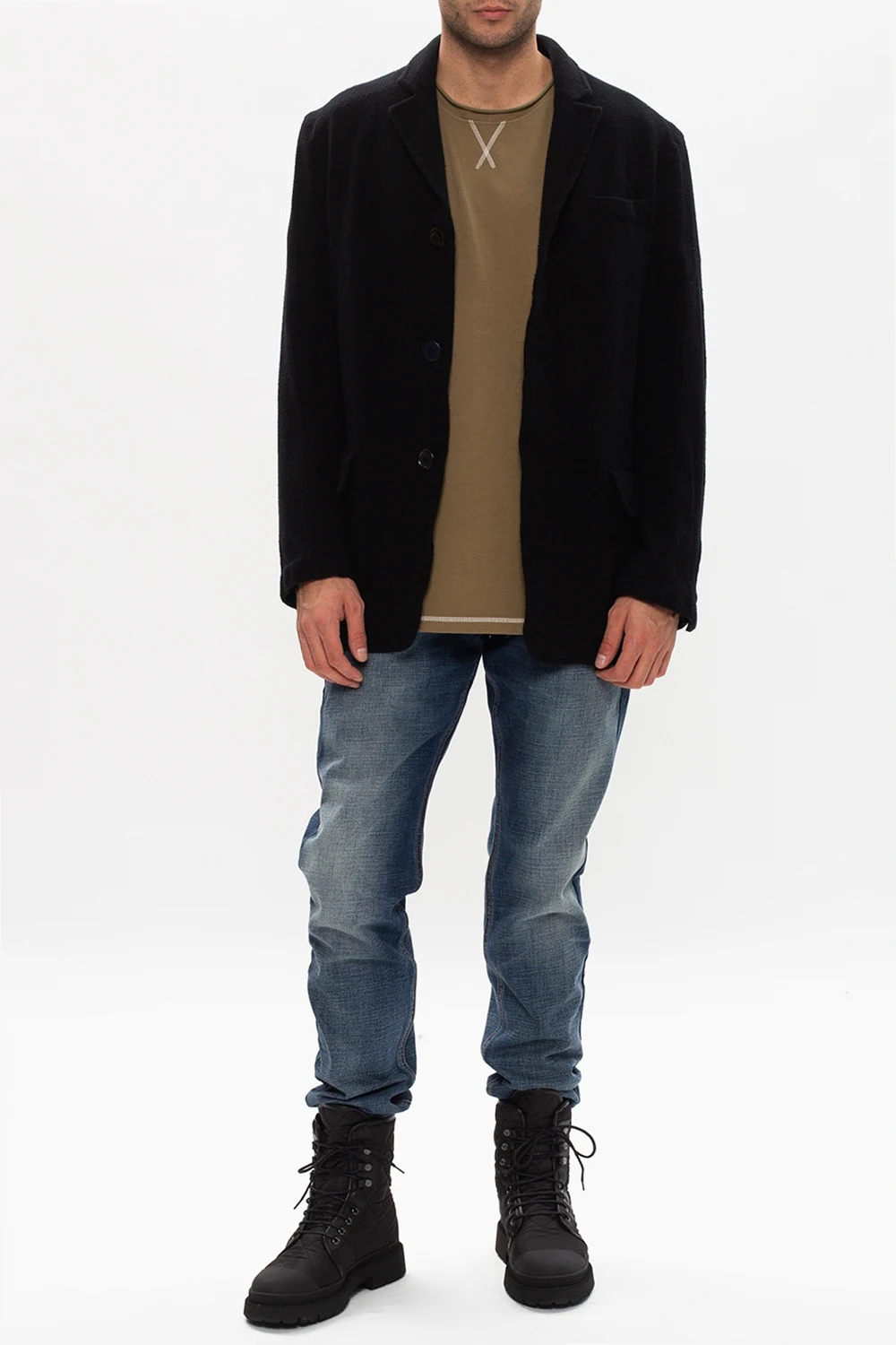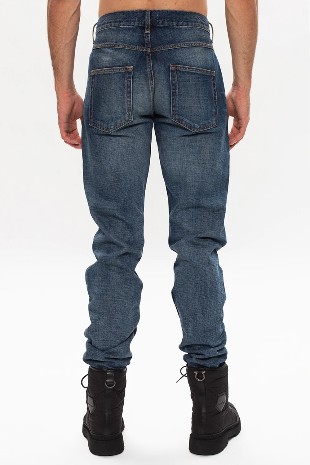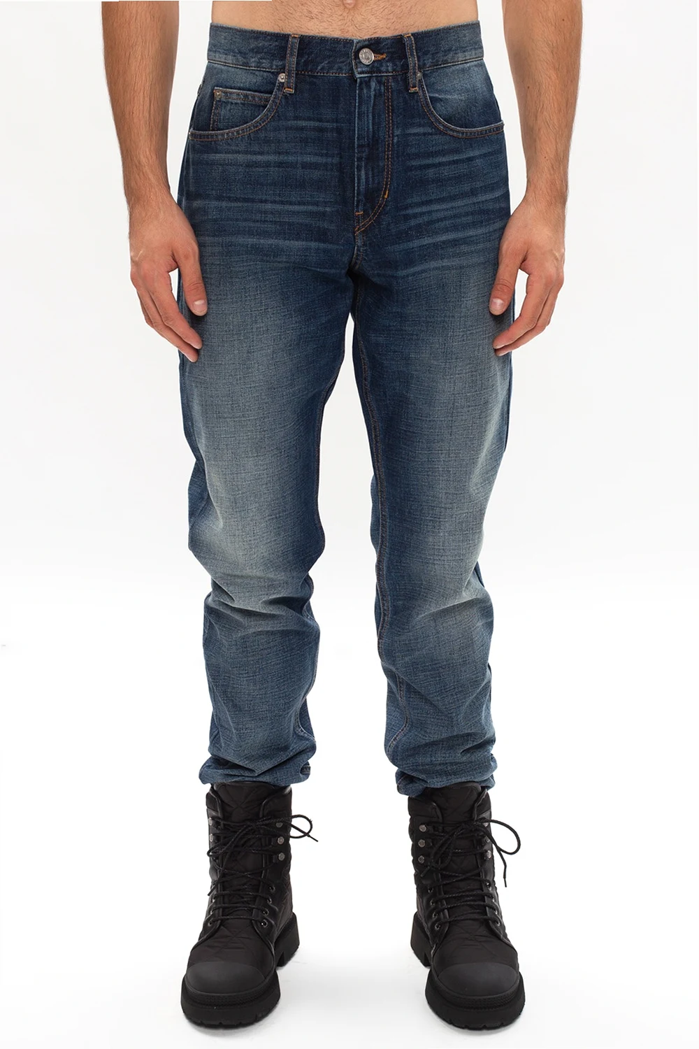 Dark blue jeans with a worn effect from Isabel Marant. Fastened with a zip and button, this tapered leg design features orange stitching details, three front pockets and two back pockets.