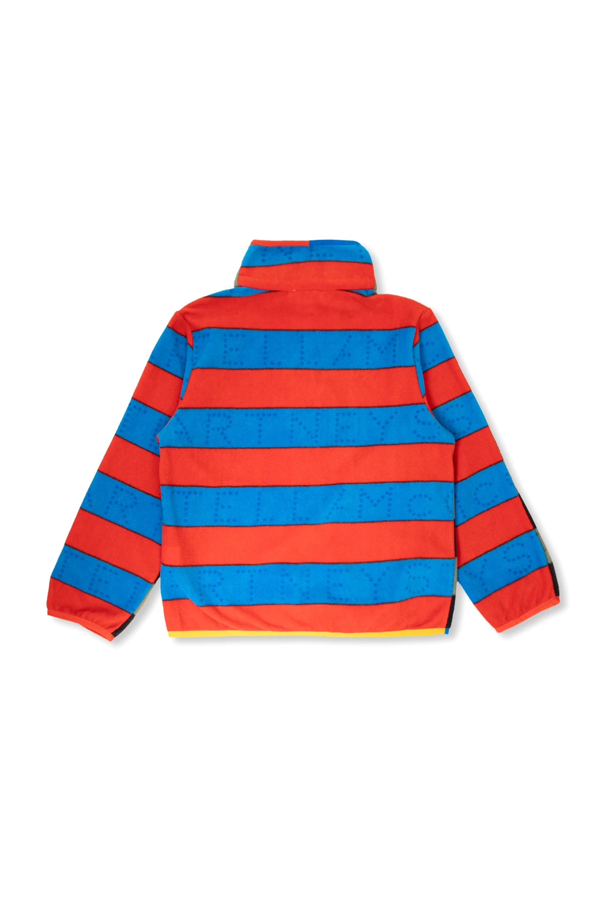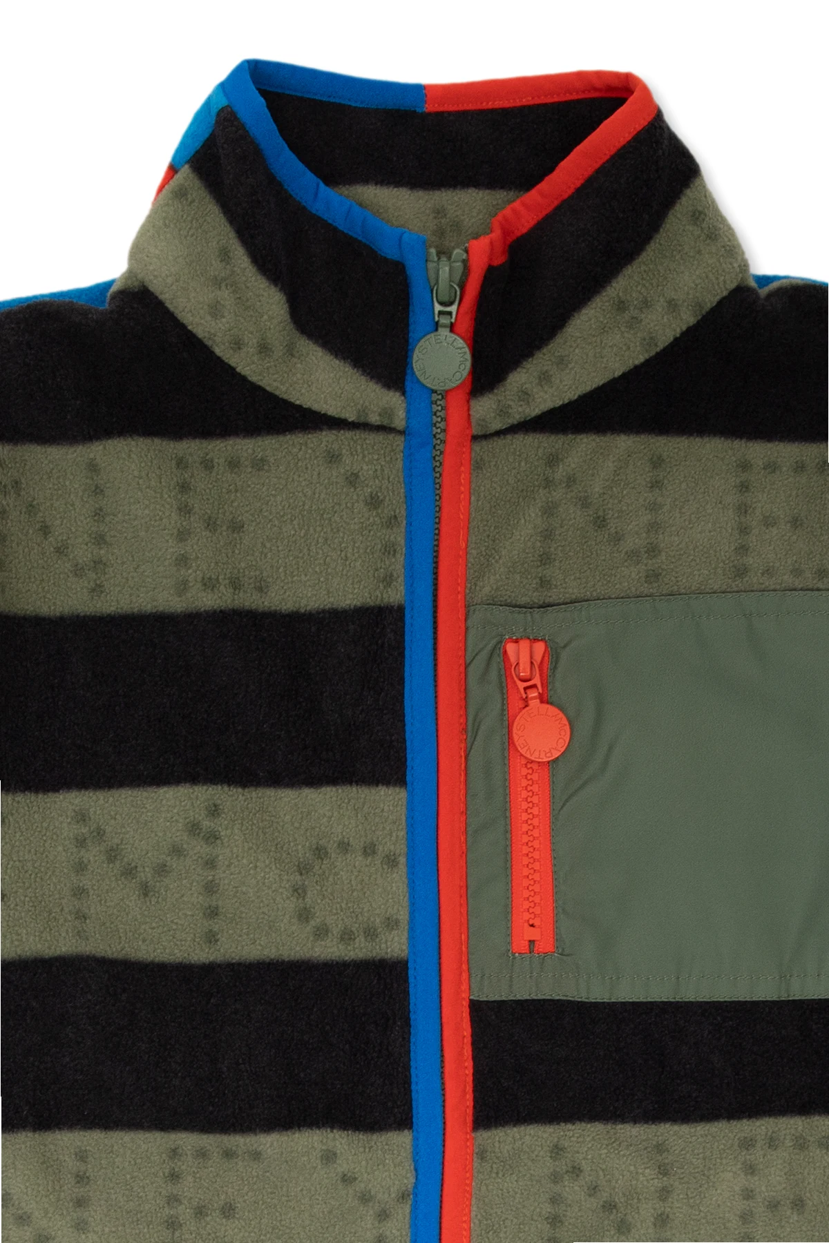 Green and black fleece sweatshirt with a stand collar from Stella McCartney Kids. Fastened with a zip, this design features a decorative pattern, two slip pockets, one zip pocket and trimming in red and blue.