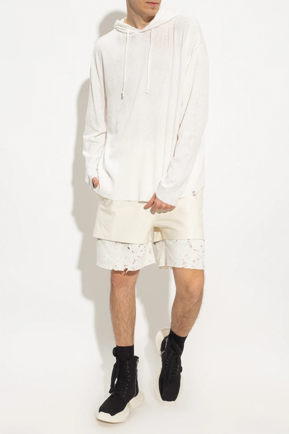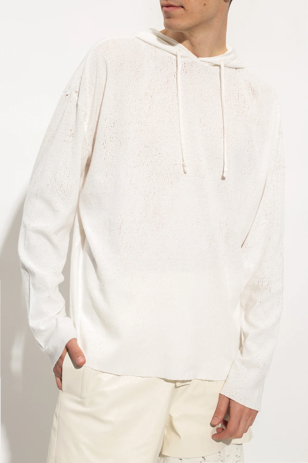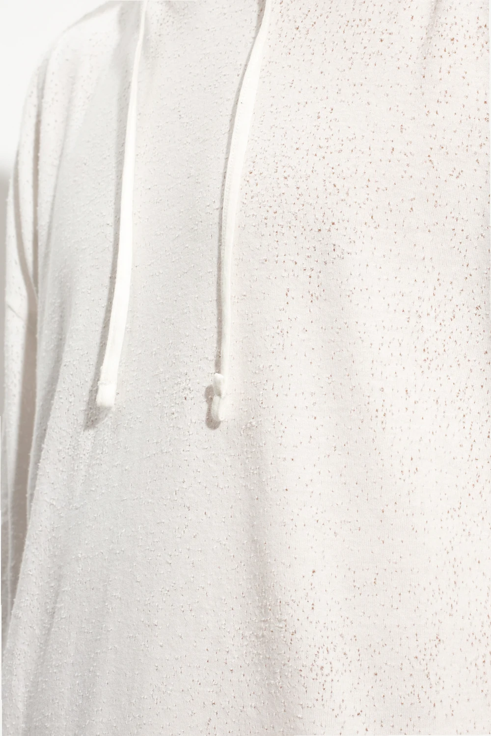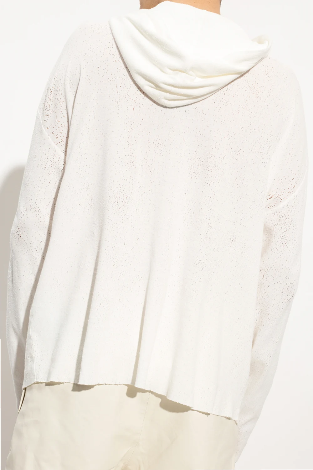 White hooded T-shirt from 1017 ALYX 9SM. Made of textured cotton with vintage effect, the label’s signature metal Lightercap appliqué in silver-tone as well as raw cut edges at the hem and cuffs.