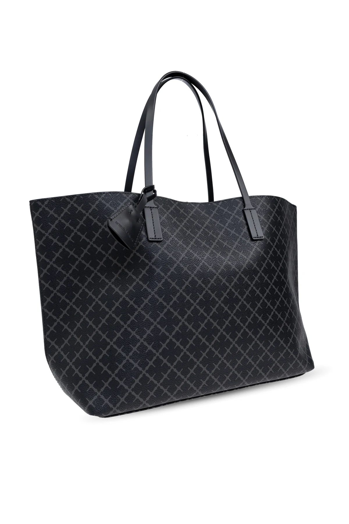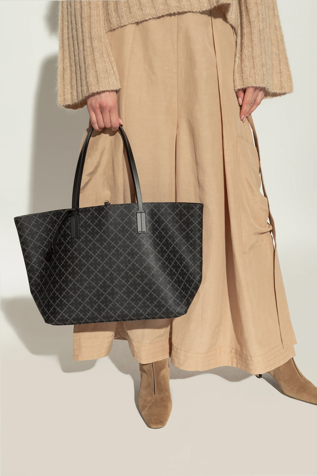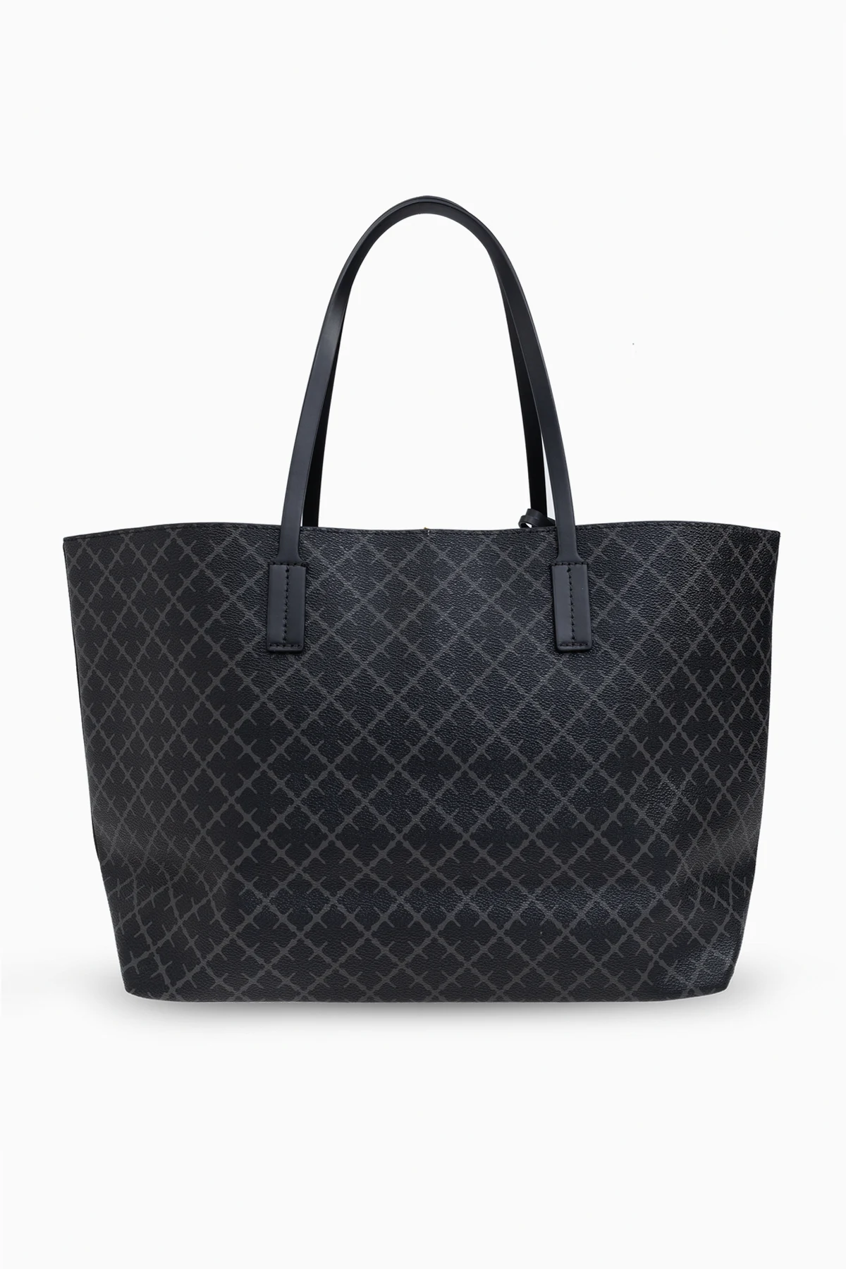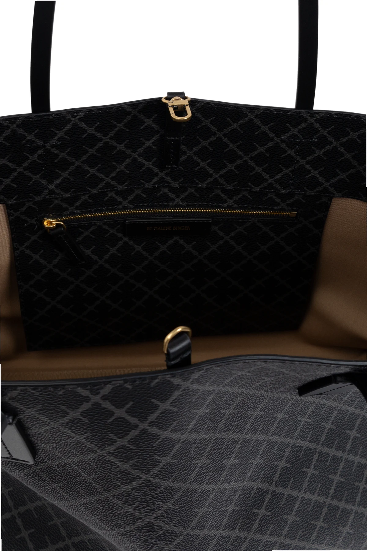 Introducing the \"Abigail\" Shopper Bag by By Malene Birger, an epitome of sophisticated functionality and modern aesthetics. This exquisite piece is crafted from top-tier synthetic leather, exhibiting a sleek and slightly luminous finish that promises durability and elegance. Its dominant black hue is complemented by a distinctive geometric pattern, characteristic of the brand\'s unique design ethos, rendering the \"Abigail\" not just an accessory, but a statement. The bag\'s rectangular \"shopper\" silhouette is designed for the dynamic woman, offering ample space within its well-organized interior, featuring a zipped compartment and a slip pocket for effortless accessibility. The long, flat straps ensure a comfortable shoulder carry, making it an ideal companion for both work and leisure. Subtle yet striking details such as contrasting stitches, metallic elements, and the branded pendant at the handle, underscore its premium finish. The interior, revealed through the cleverly designed split, is lined in a contrasting color, enhancing the bag\'s visual appeal while simplifying the task of locating your essentials. The \"Abigail\" seamlessly blends practicality with the plushness, setting a new standard for the everyday luxury accessory. Why Purchase the \"Abigail\" Shopper Bag? Elegant design with functional interior organization. High-quality synthetic leather with a signature geometric pattern. Comfortable for daily use with sturdy shoulder straps. Detailed with premium finishes including contrasting stitching and metallic accents. Interior lining in a contrasting color for ease of finding items.