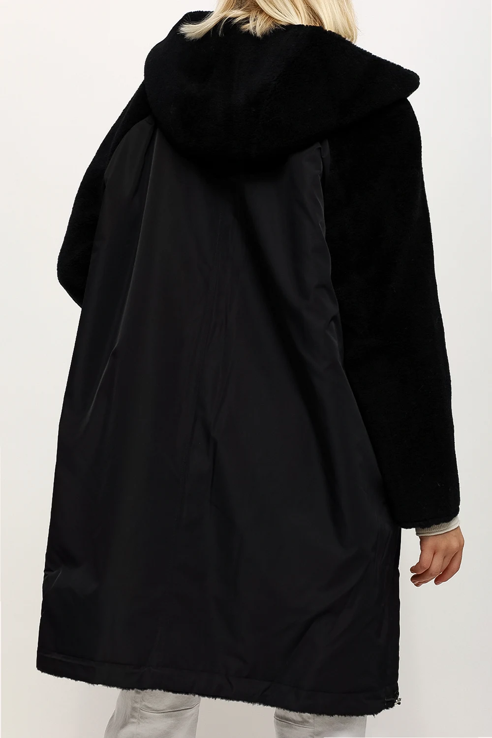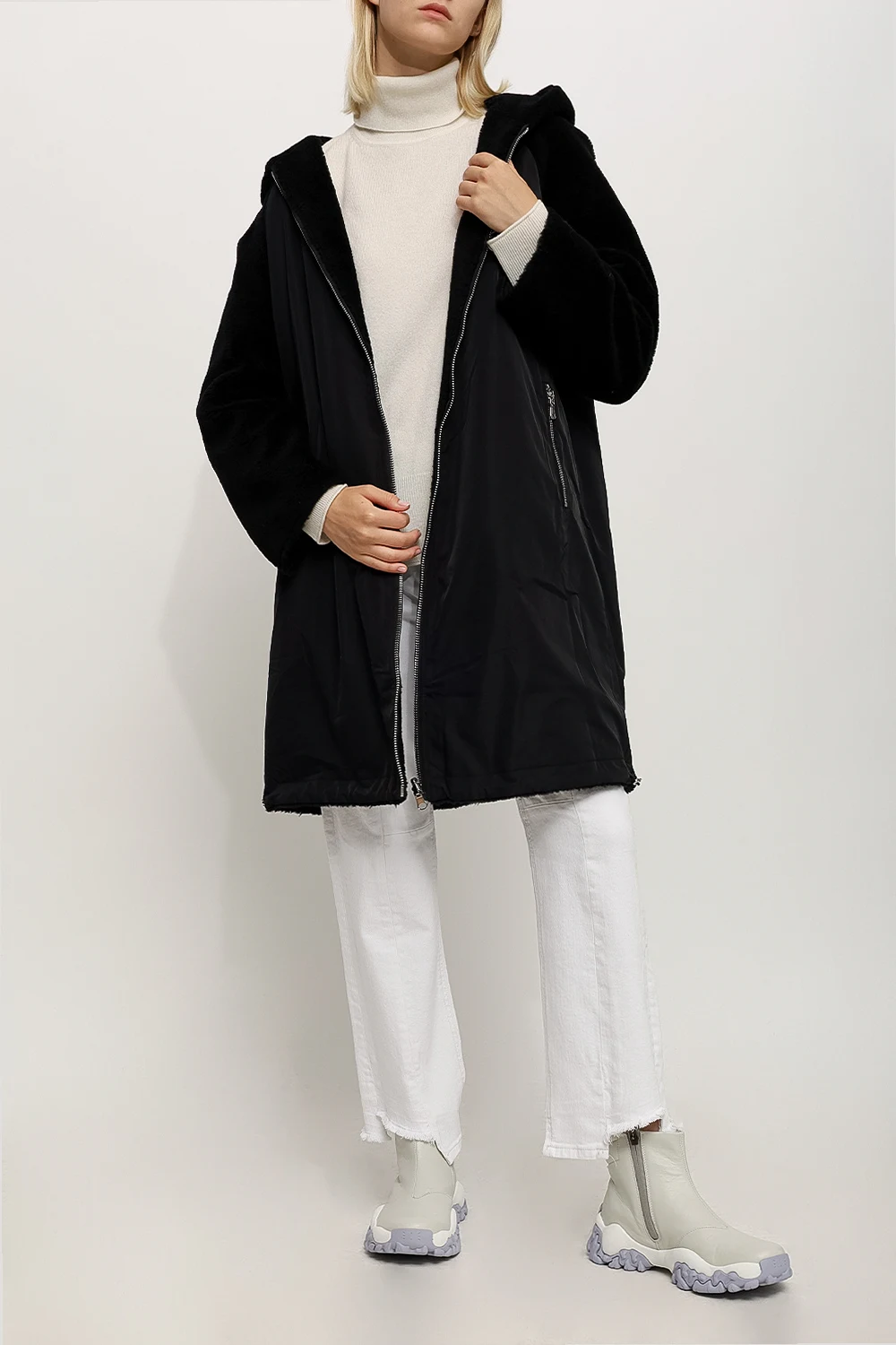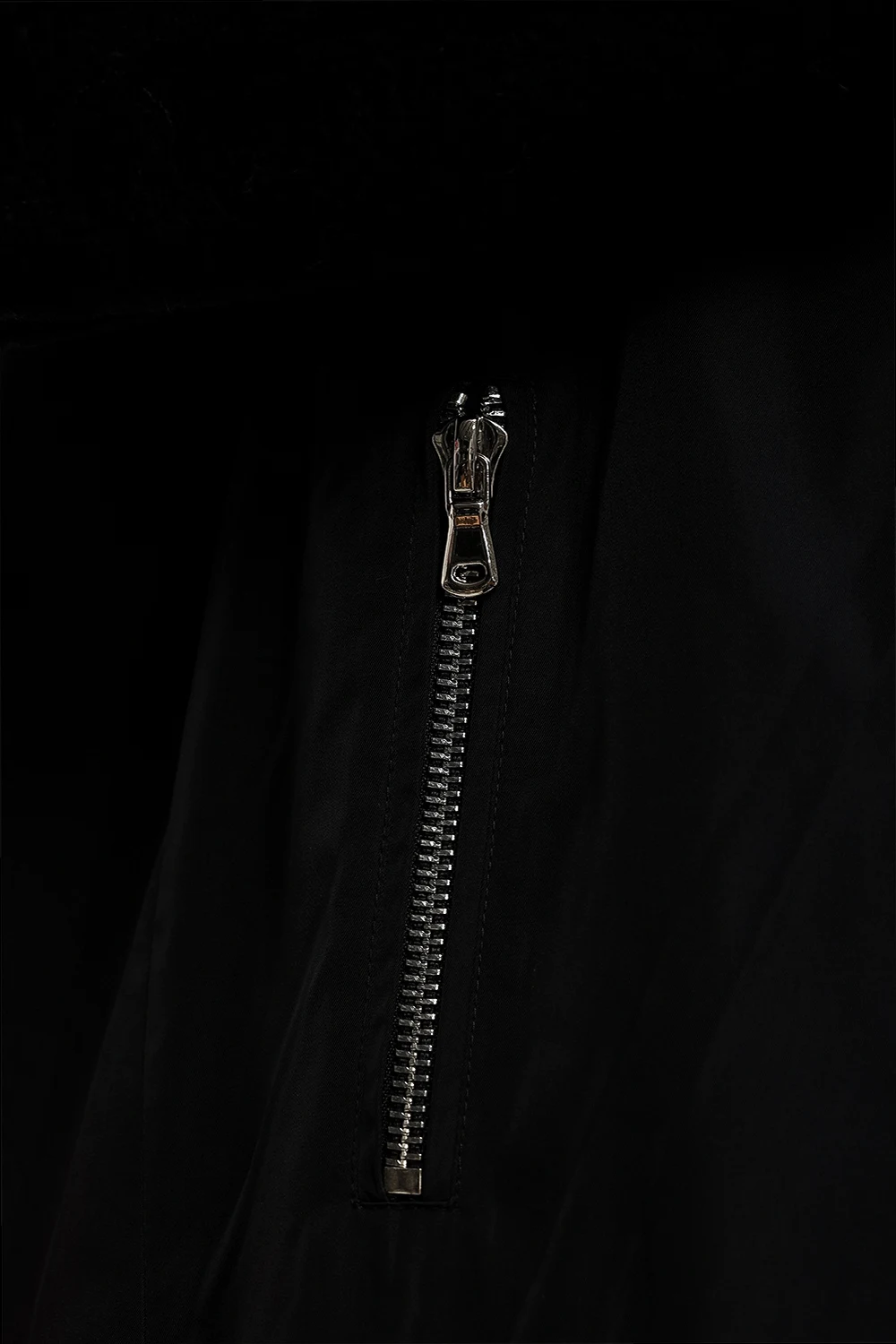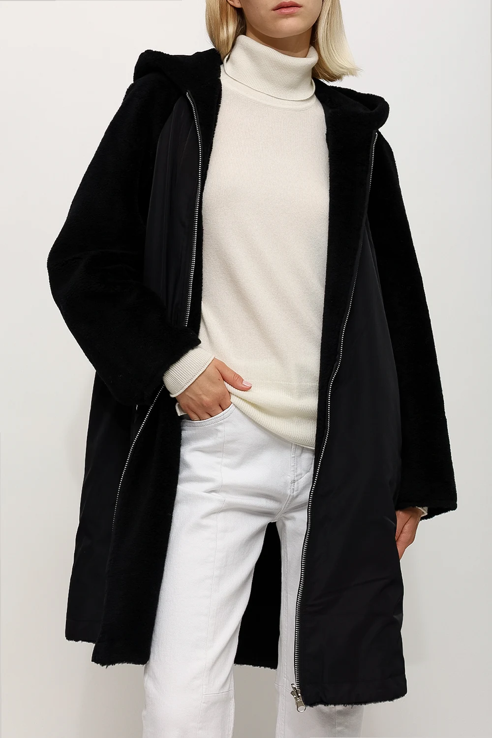Black reversible coat from Yves Salomon, the ‘Meteo’ line. Fastened with a silver-tone metal zip, this garment is complete with a drawstring hem and wool hood. One side has two zip pockets and wool-trimmed sleeves. The other side is entirely made of wool and features two slip pockets.
