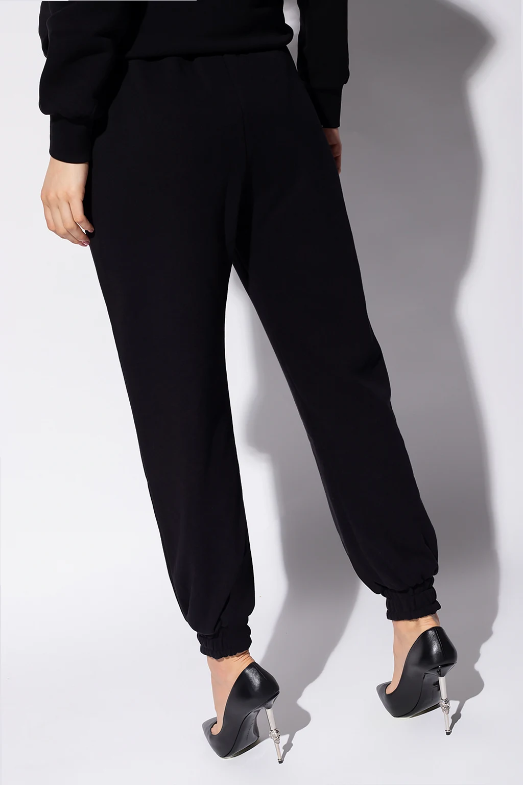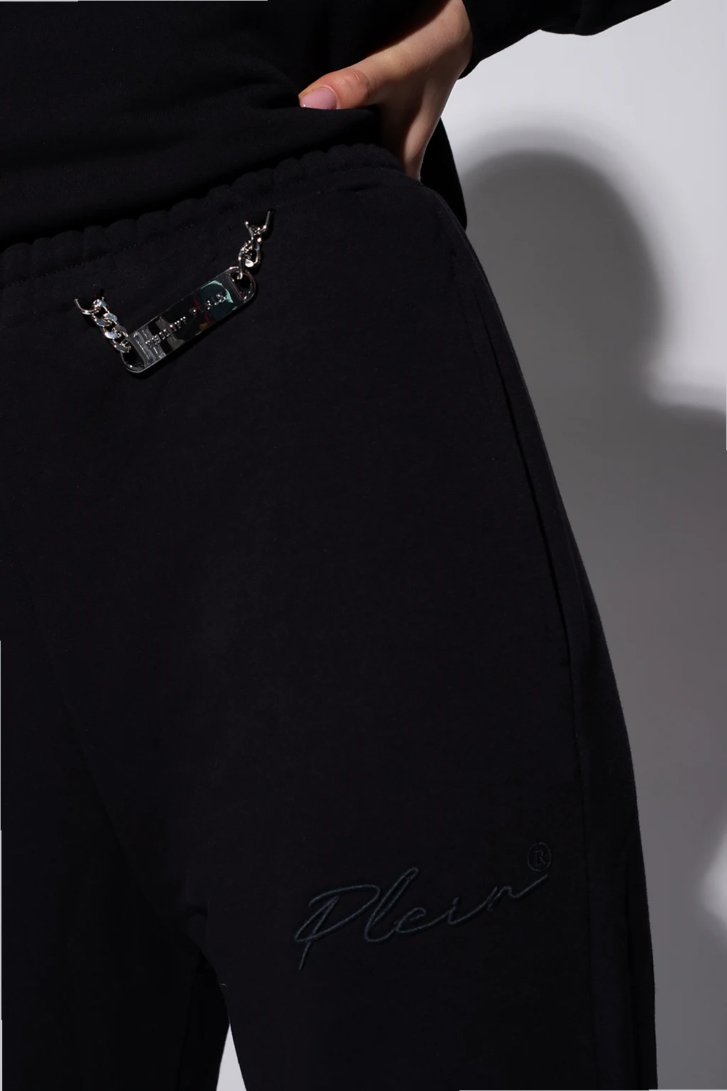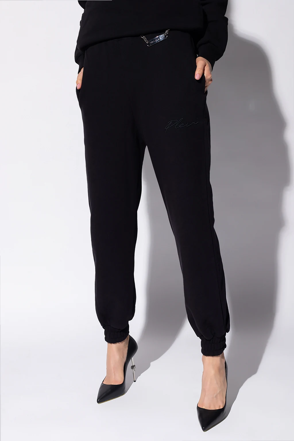 Black sweatpants from Philipp Plein. Made of cotton, this design features an elastic waistband, logo embroidery, metal appliqué with a chain in silver-tone, two slip pockets and ribbed cuffs.